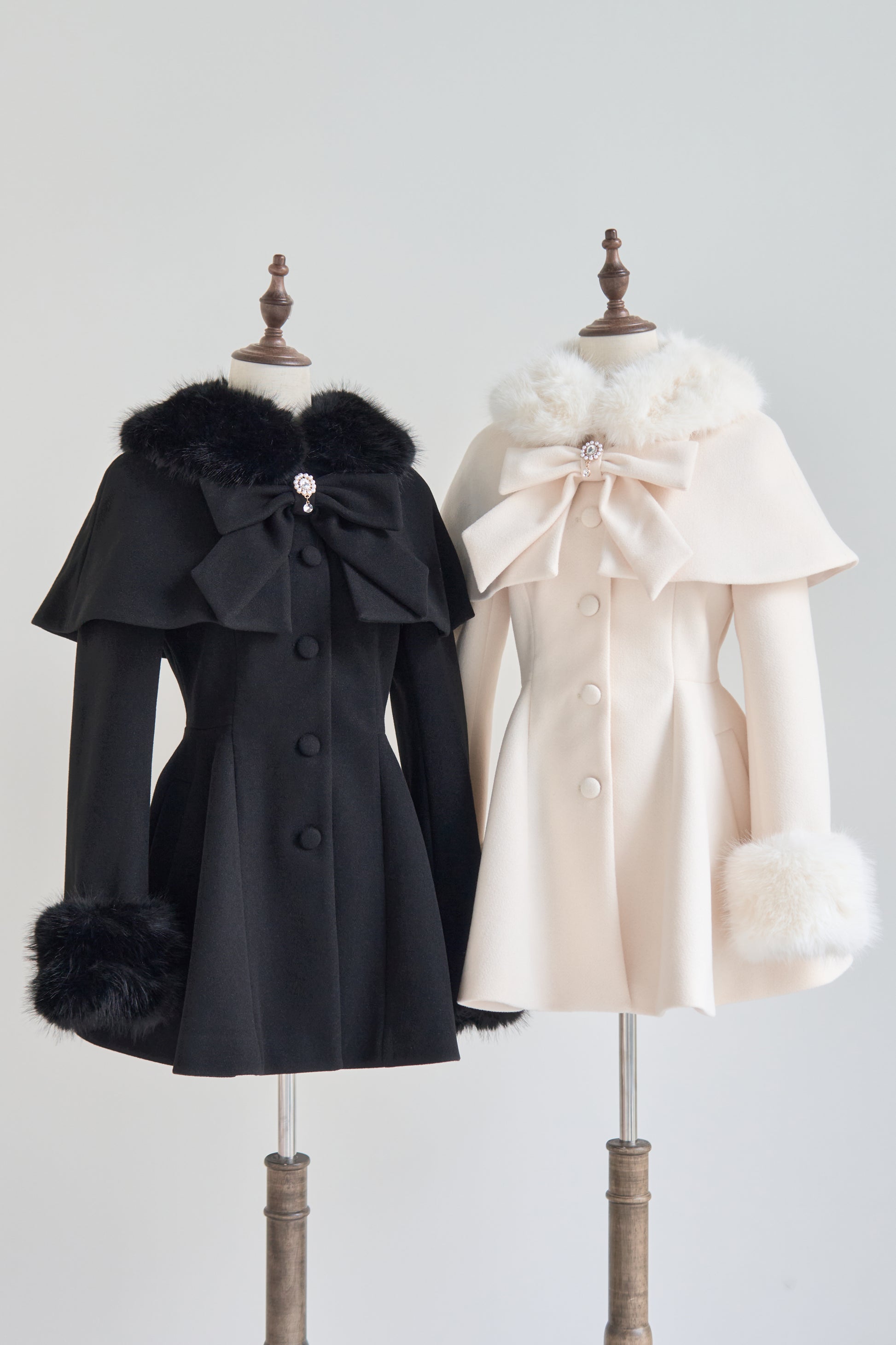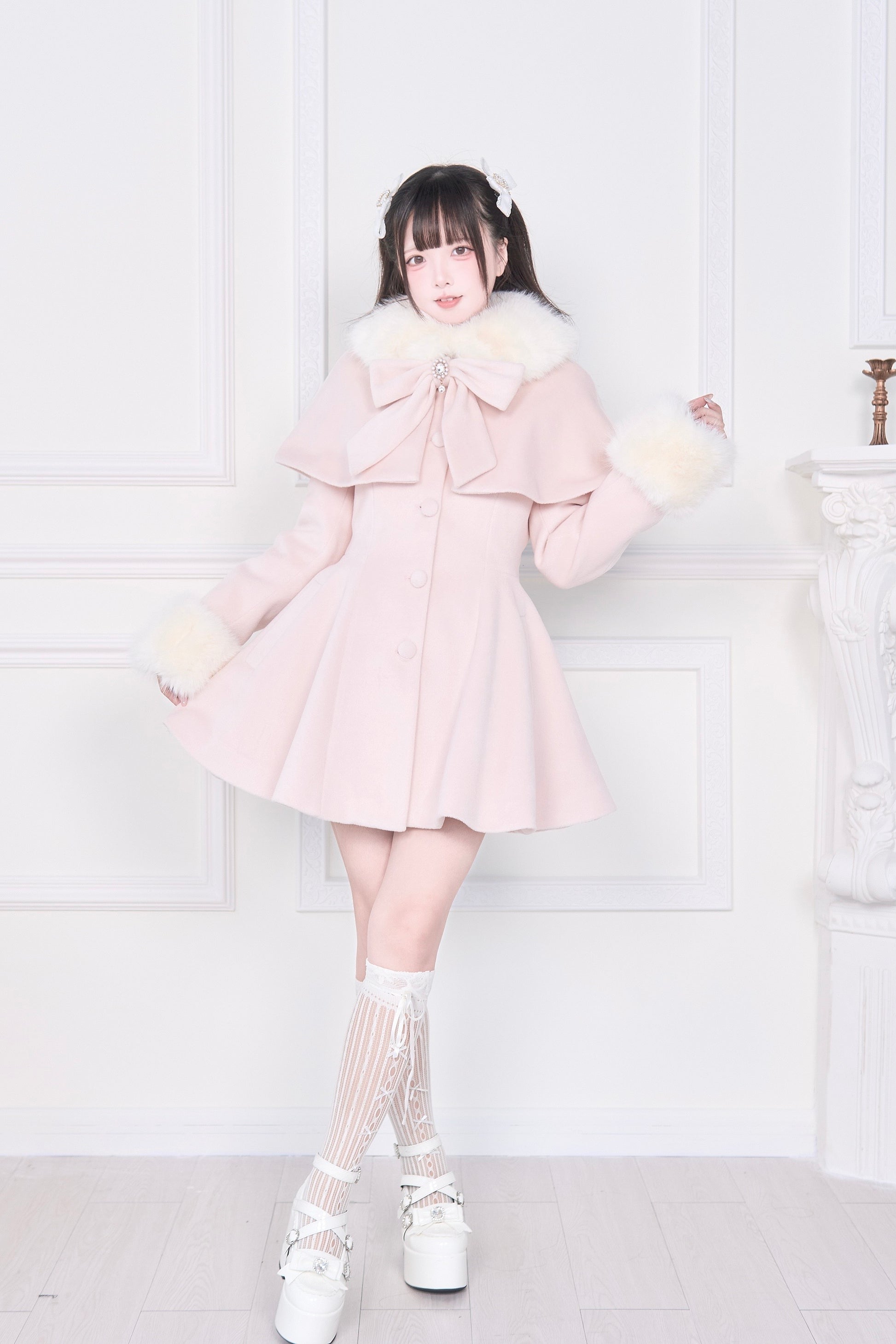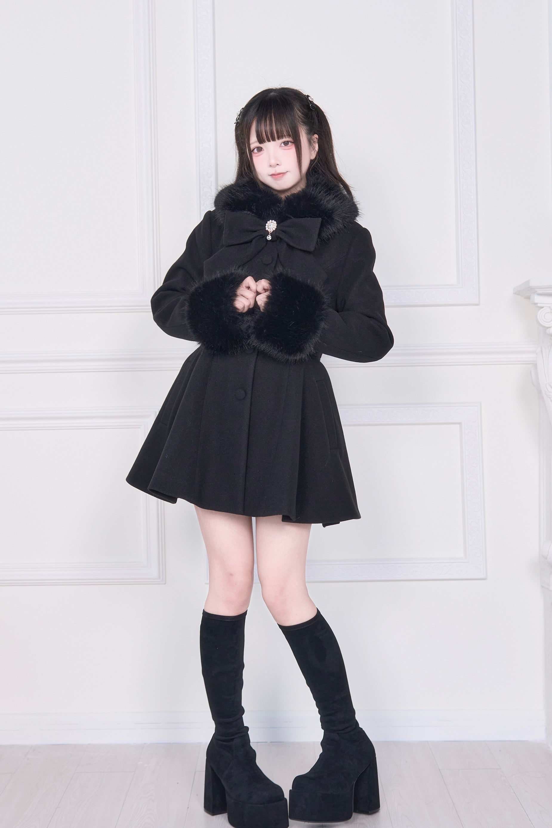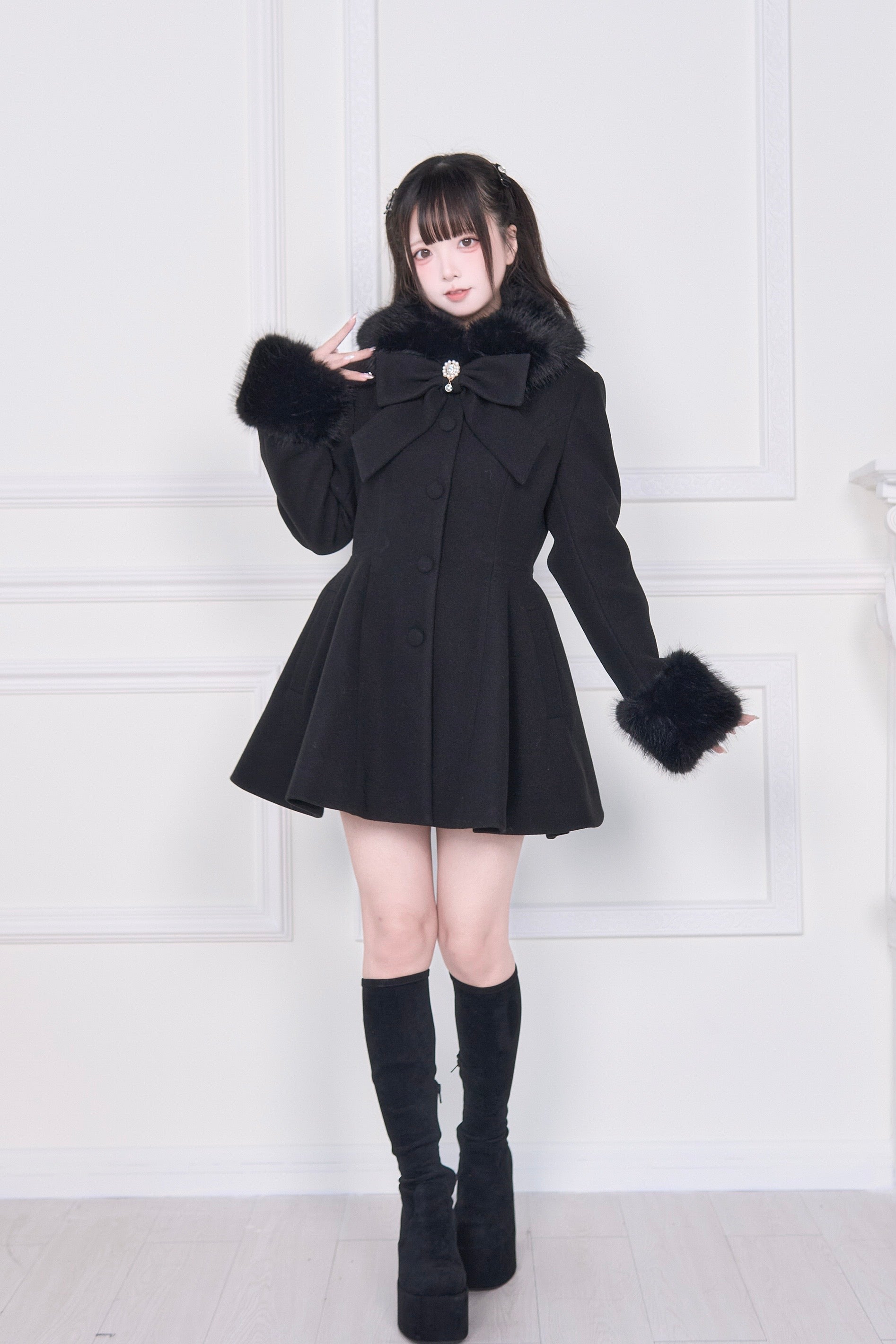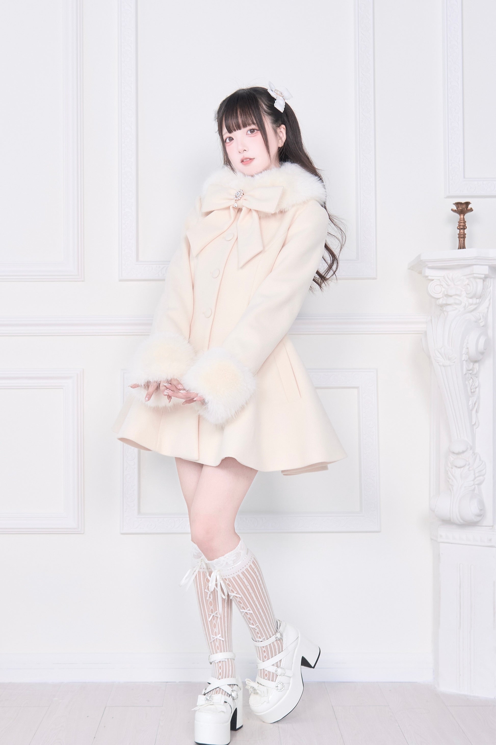 襟元と袖口のふわふわファー、そして大きめのリボンブローチはすべて取り外し可能。