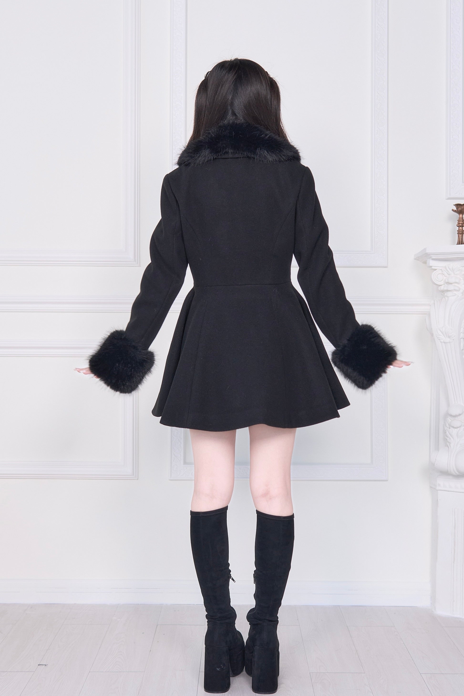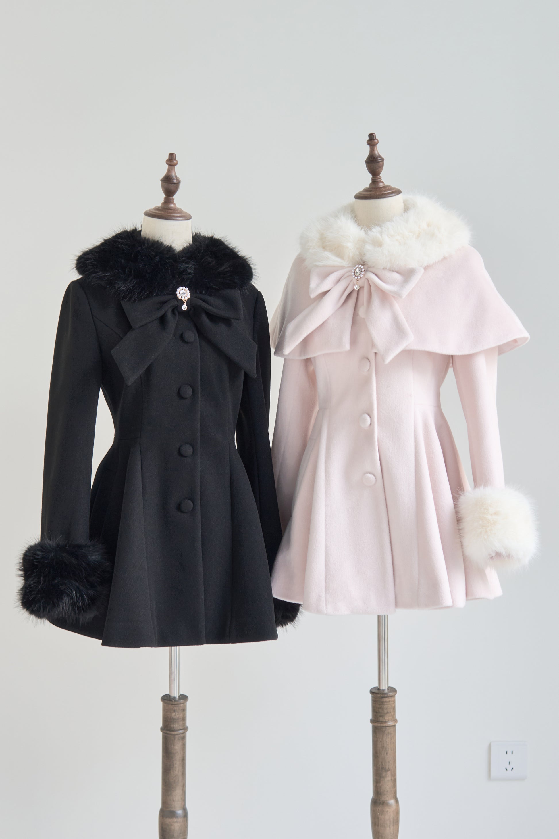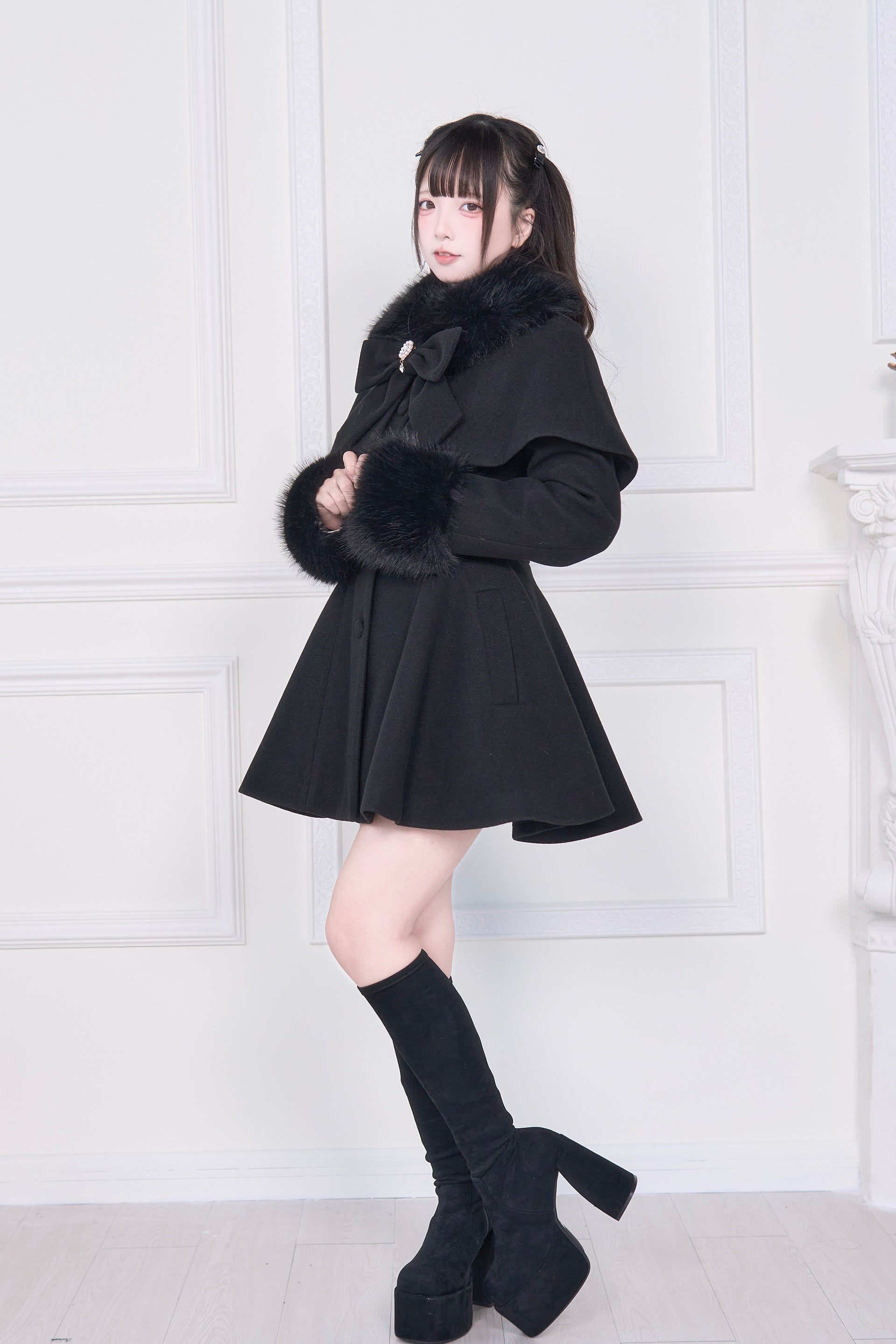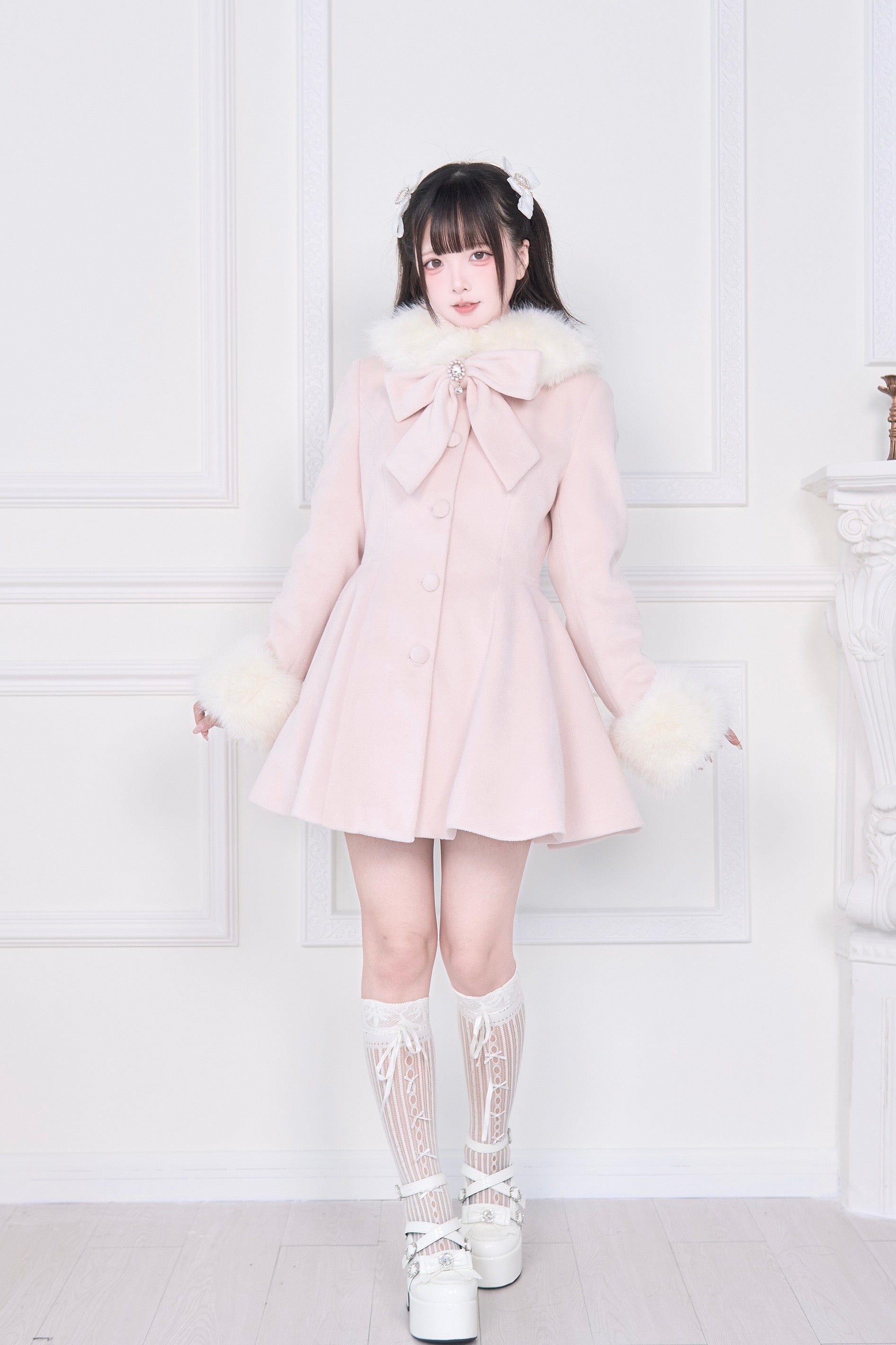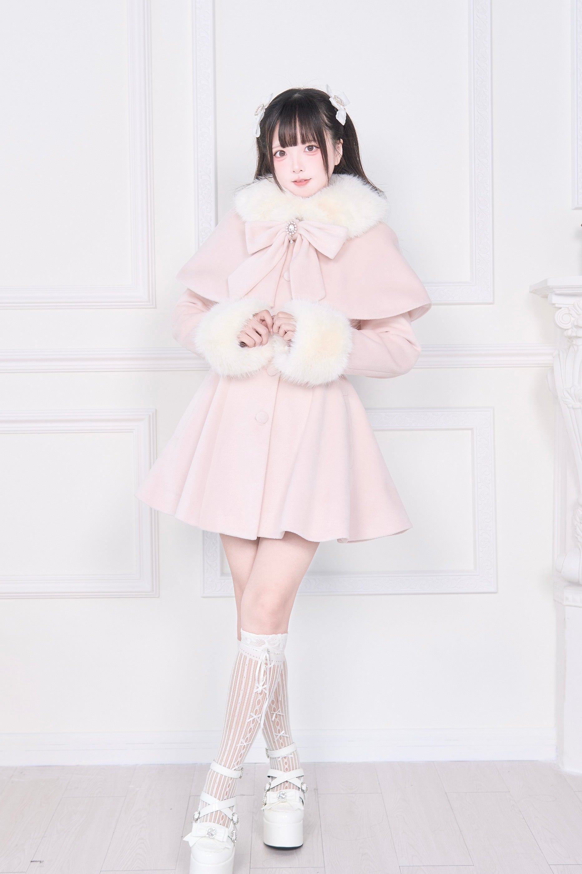 襟元と袖口のふわふわファー、そして大きめのリボンブローチはすべて取り外し可能。