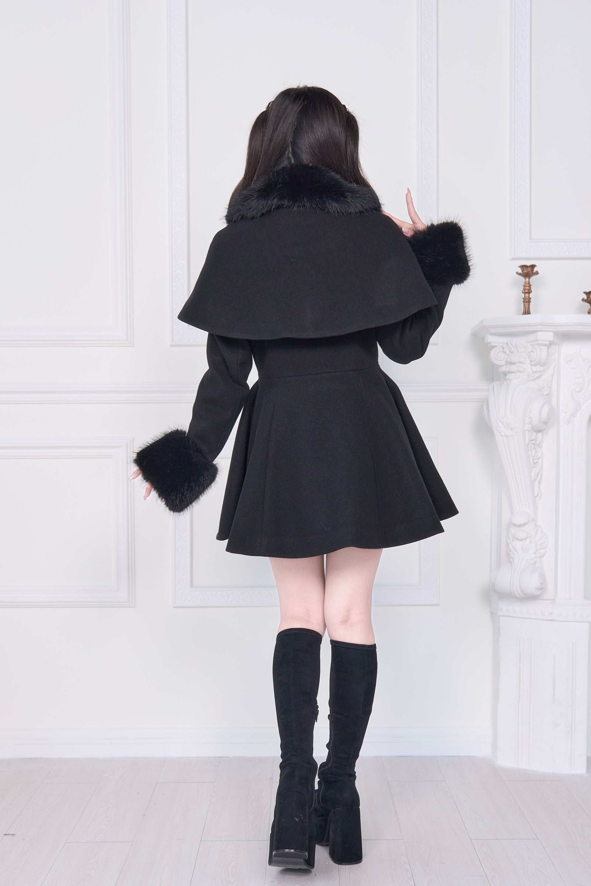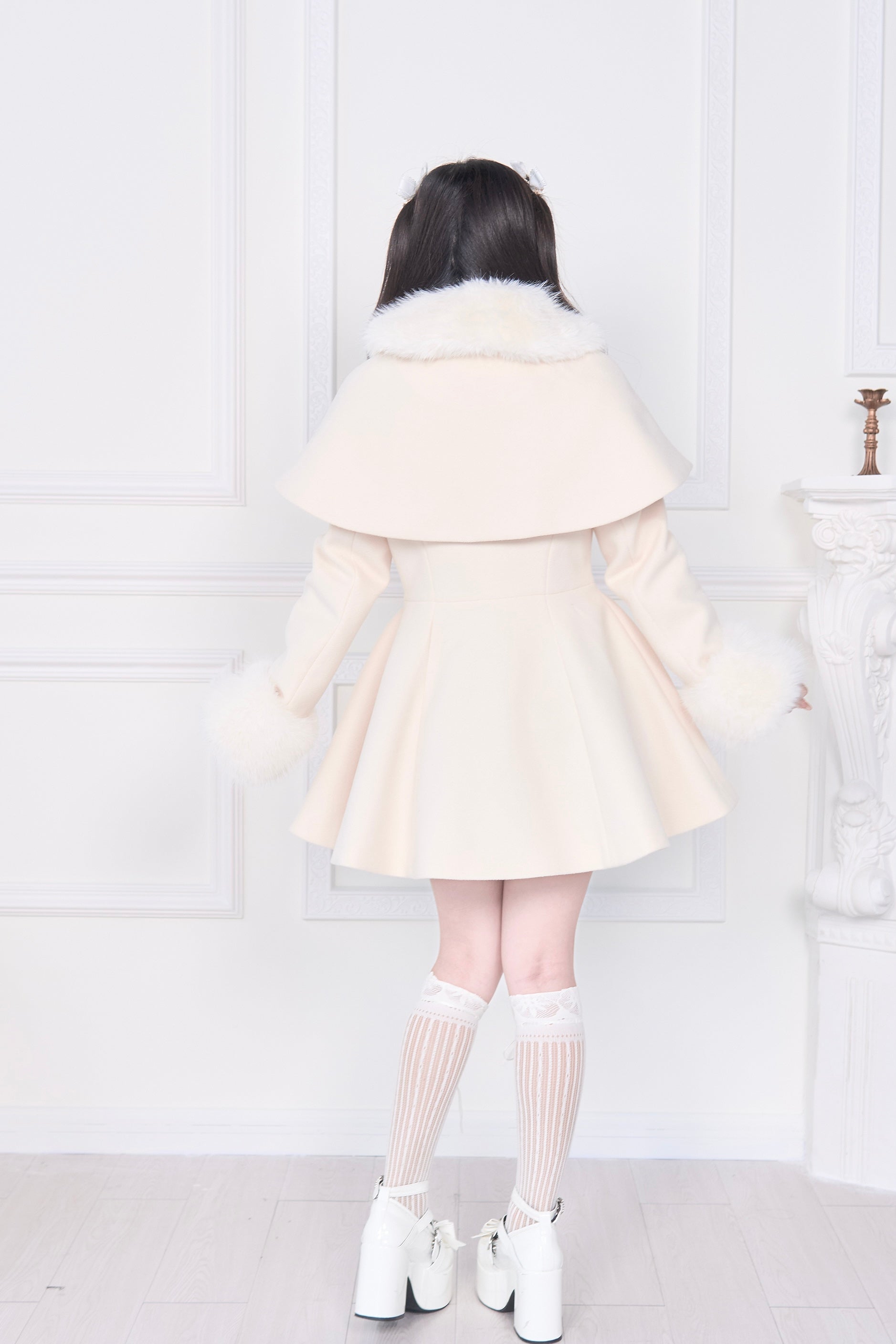ふんわりと広がるフレアシルエットに、ケープデザインを重ねた上品なコート。