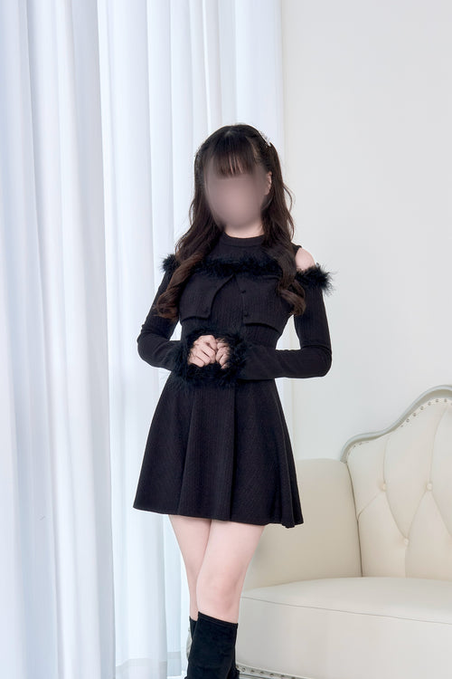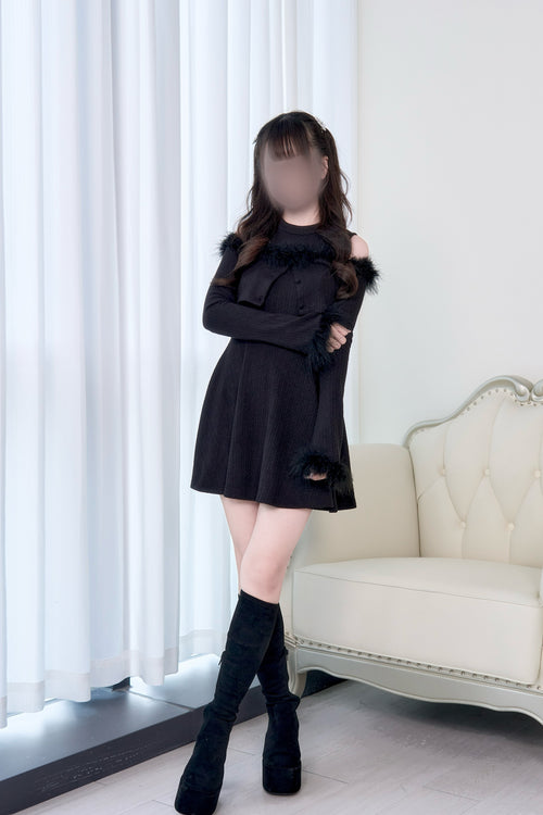 A gorgeous off-the-shoulder knit dress with fluffy feather trim.