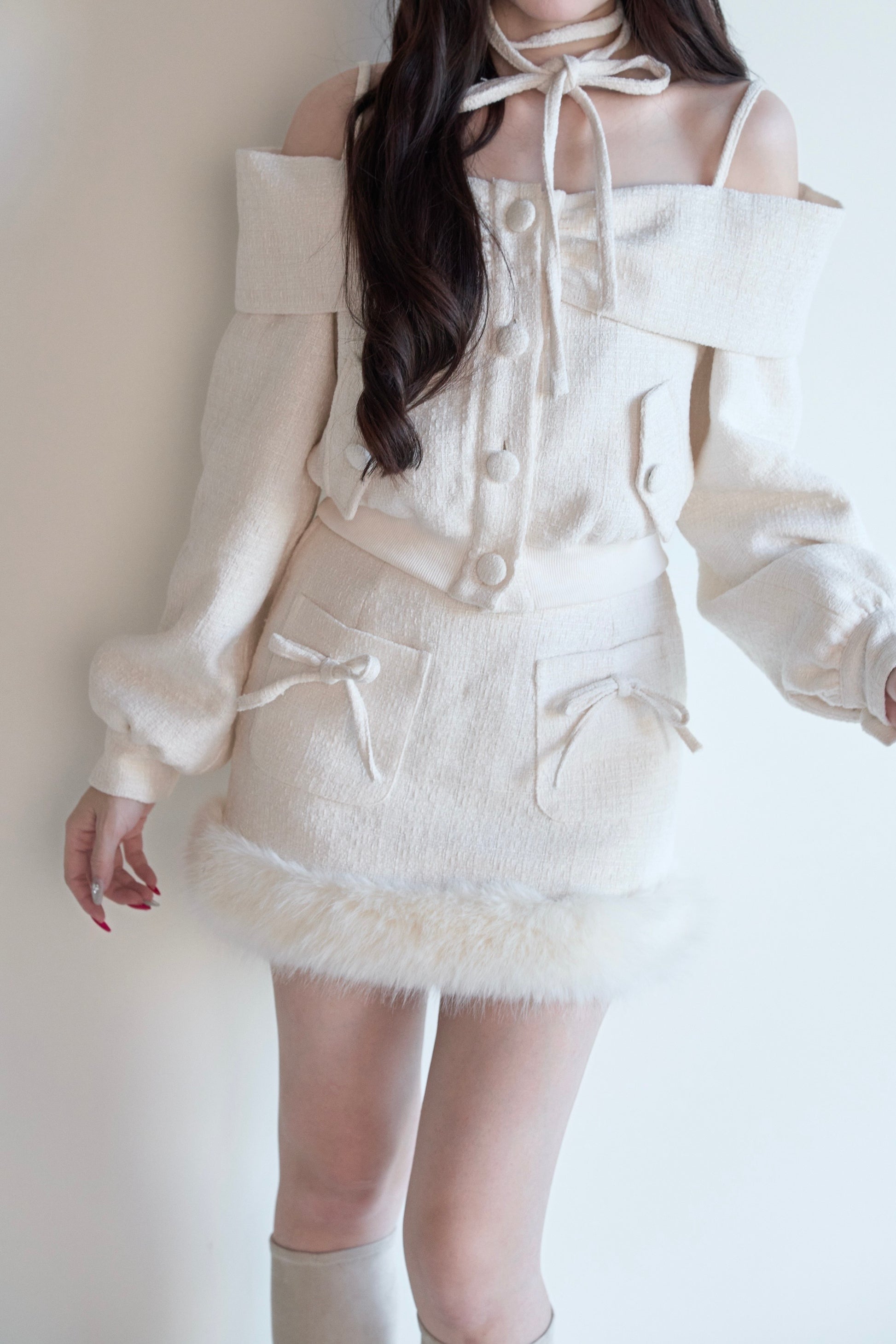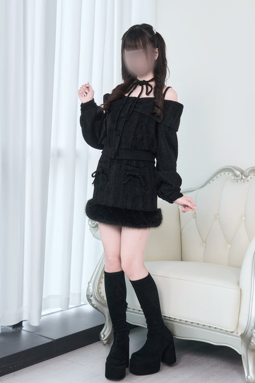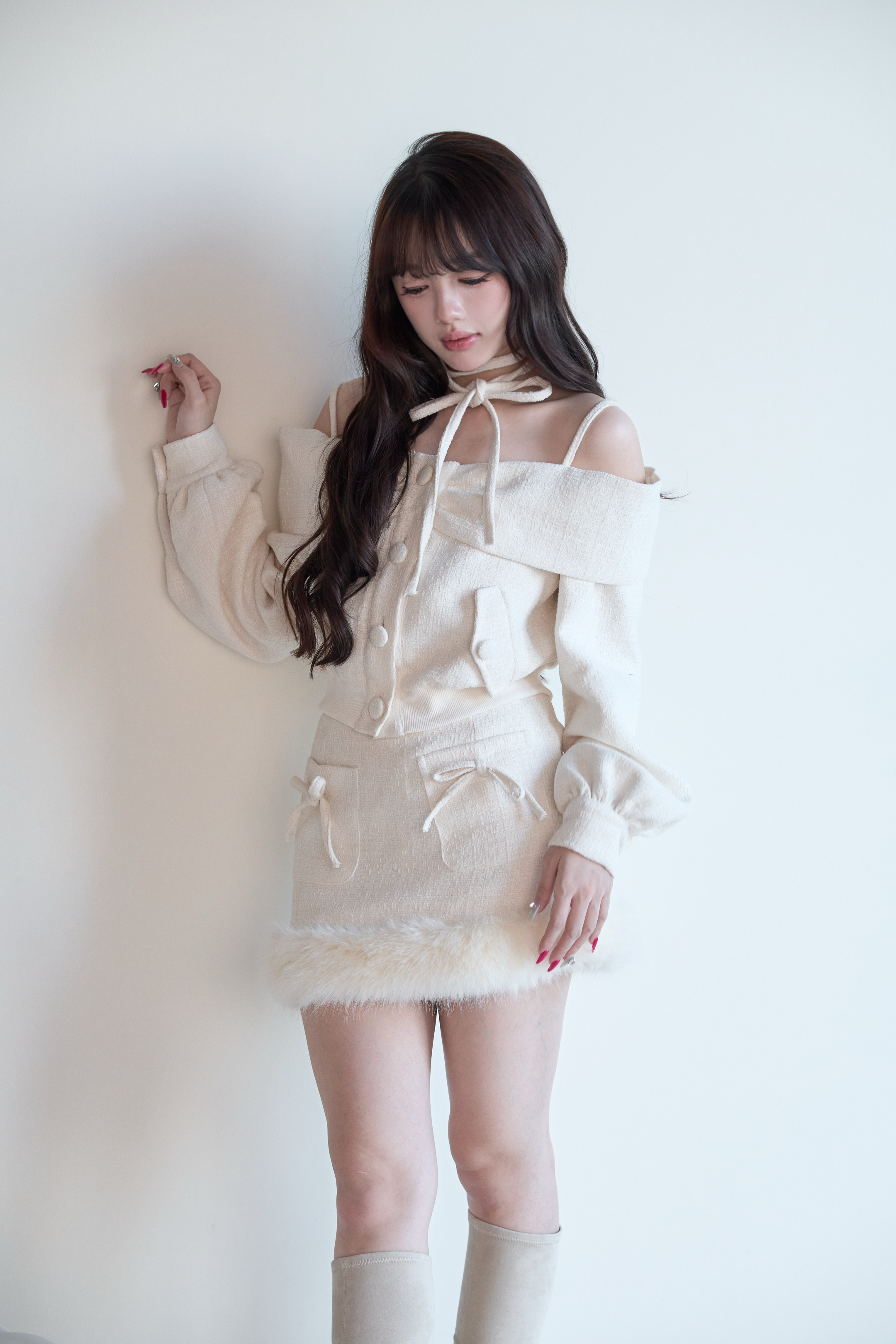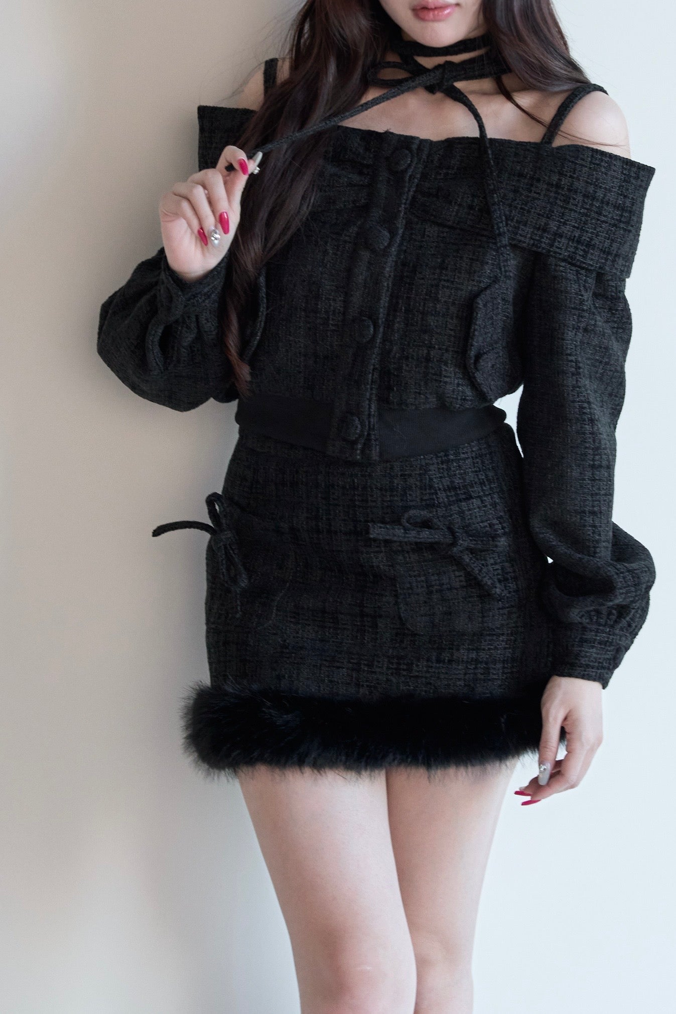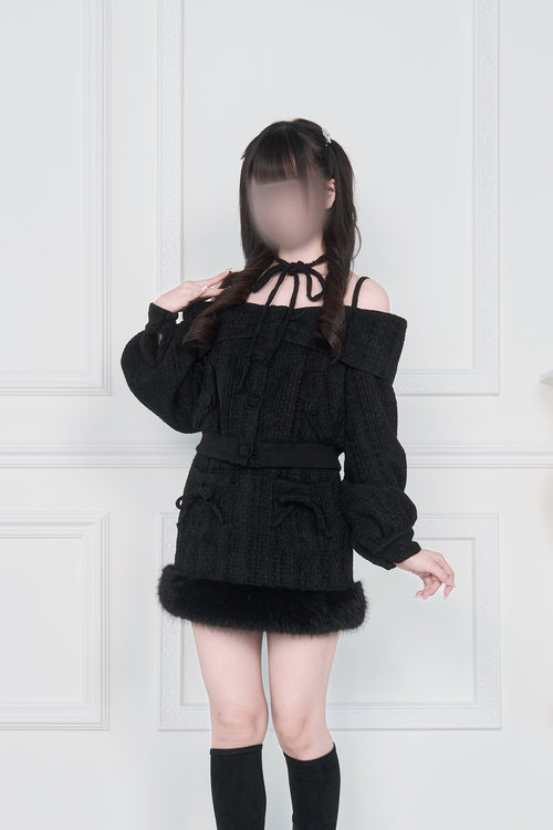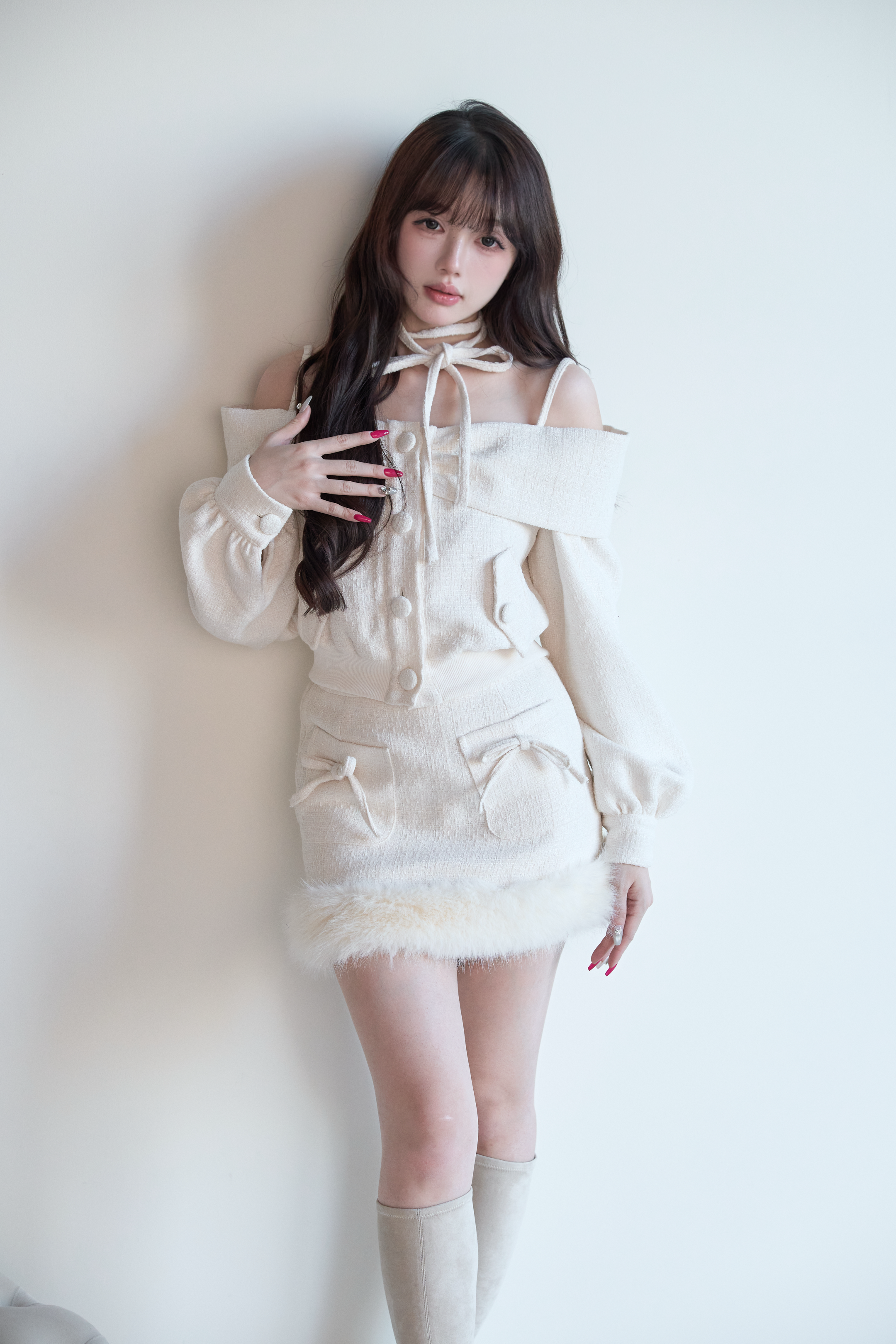 An off-the-shoulder jacket and mini skirt set made from elegant tweed fabric.