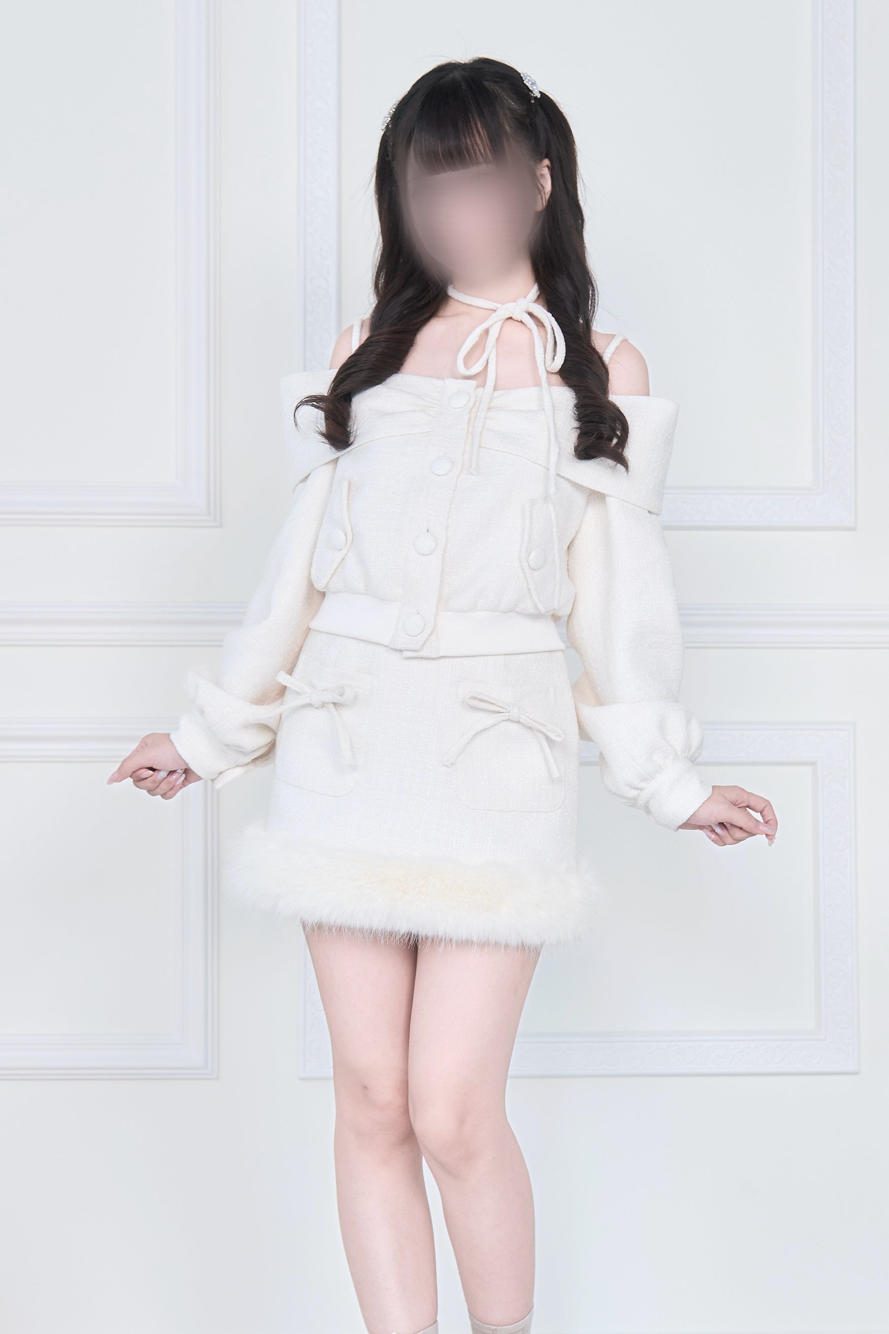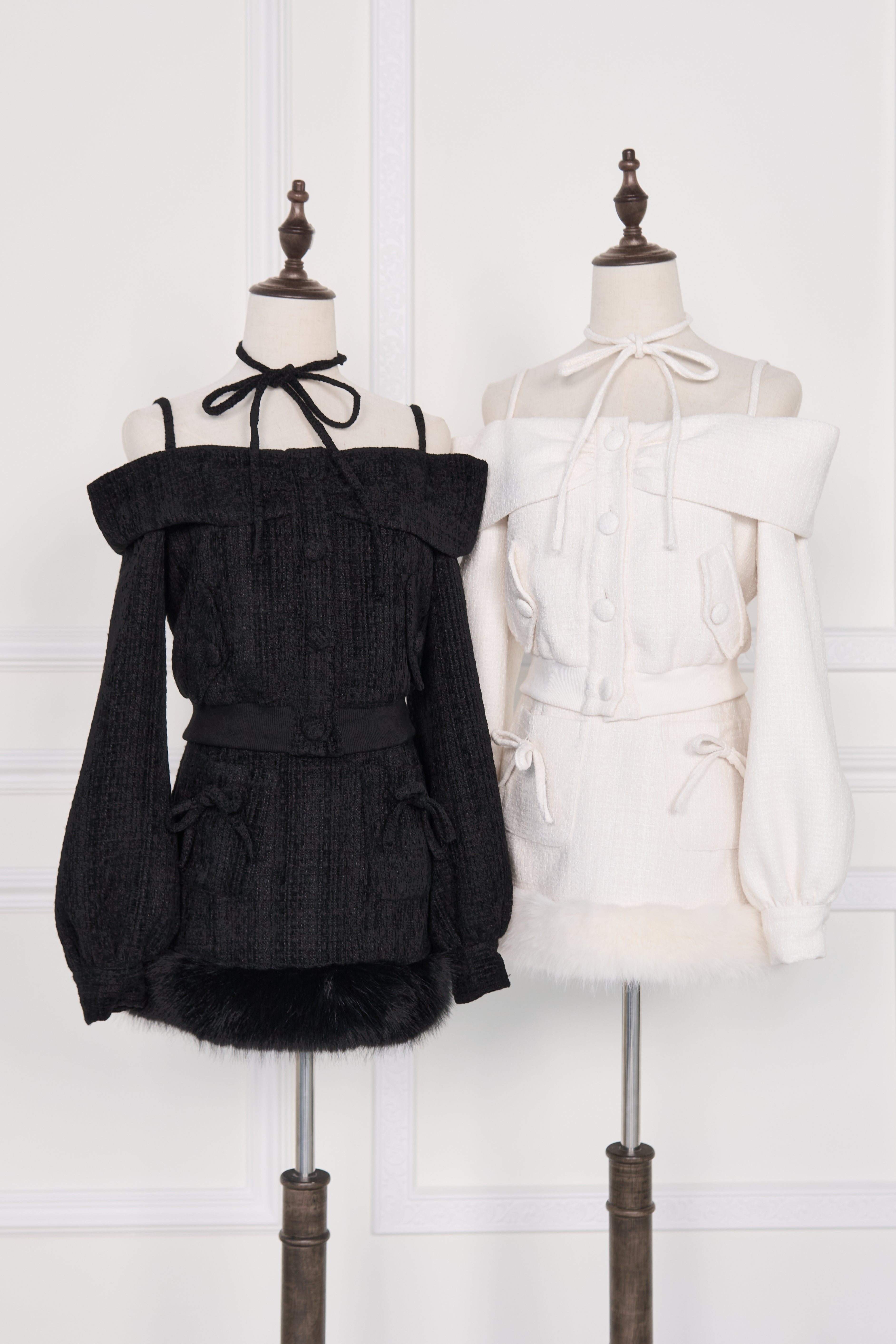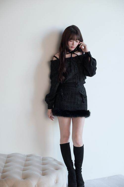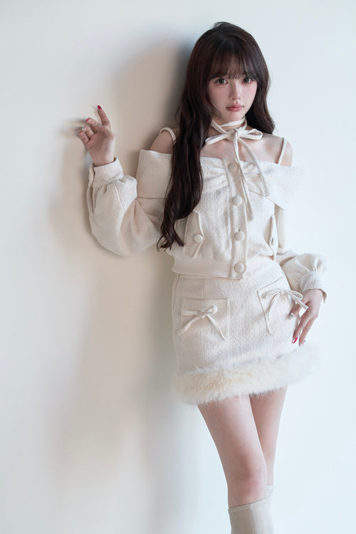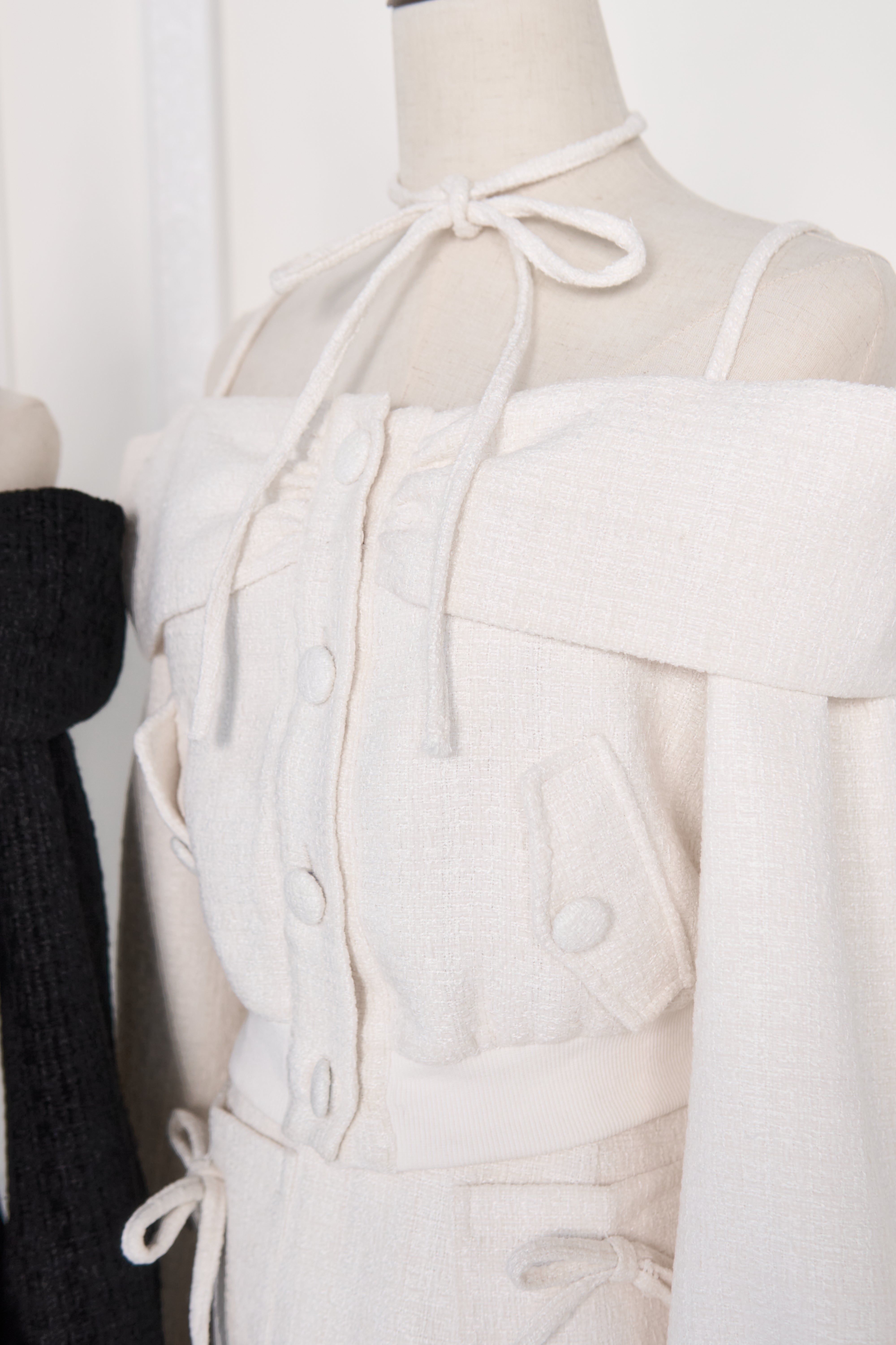 An off-the-shoulder jacket and mini skirt set made from elegant tweed fabric.