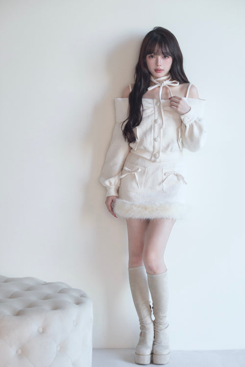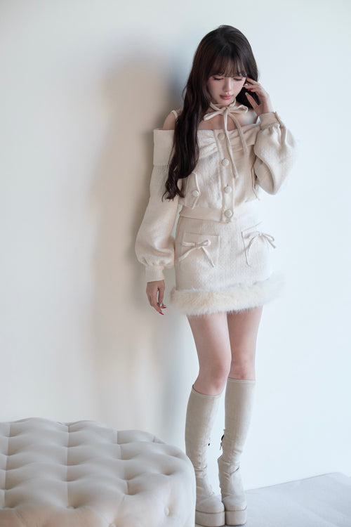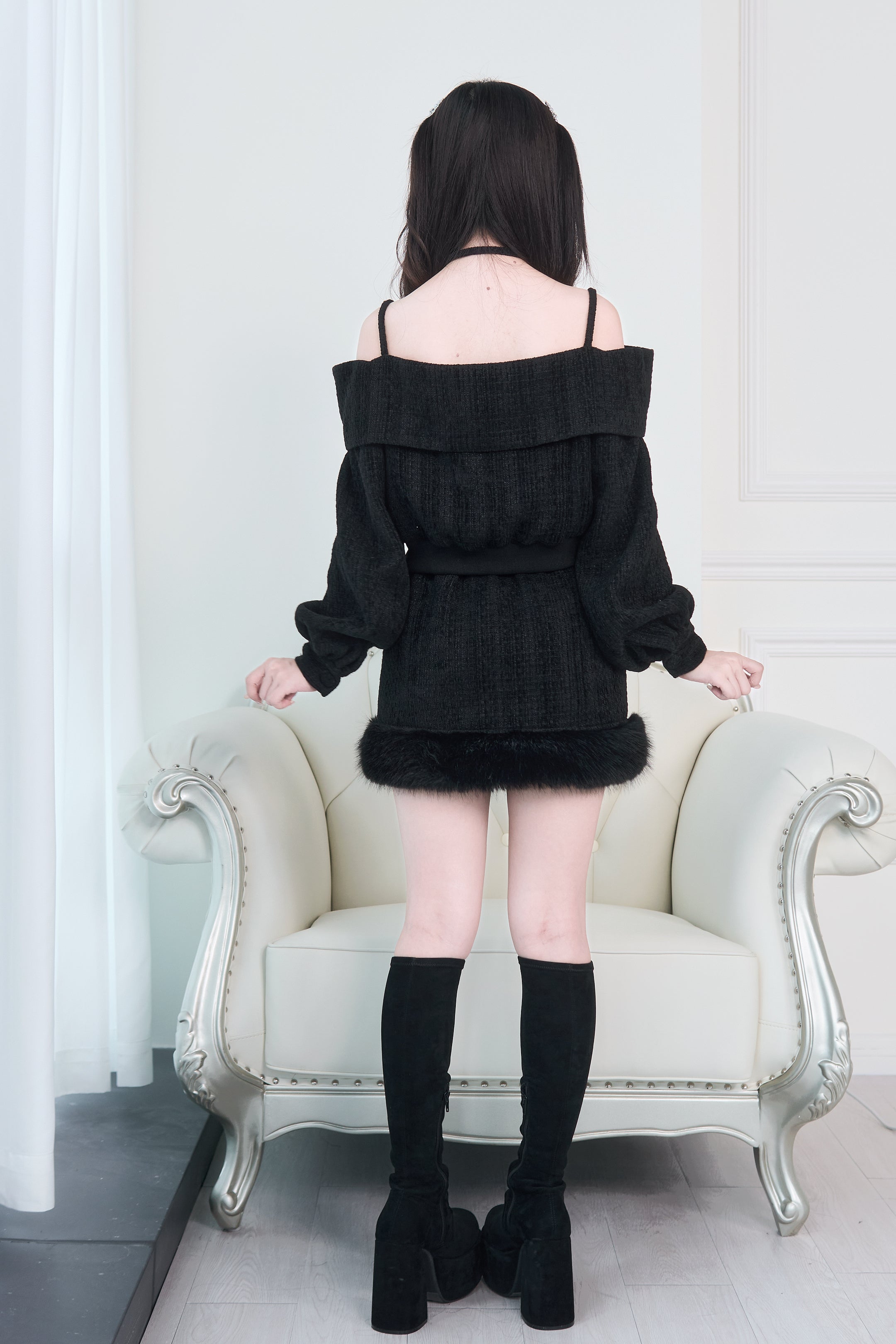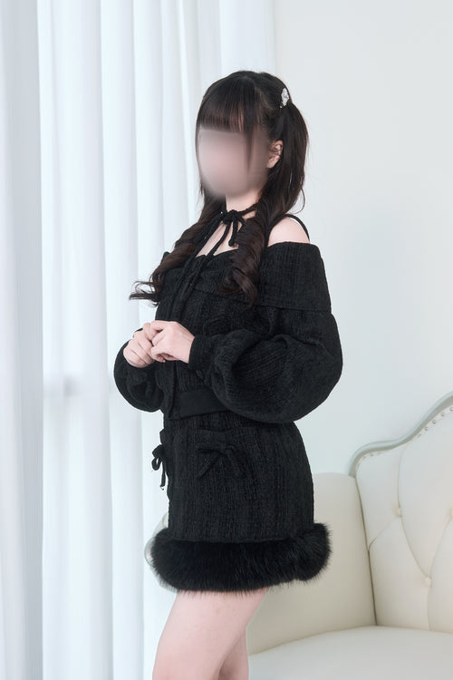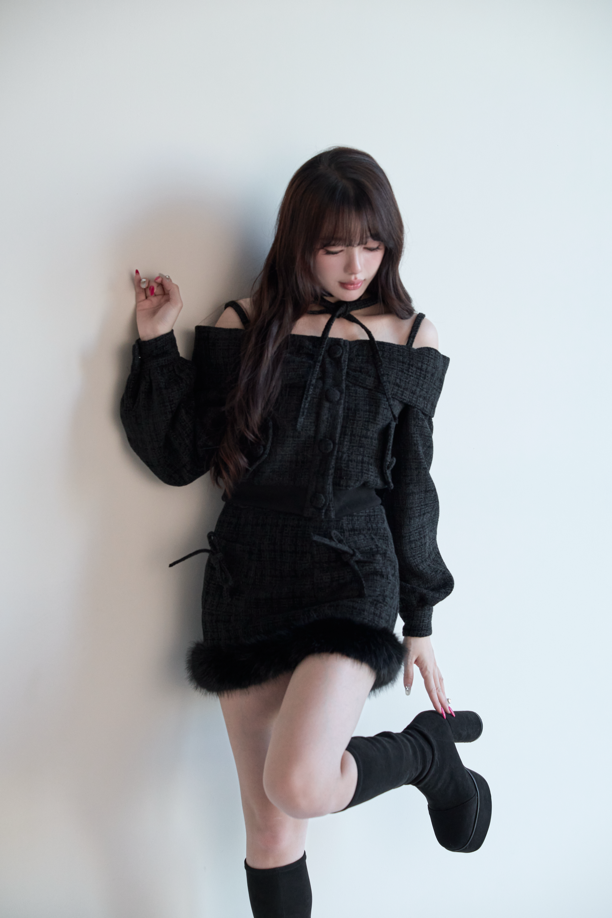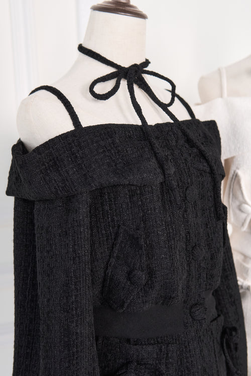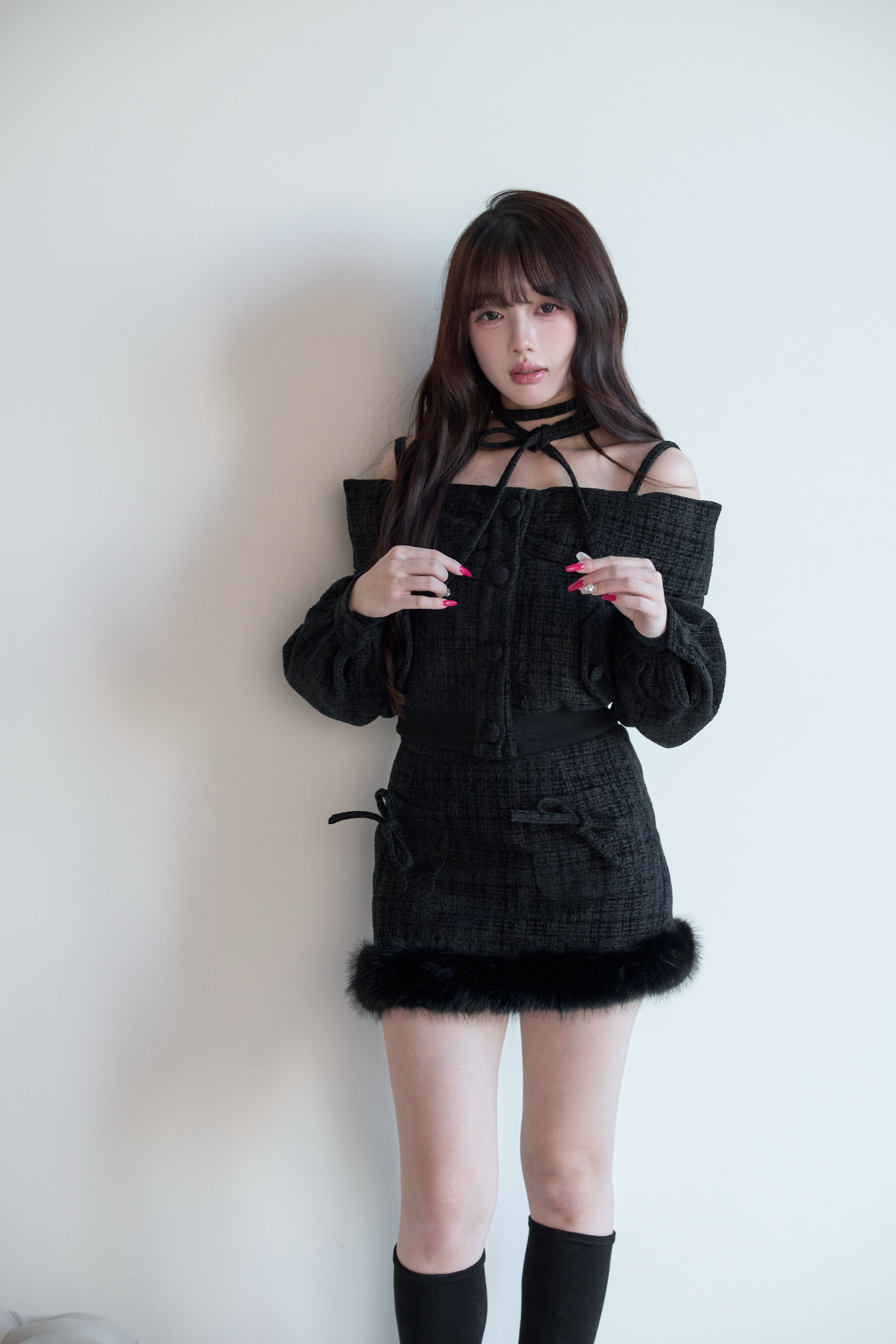 An off-the-shoulder jacket and mini skirt set made from elegant tweed fabric.