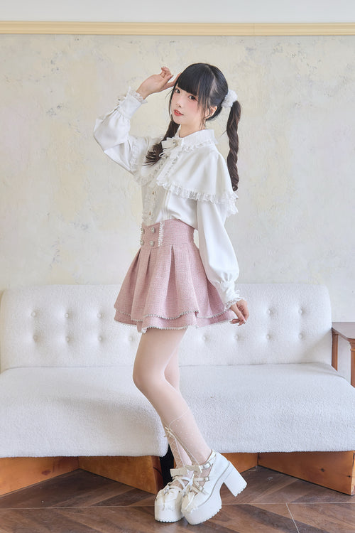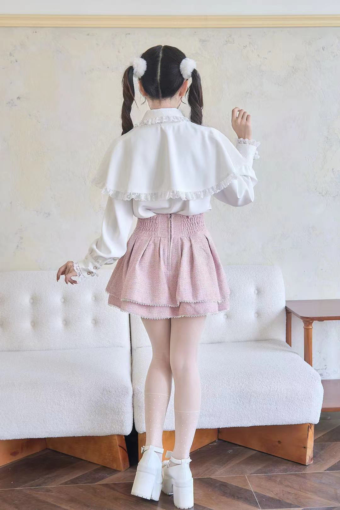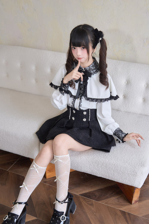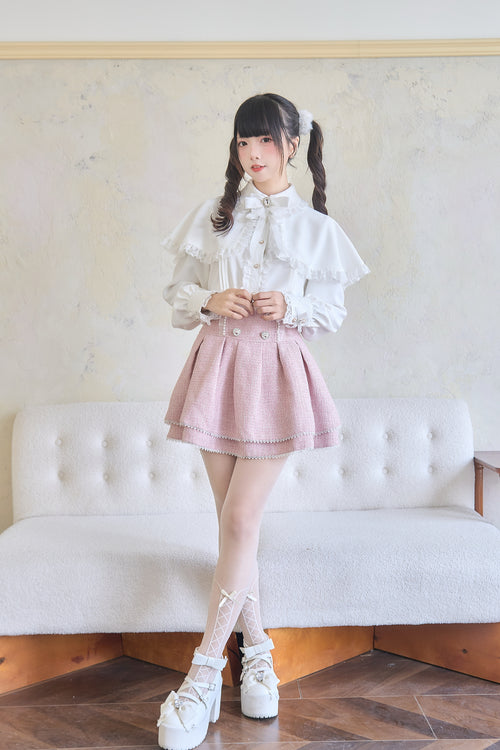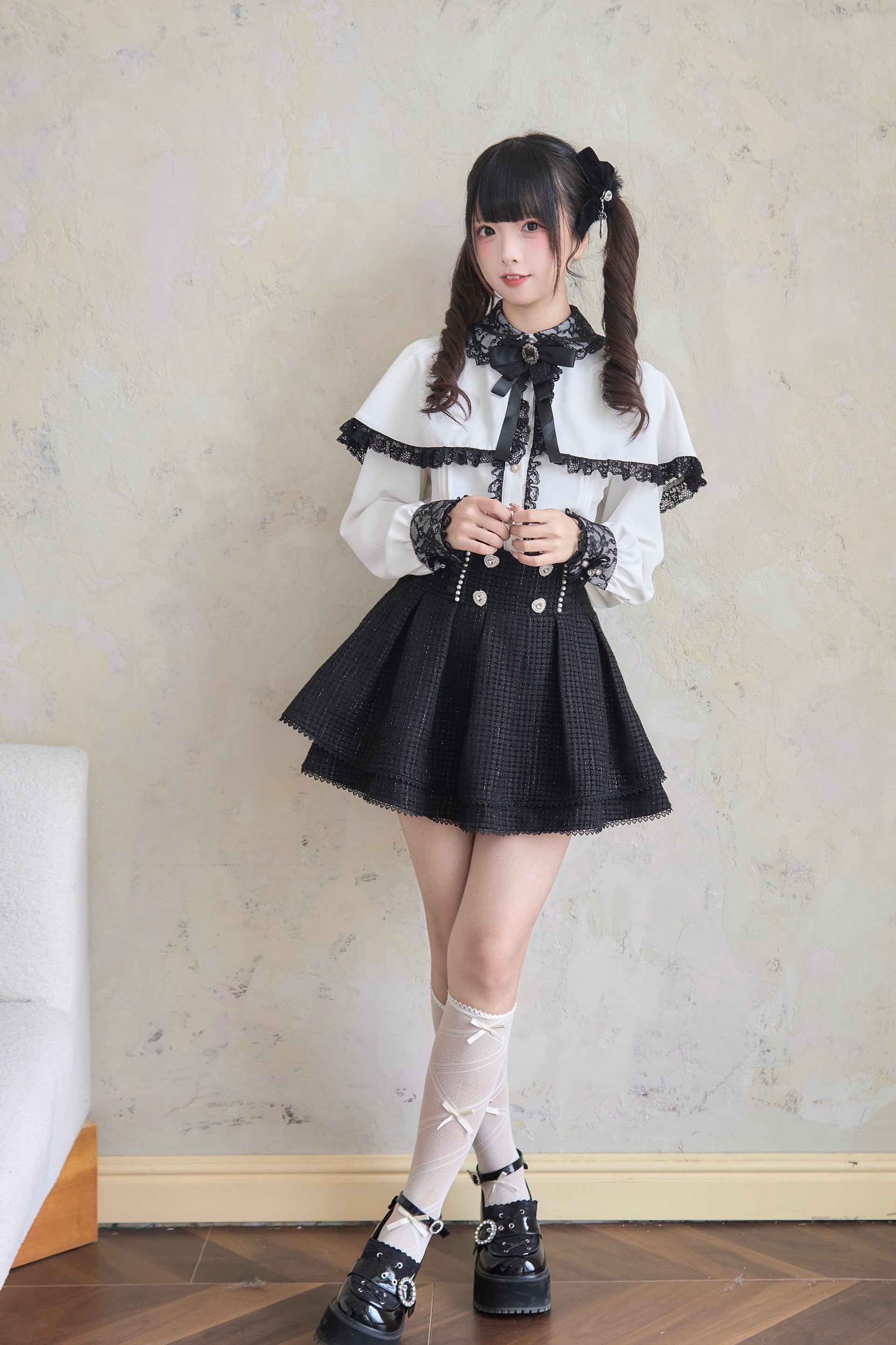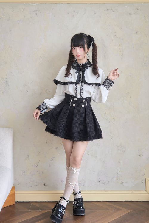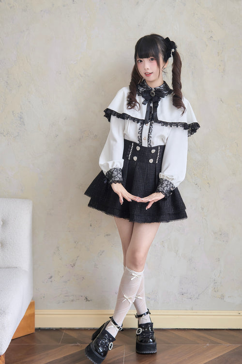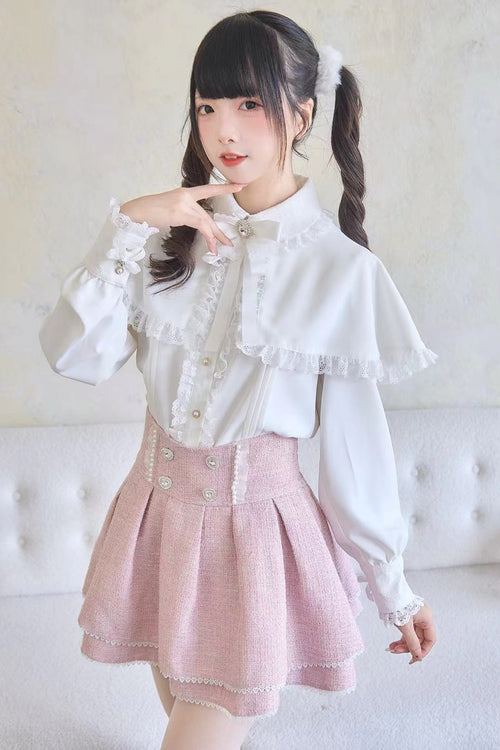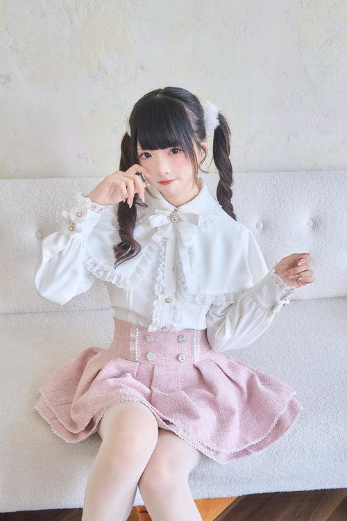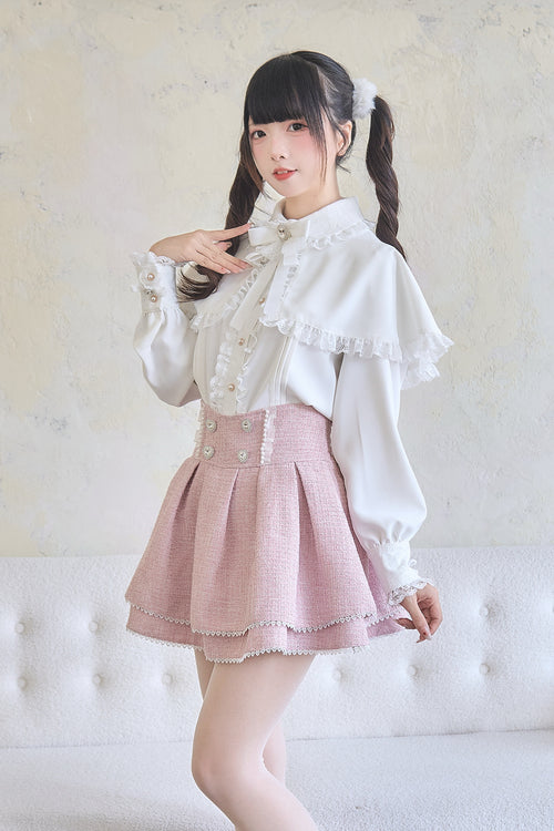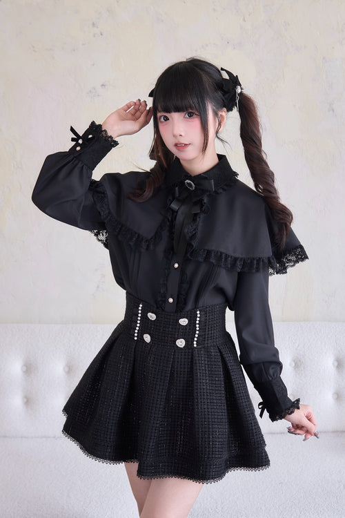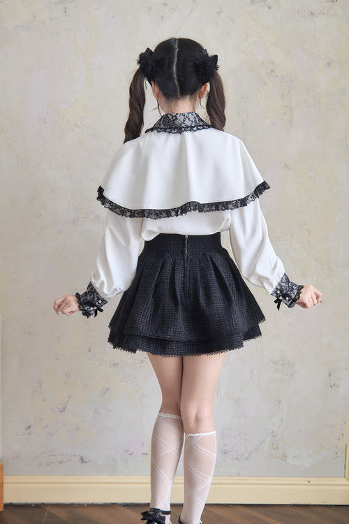 This blouse features delicate lace and a classic chest stitch. It comes with a detachable mini cape, allowing you to style it in both an elegant and casual style. The cape is trimmed with lace, giving it an instantly glamorous look.