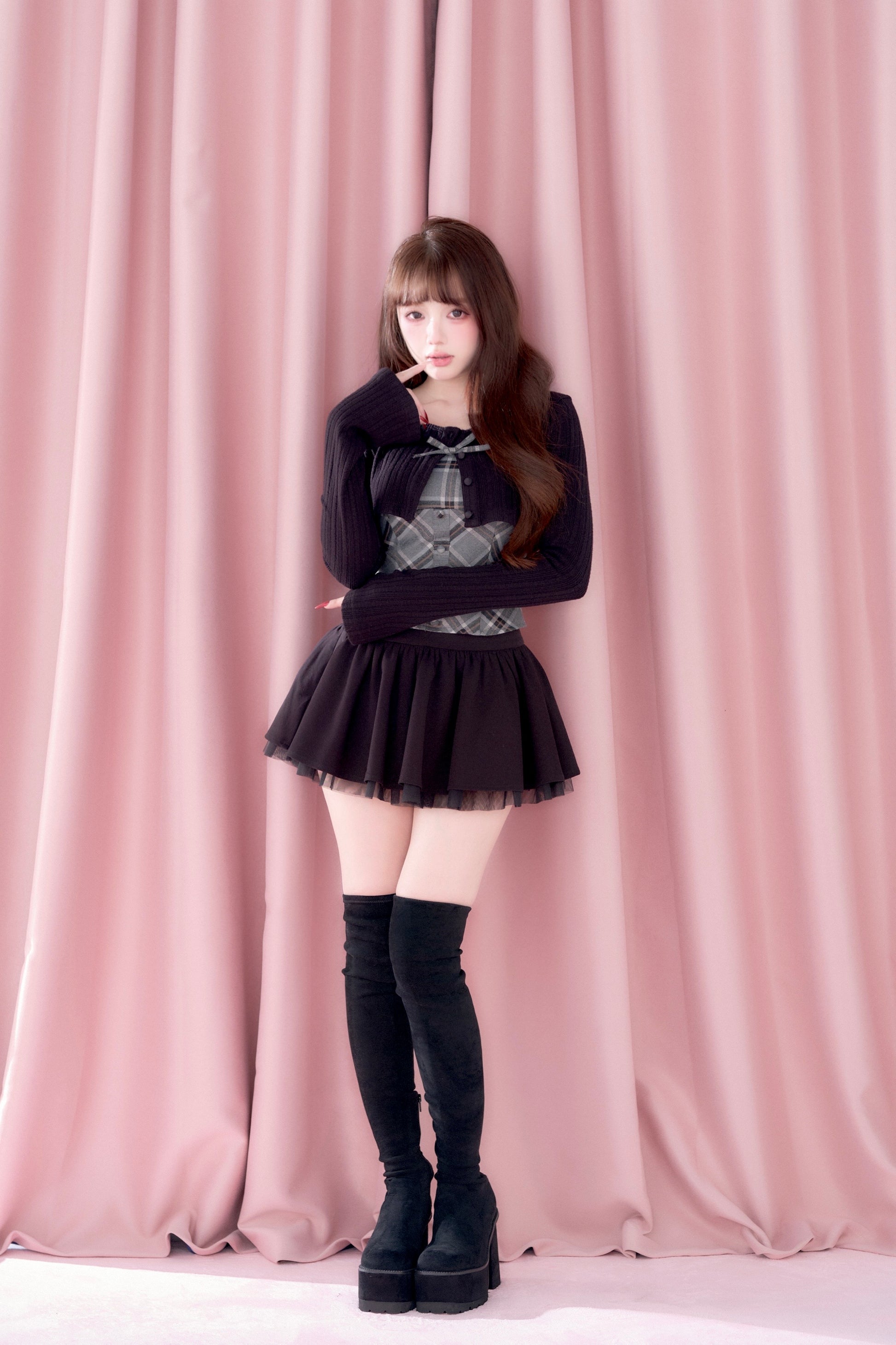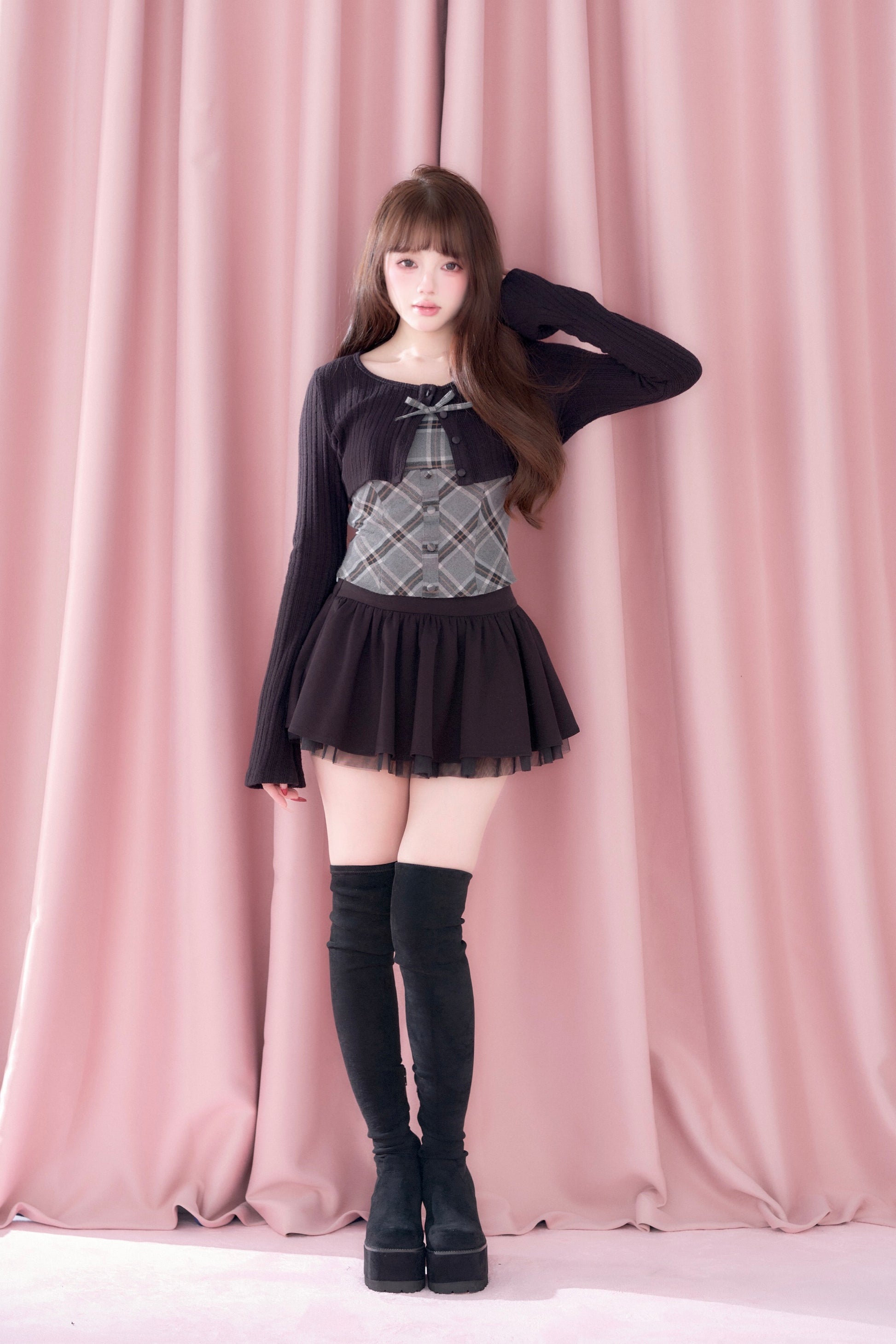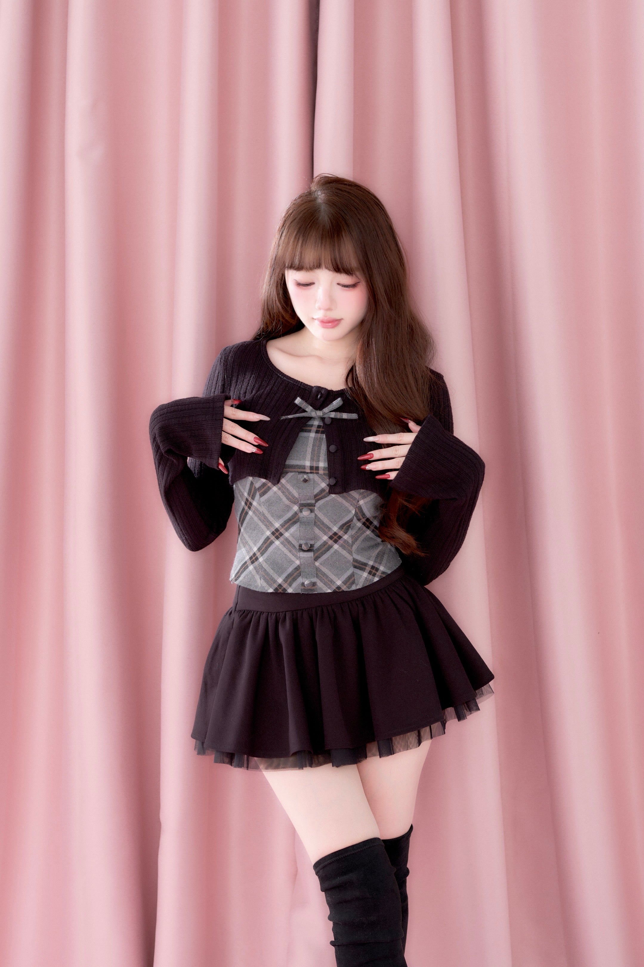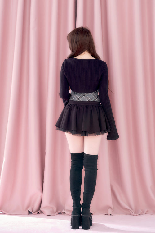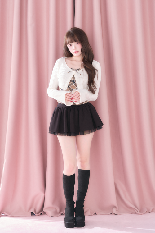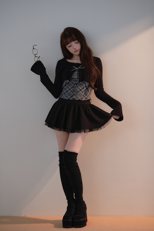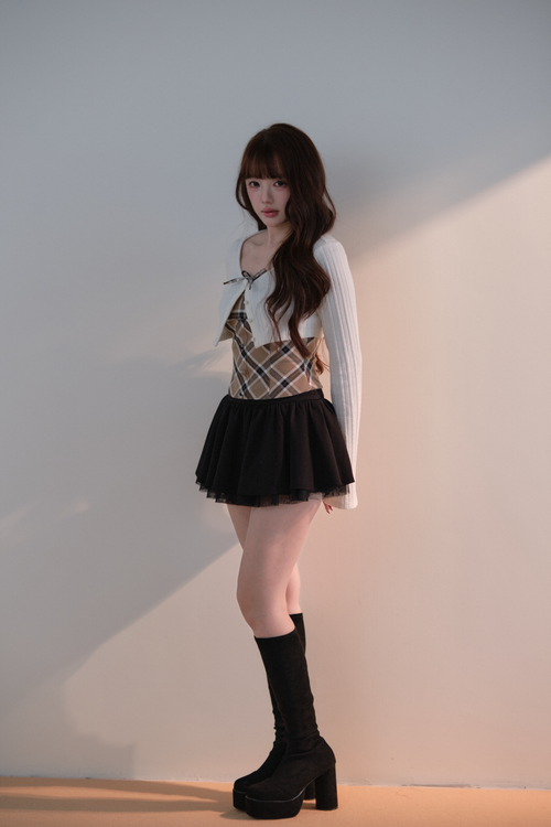 A well-balanced two-piece set that combines a ribbed knit bolero and a checked camisole.