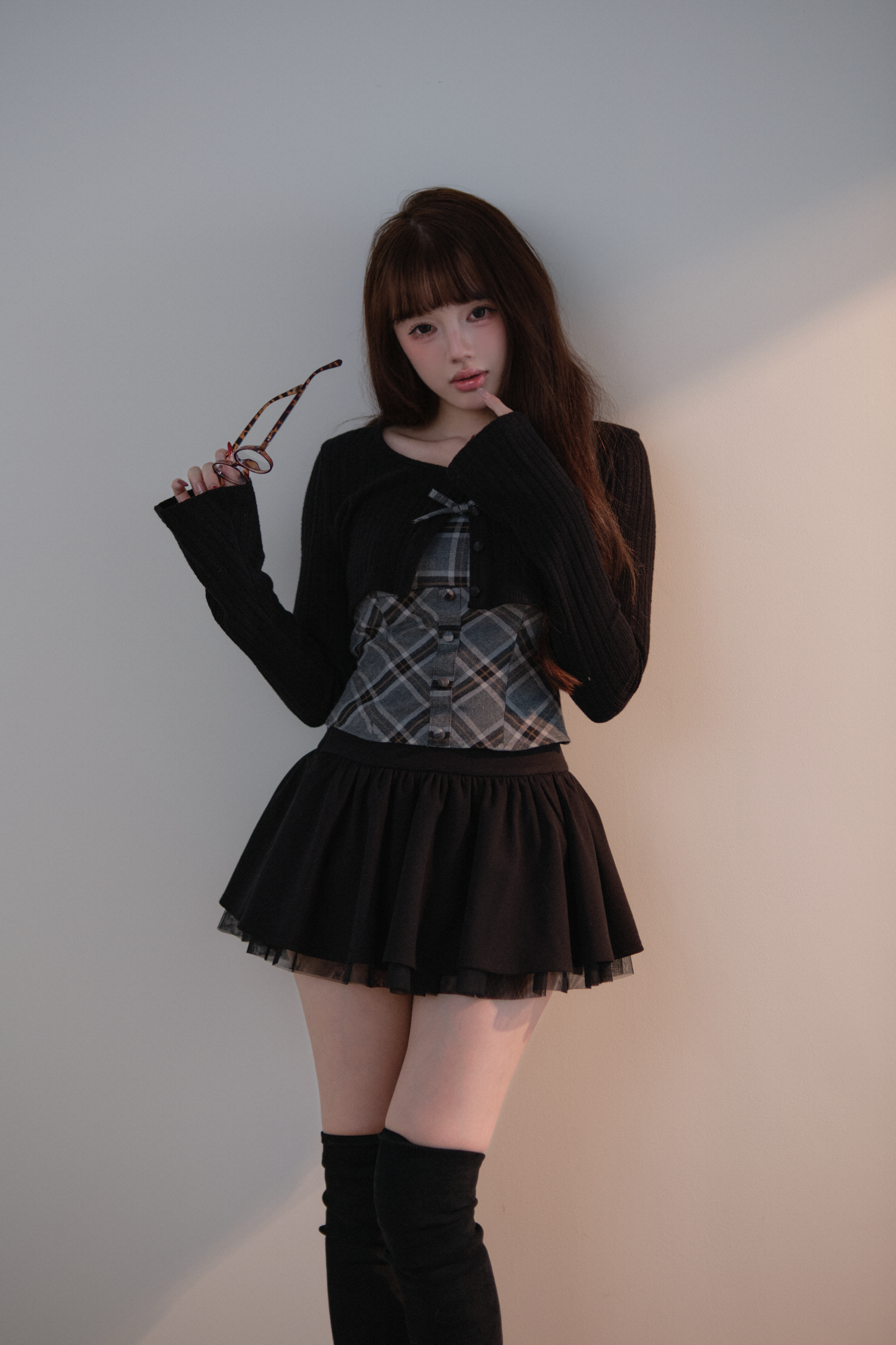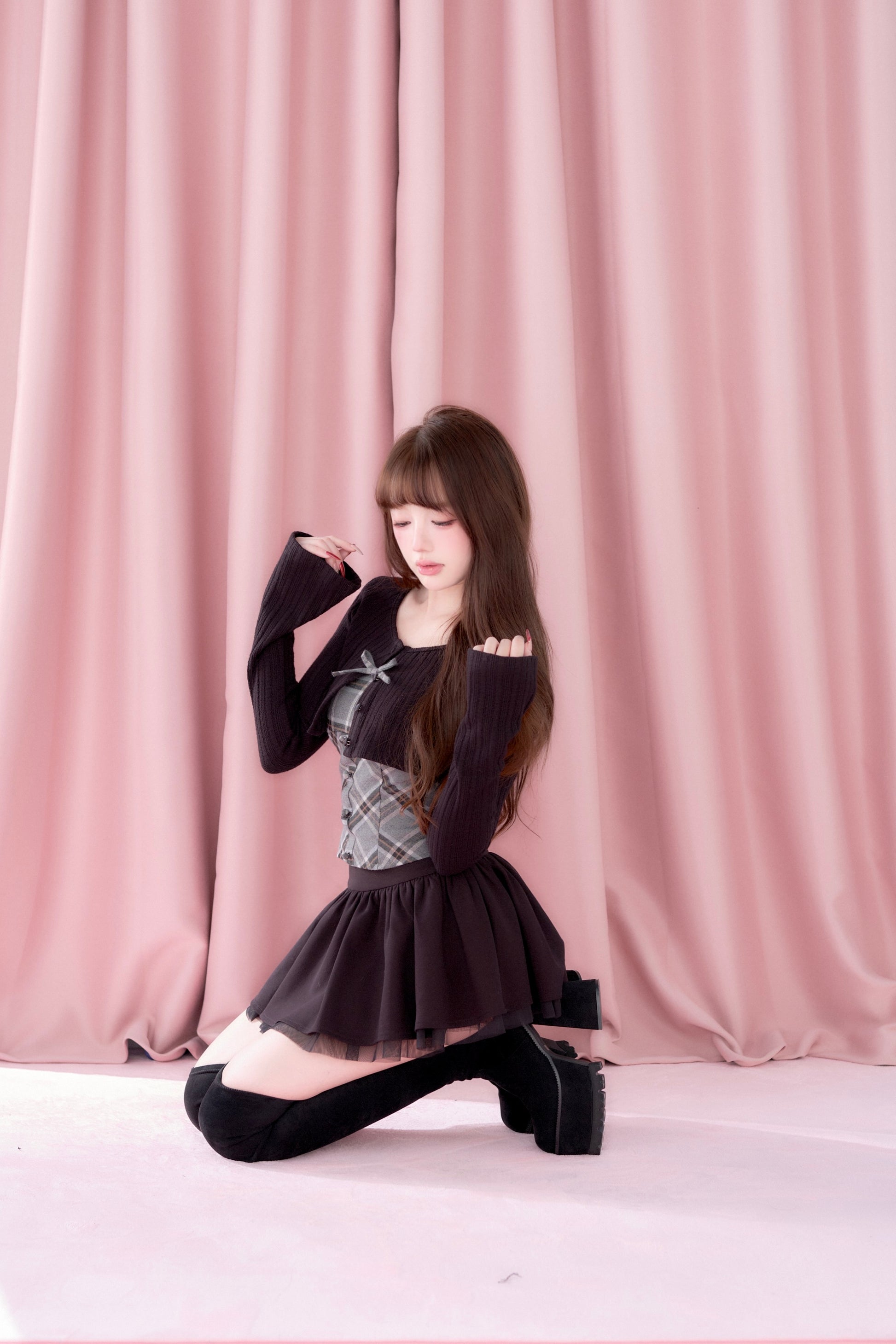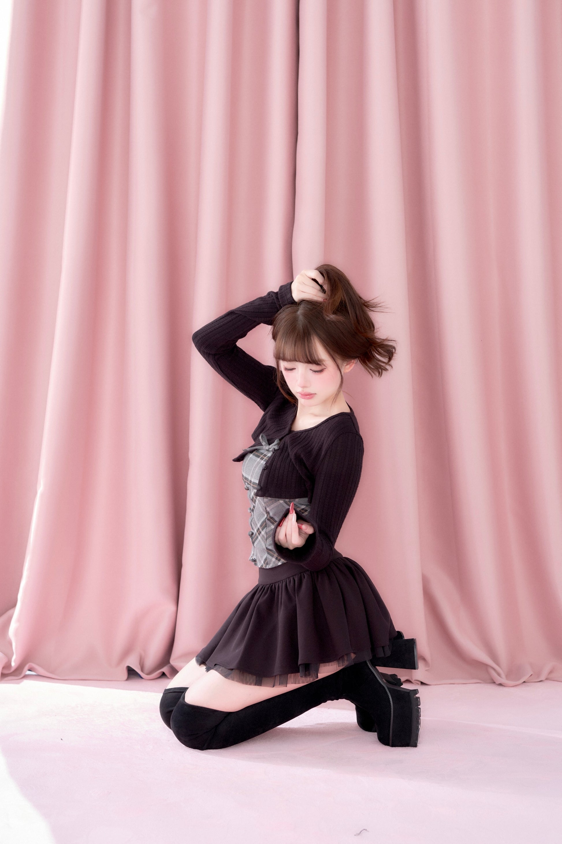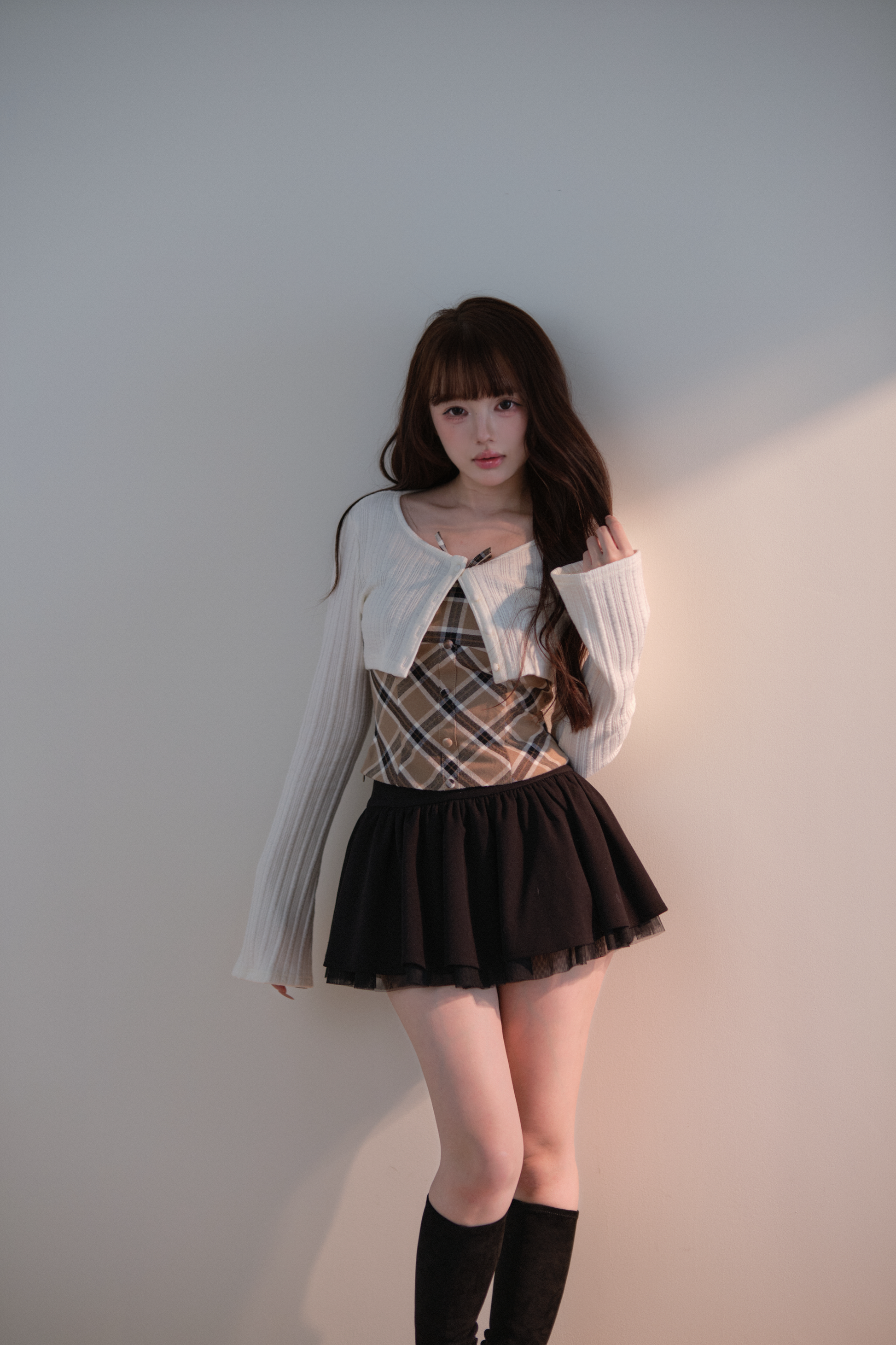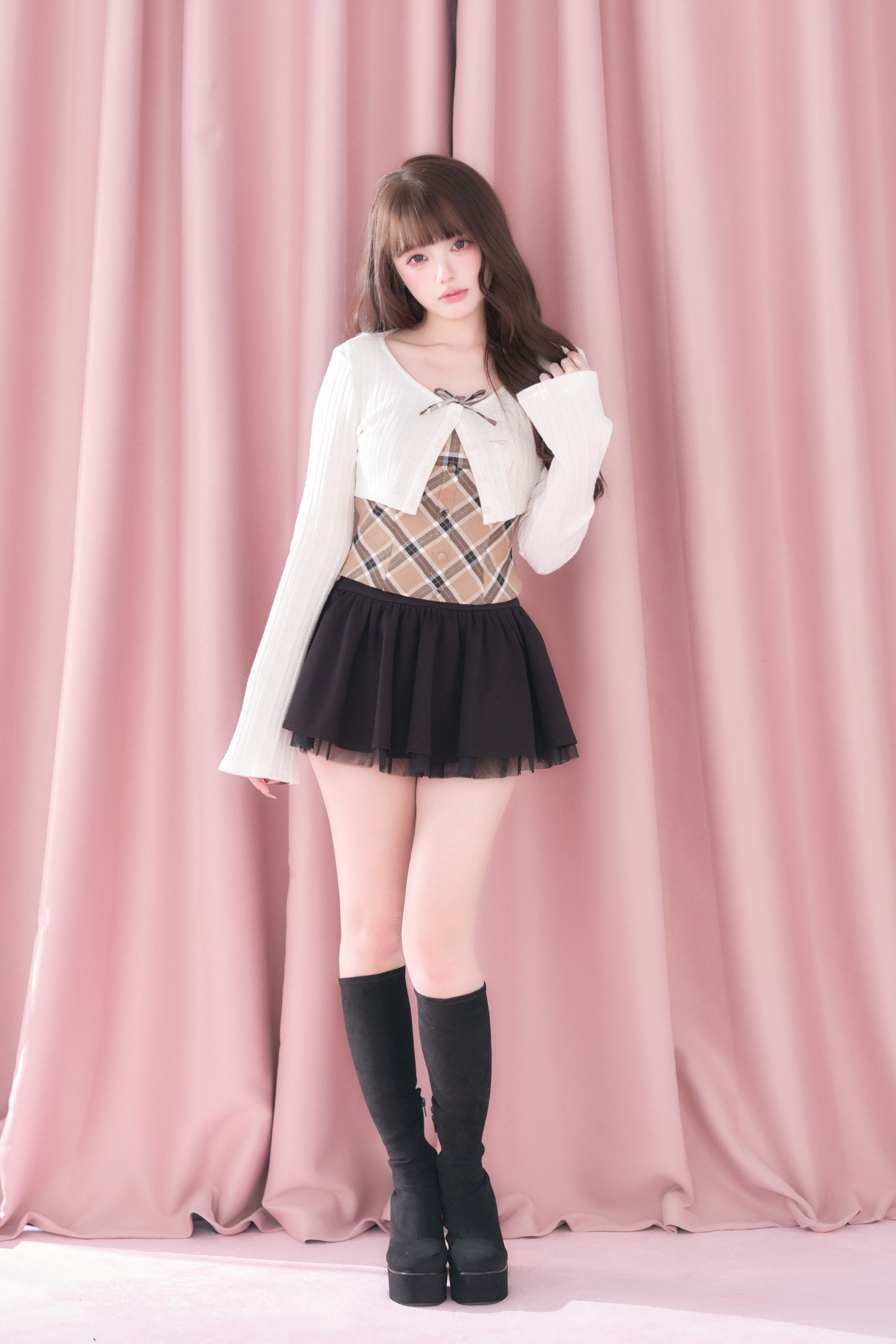 A well-balanced two-piece set that combines a ribbed knit bolero and a checked camisole.