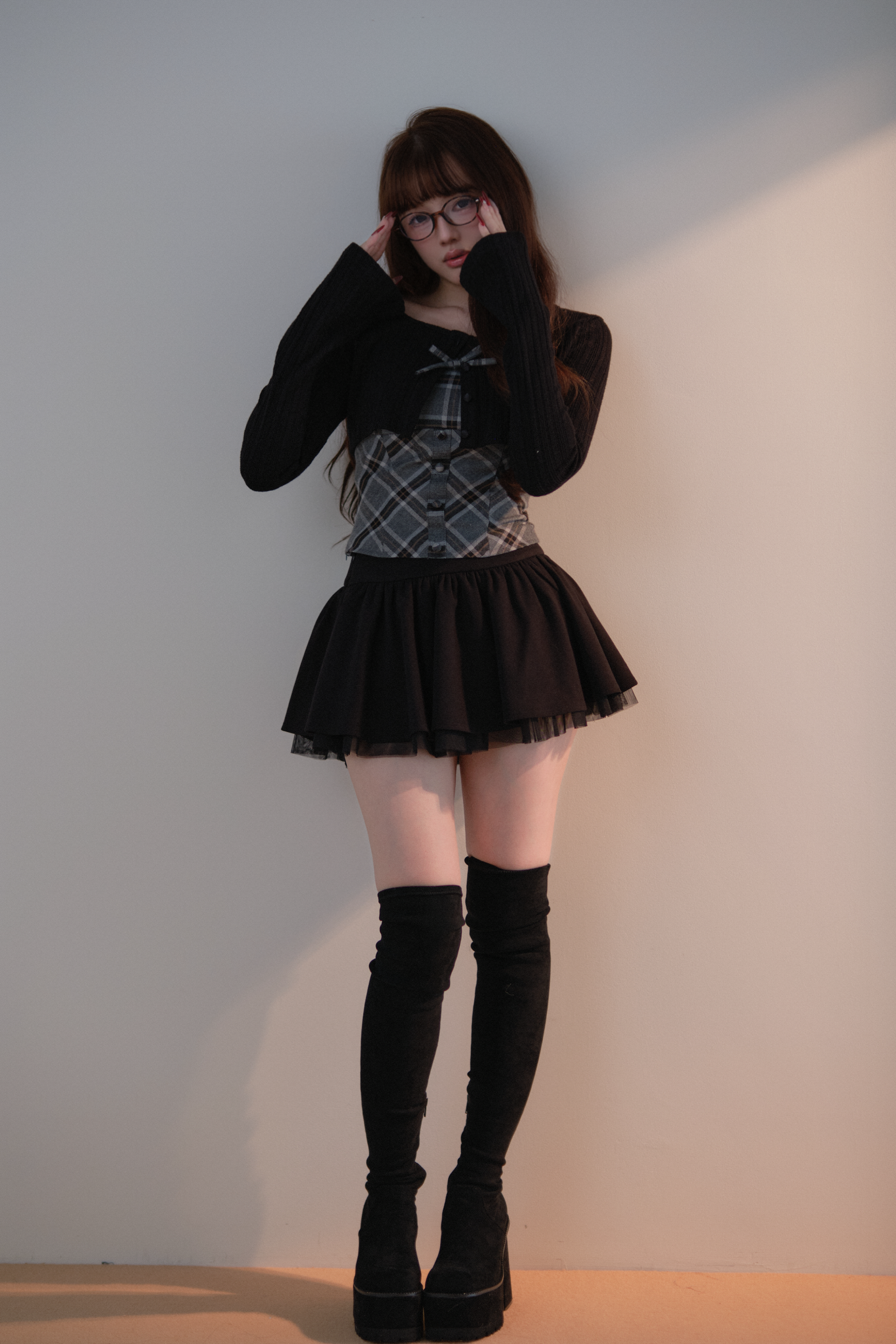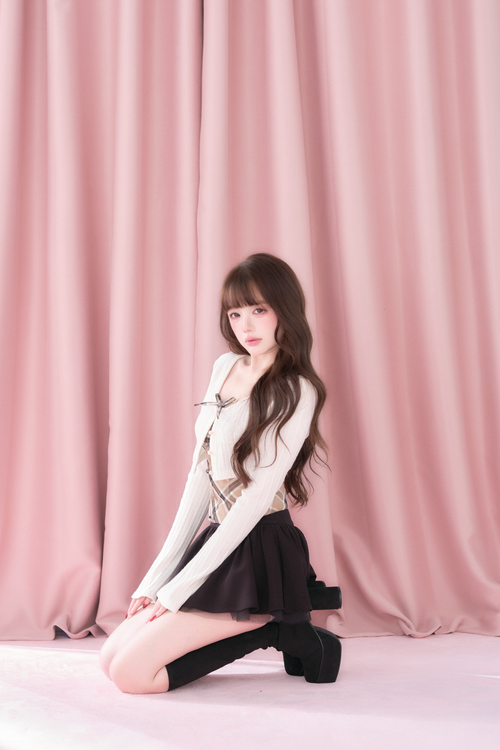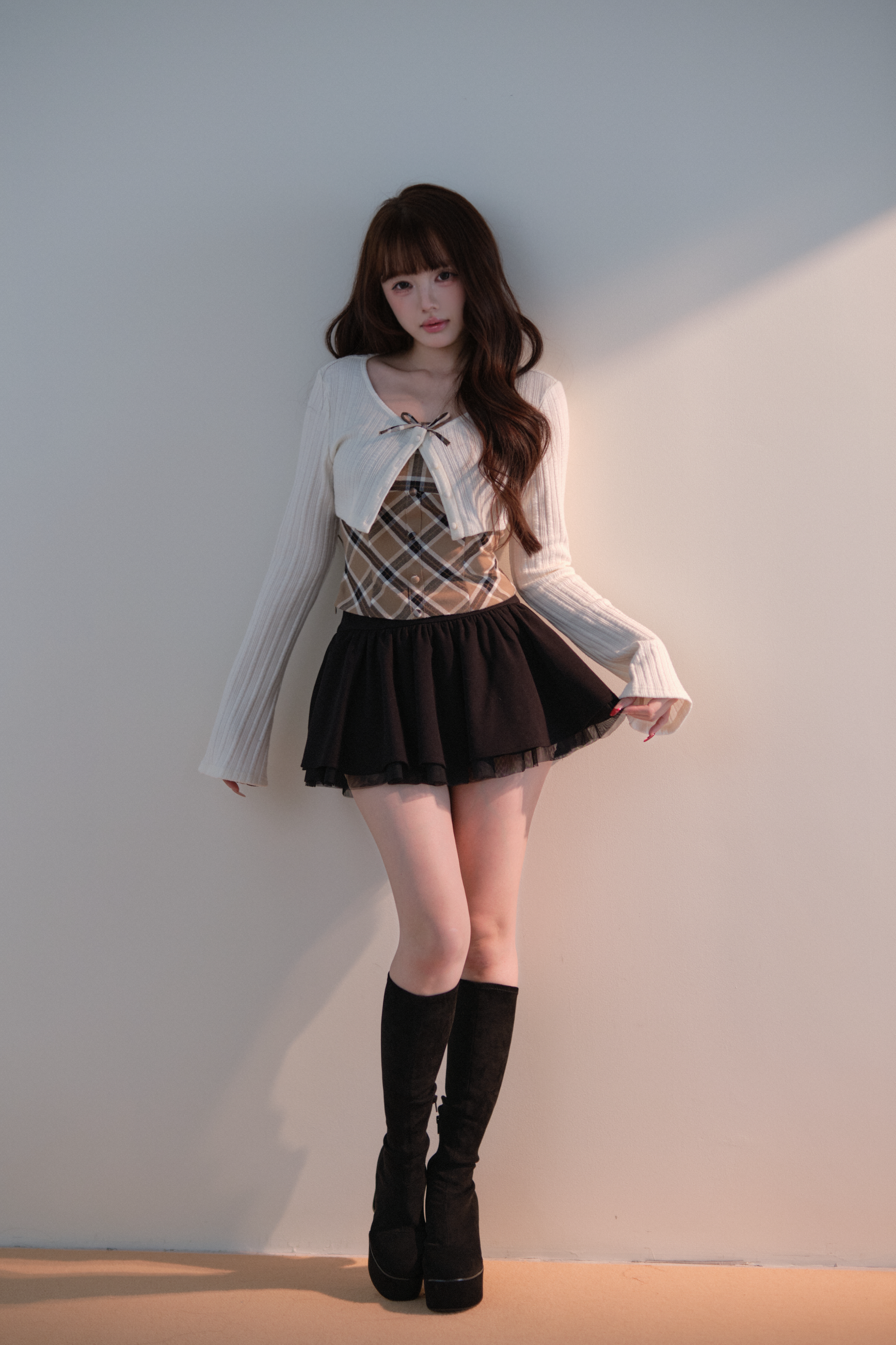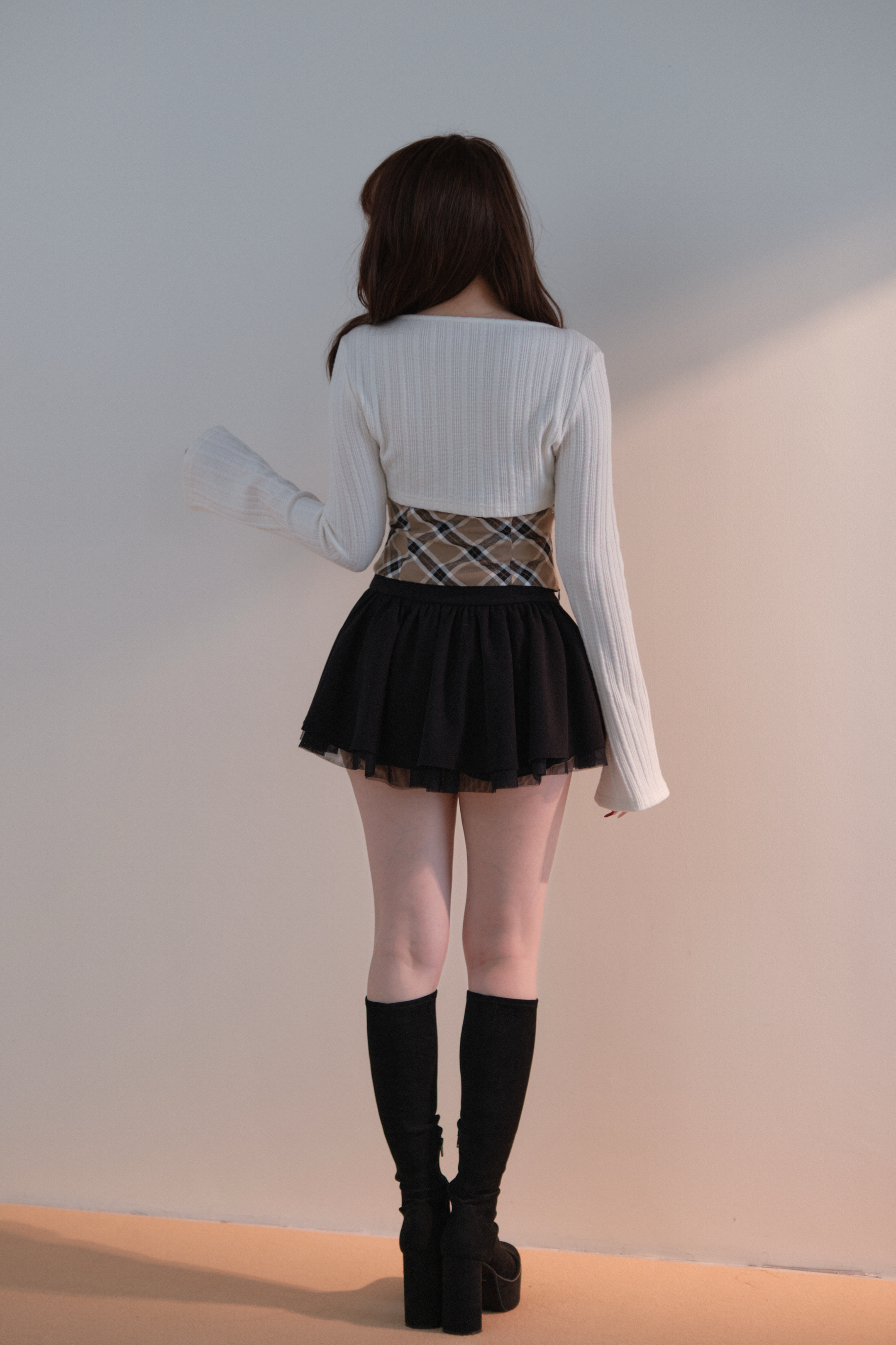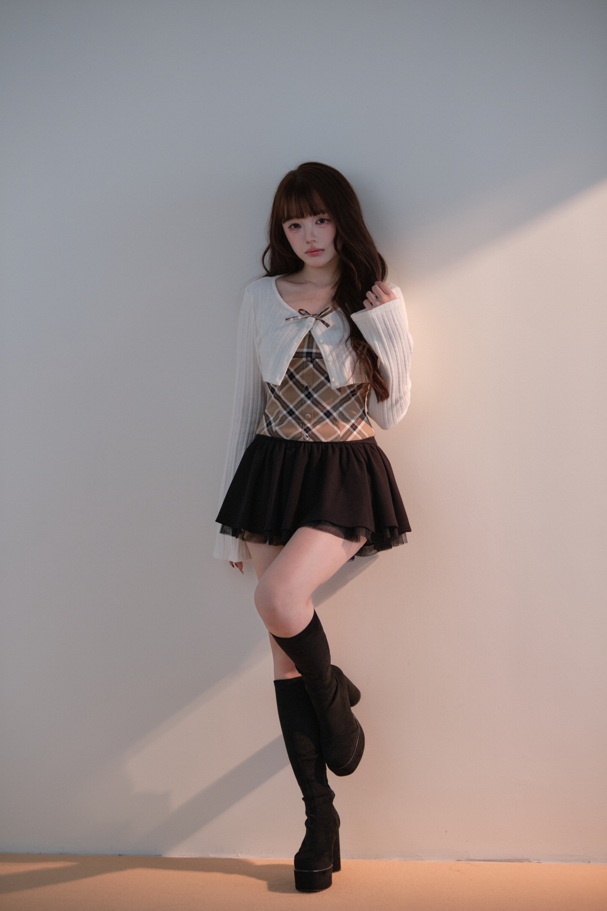 A well-balanced two-piece set that combines a ribbed knit bolero and a checked camisole.
