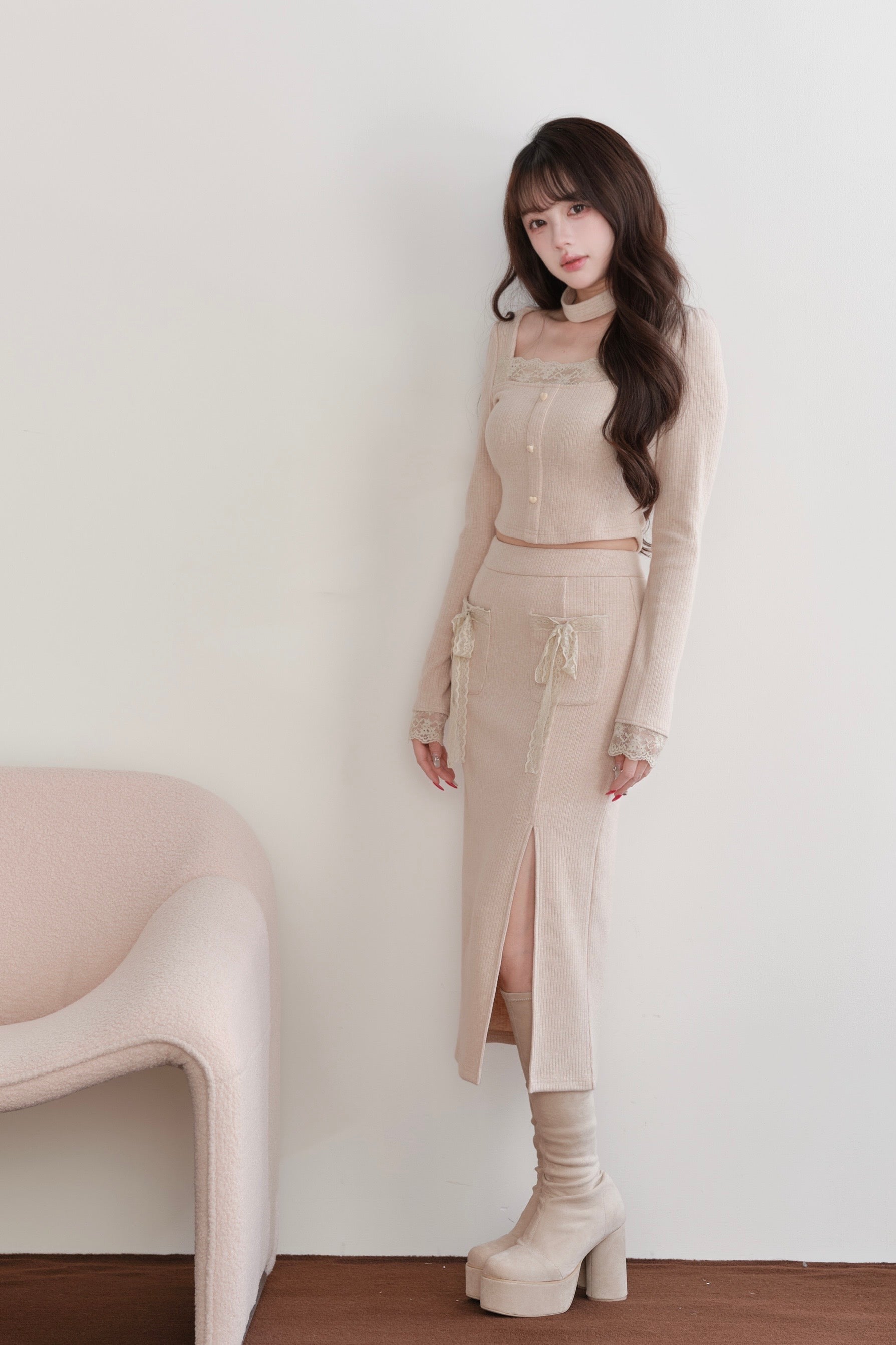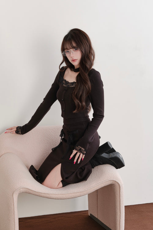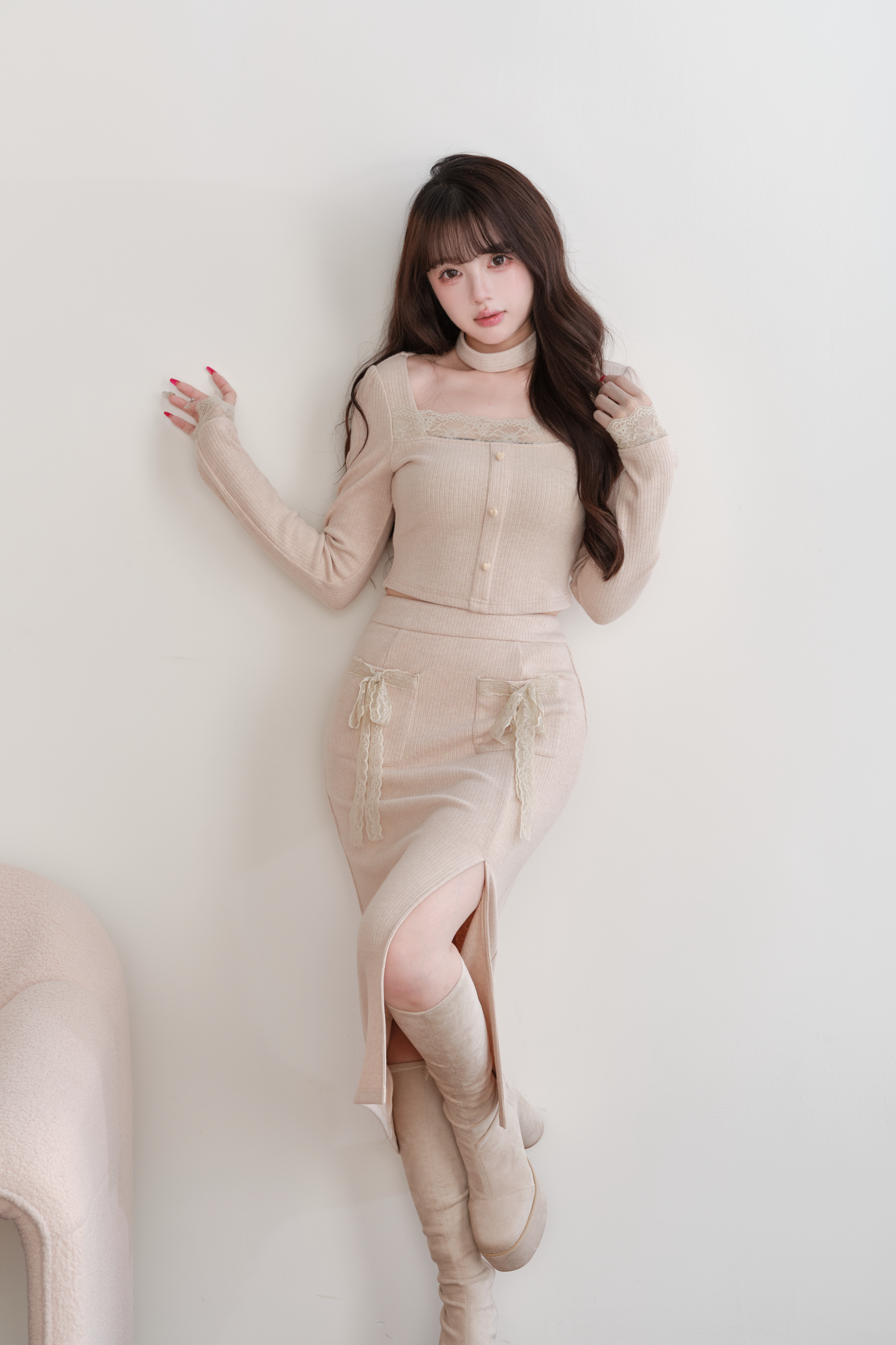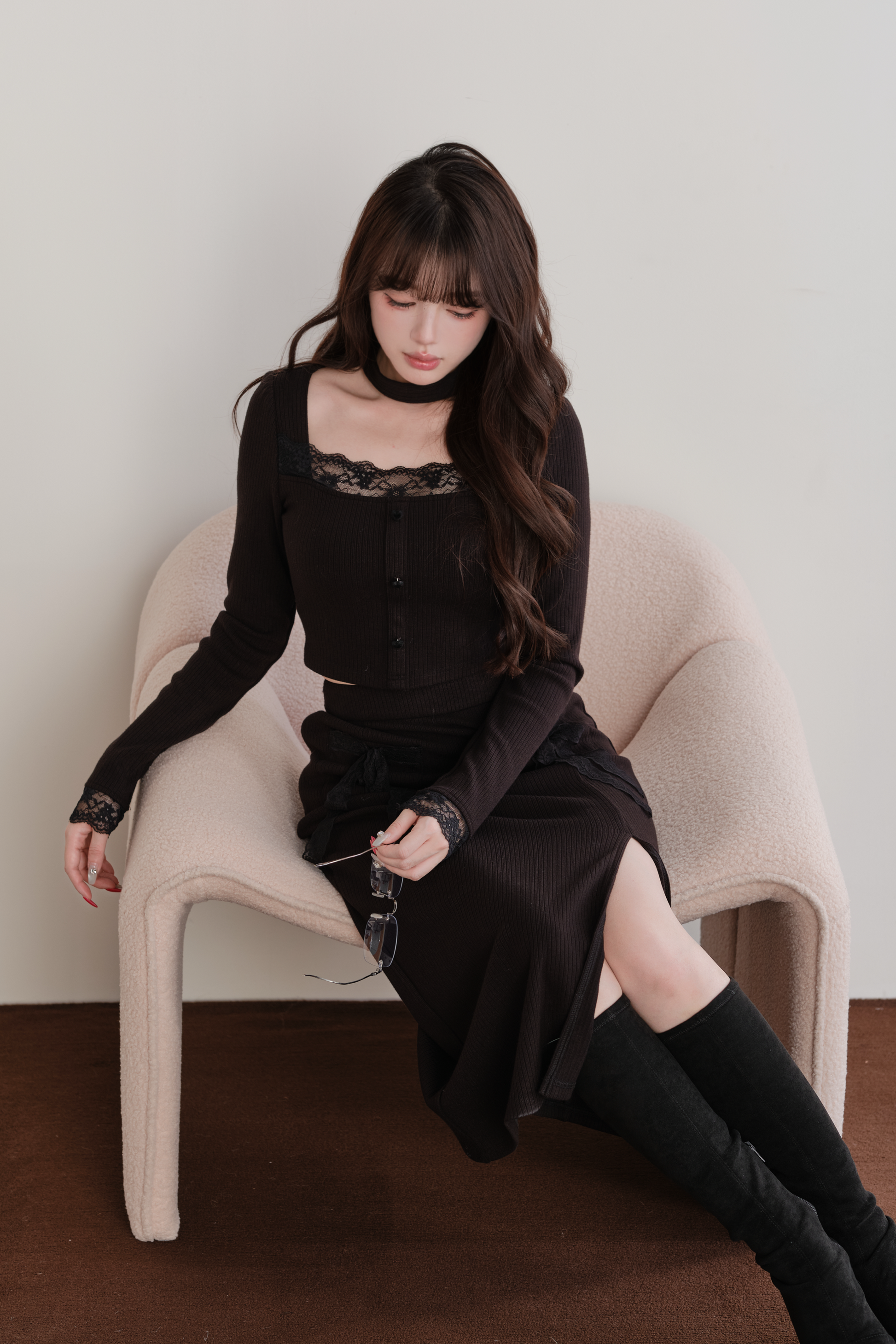 A knit top and long skirt set featuring an impressive lace and choker design. The square neckline flatters the décolleté beautifully, and the delicate lace accents create an elegant and feminine look.
