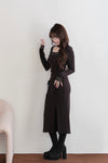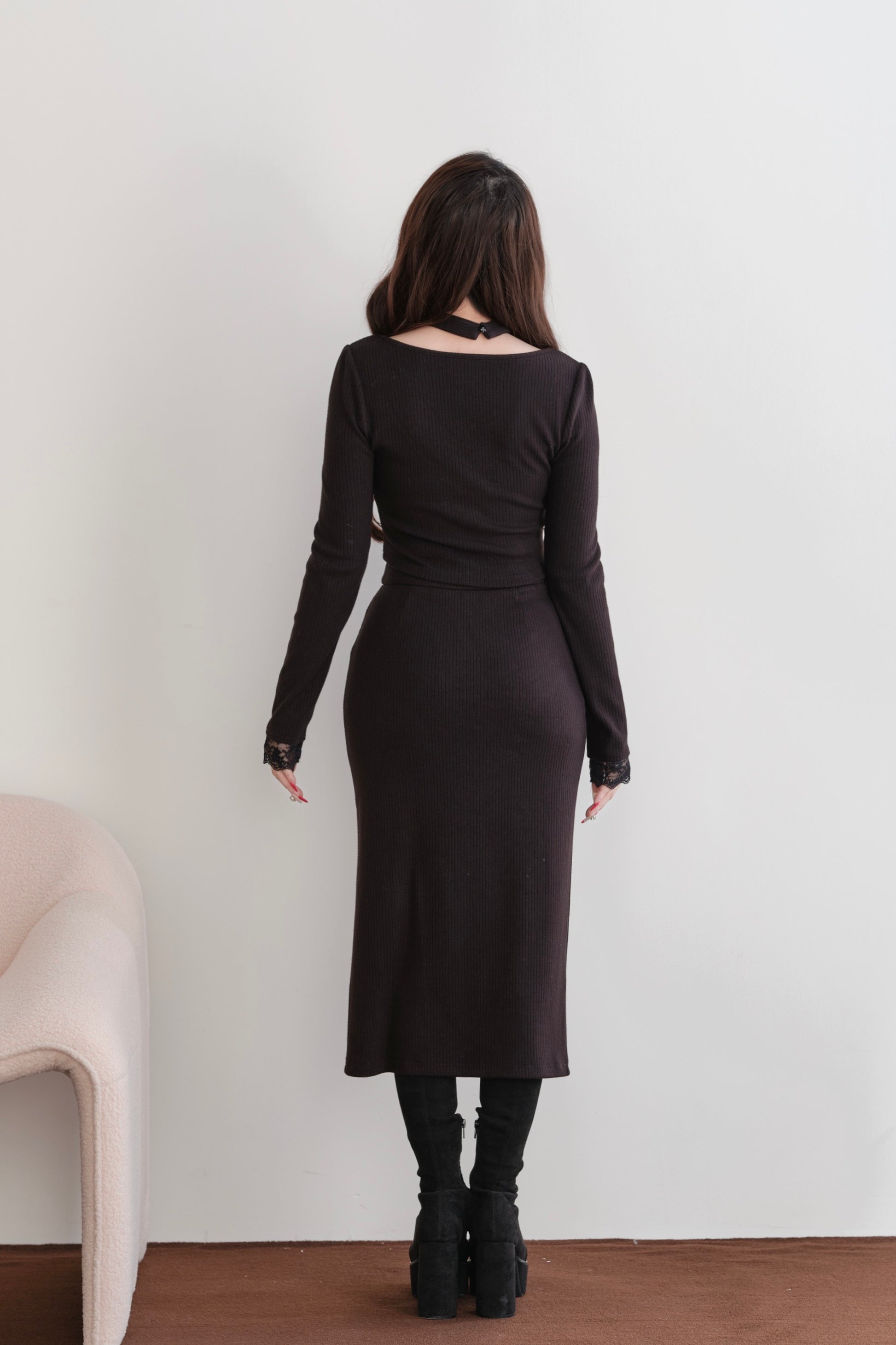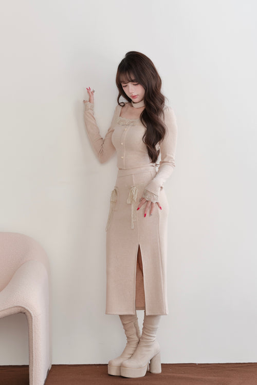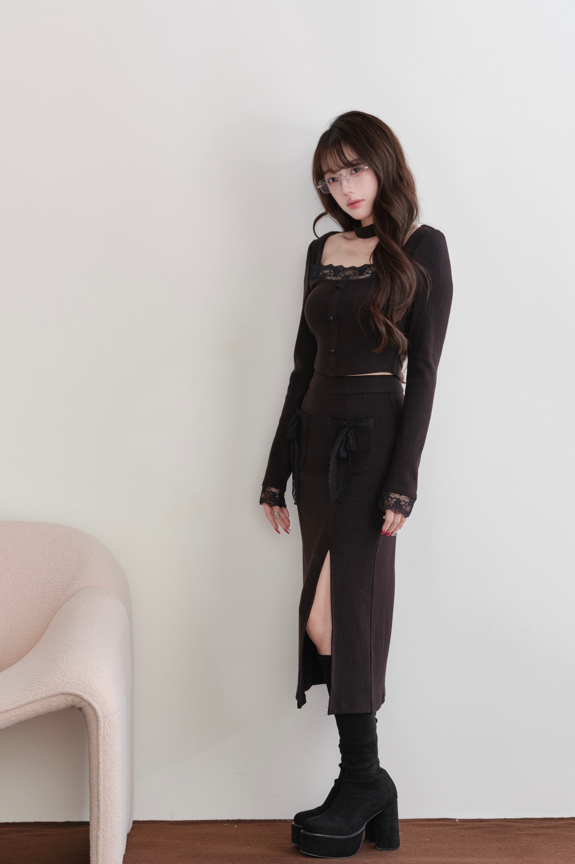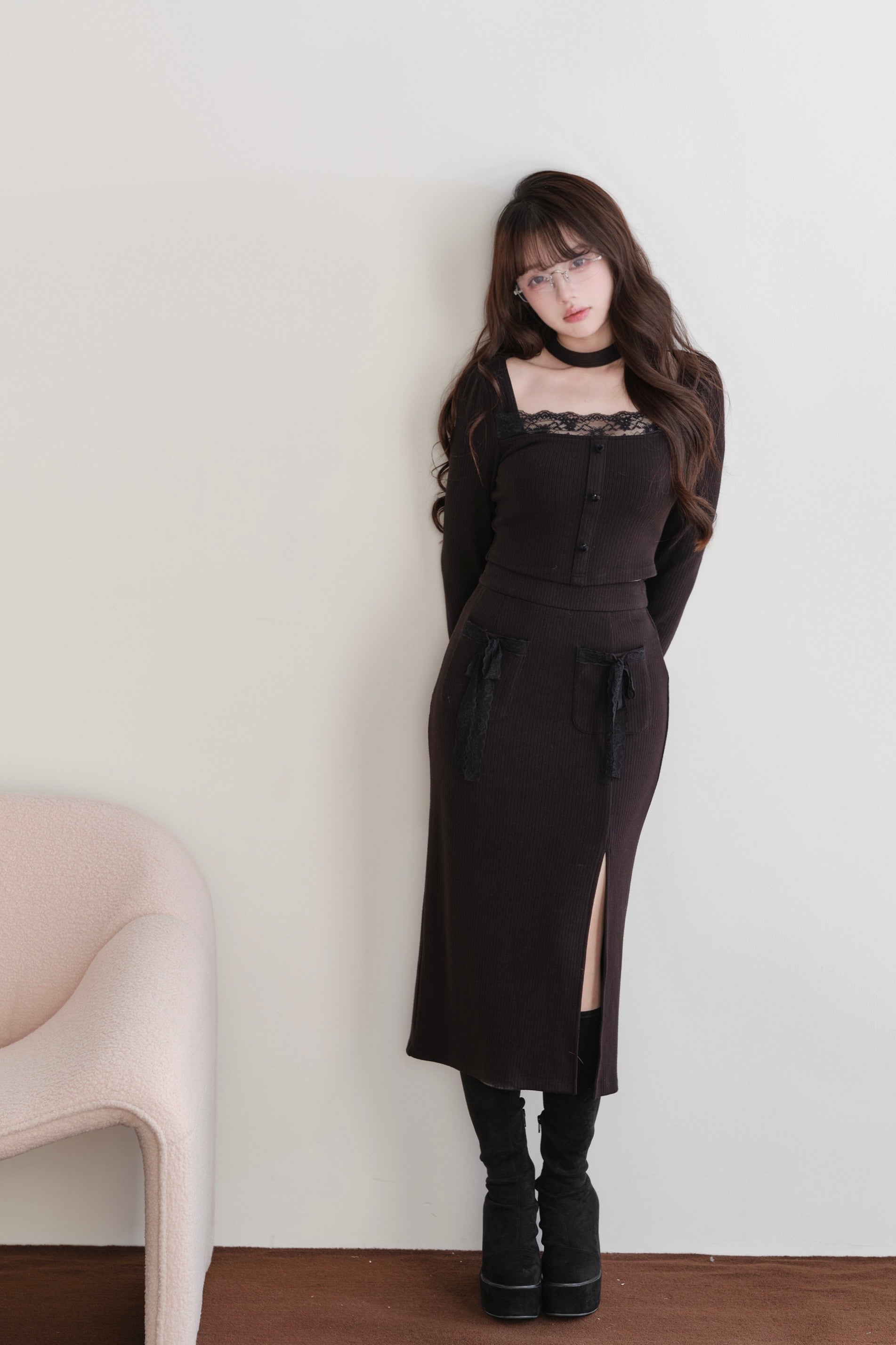 A knit top and long skirt set featuring an impressive lace and choker design. The square neckline flatters the décolleté beautifully, and the delicate lace accents create an elegant and feminine look.