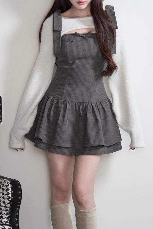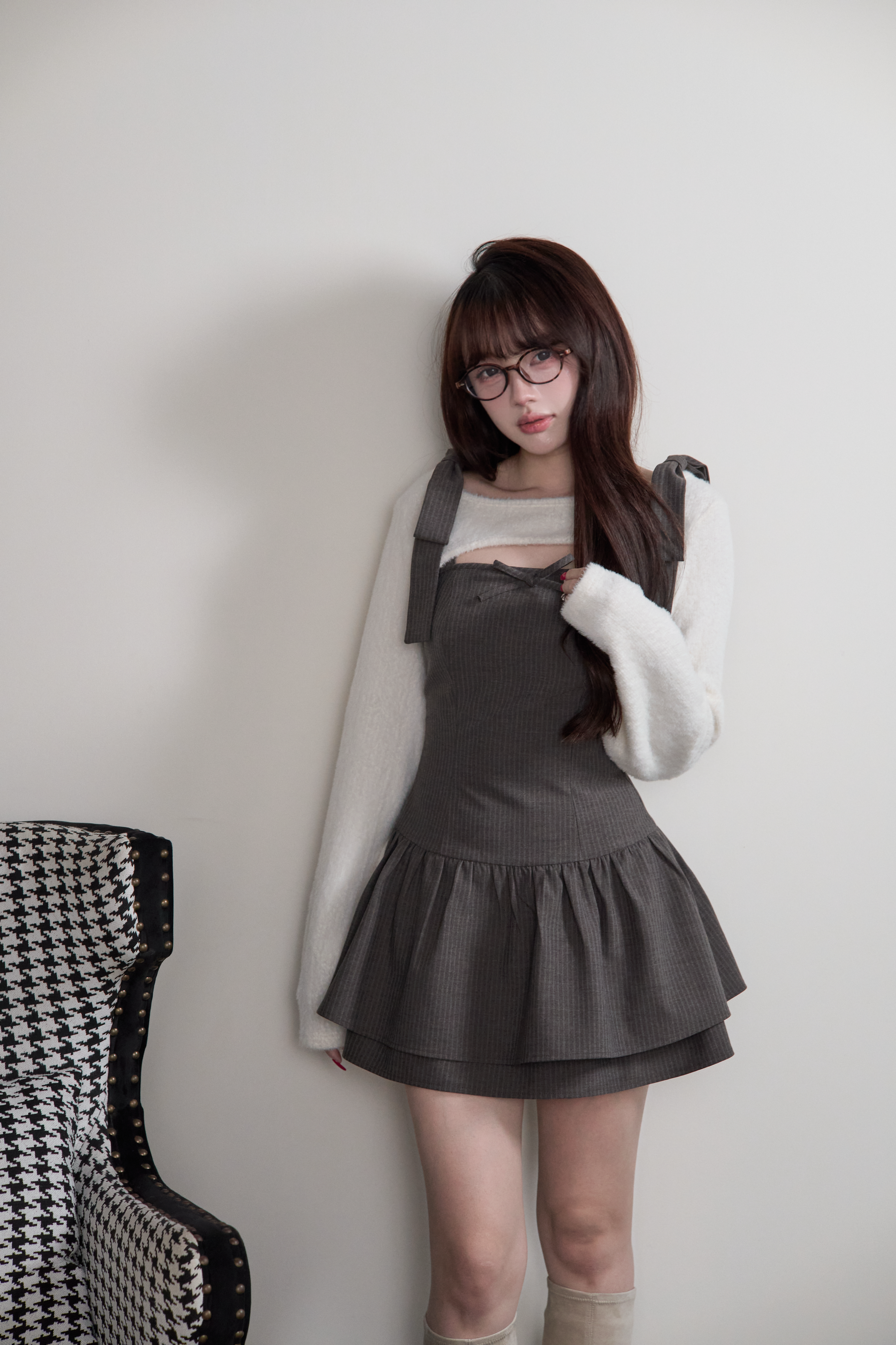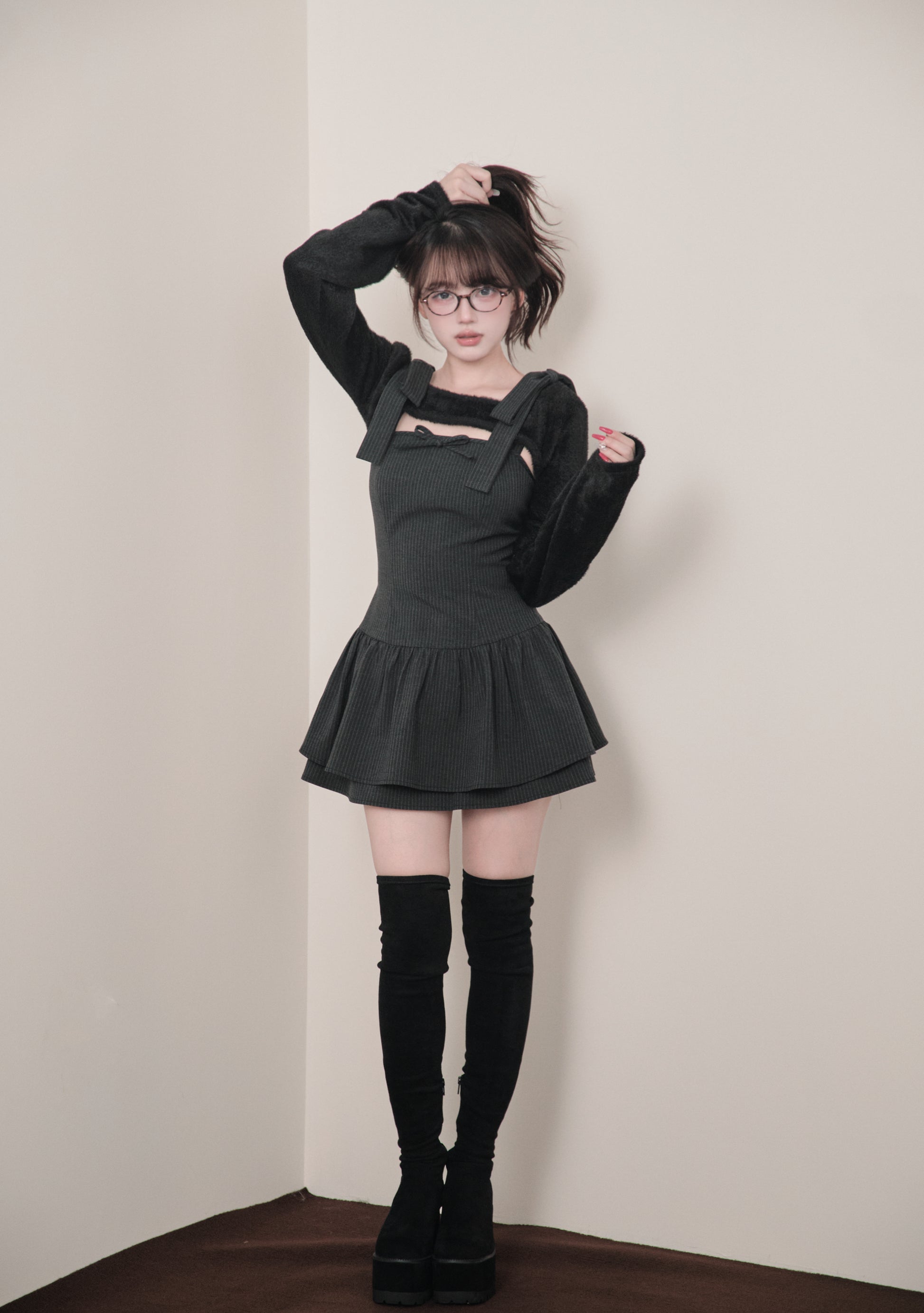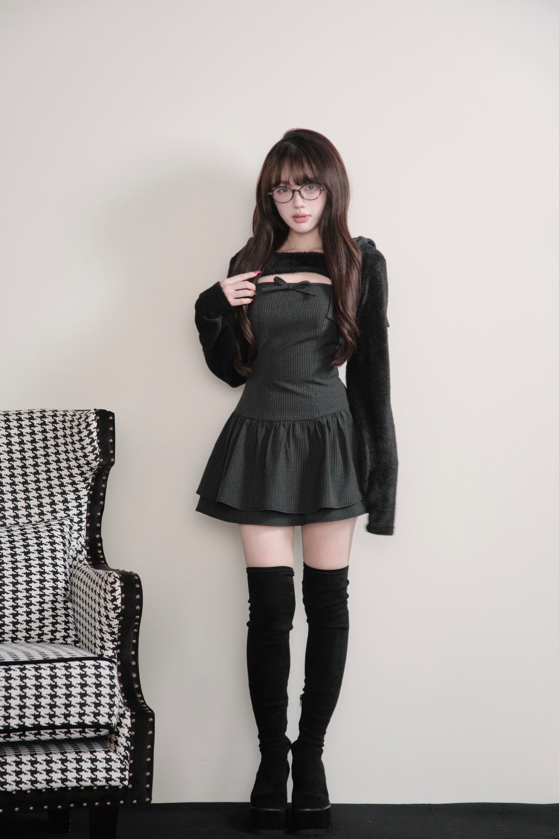 The dress is elegantly finished with a fine striped pattern and a fitted silhouette that shows off a slim waistline. The cut and ribbon detail on the chest add a subtle accent, giving it a cute yet mature look.
