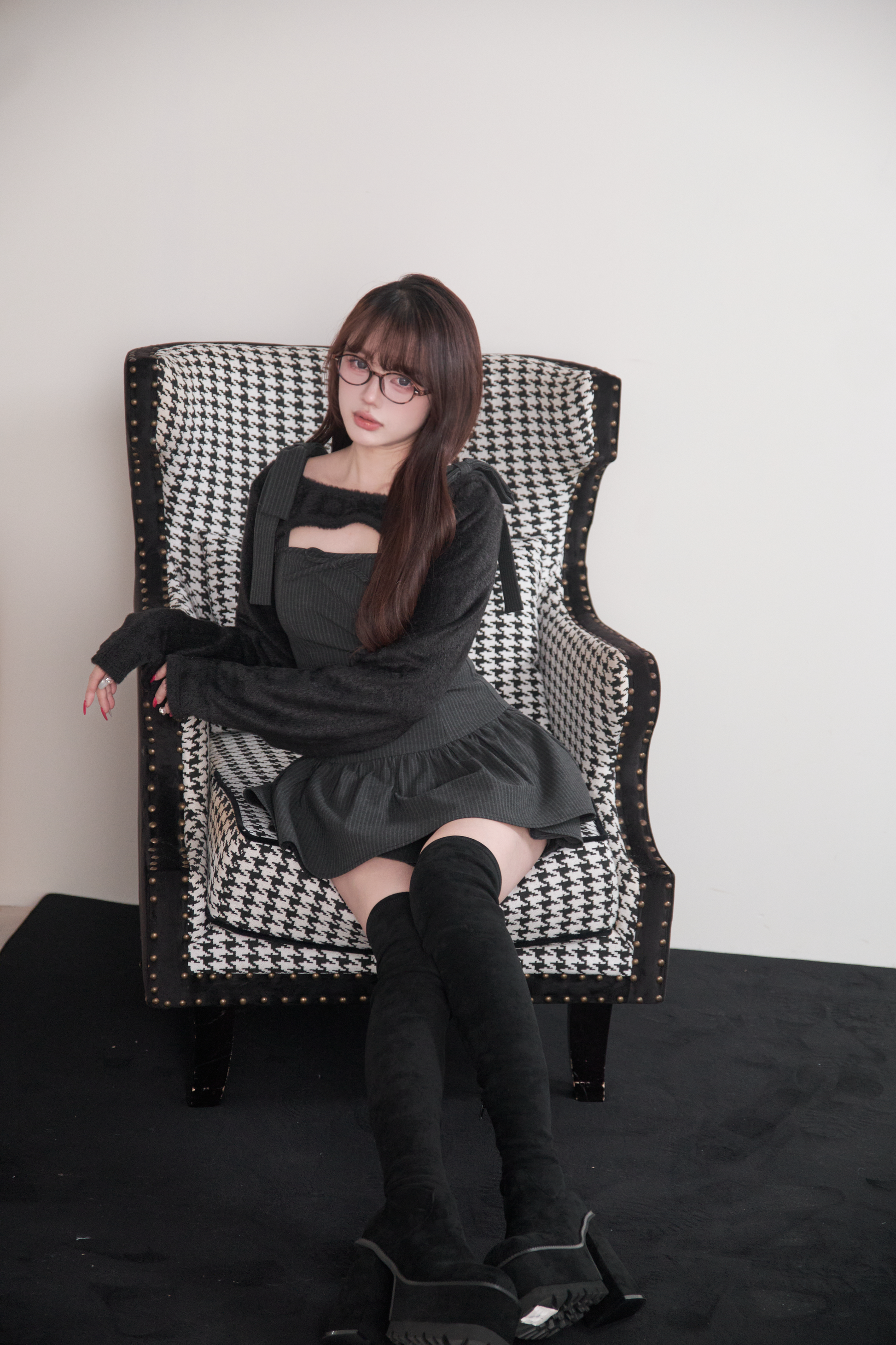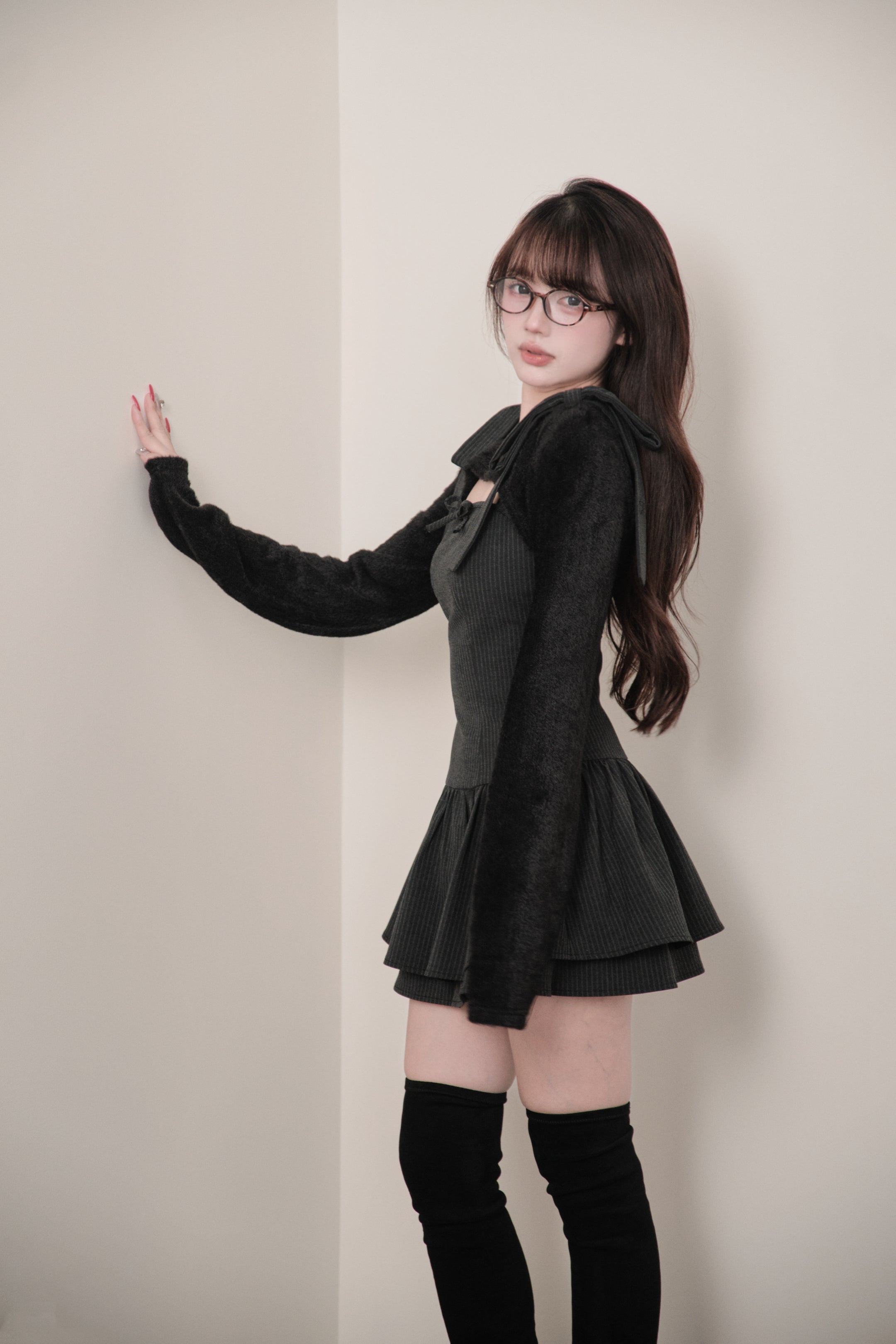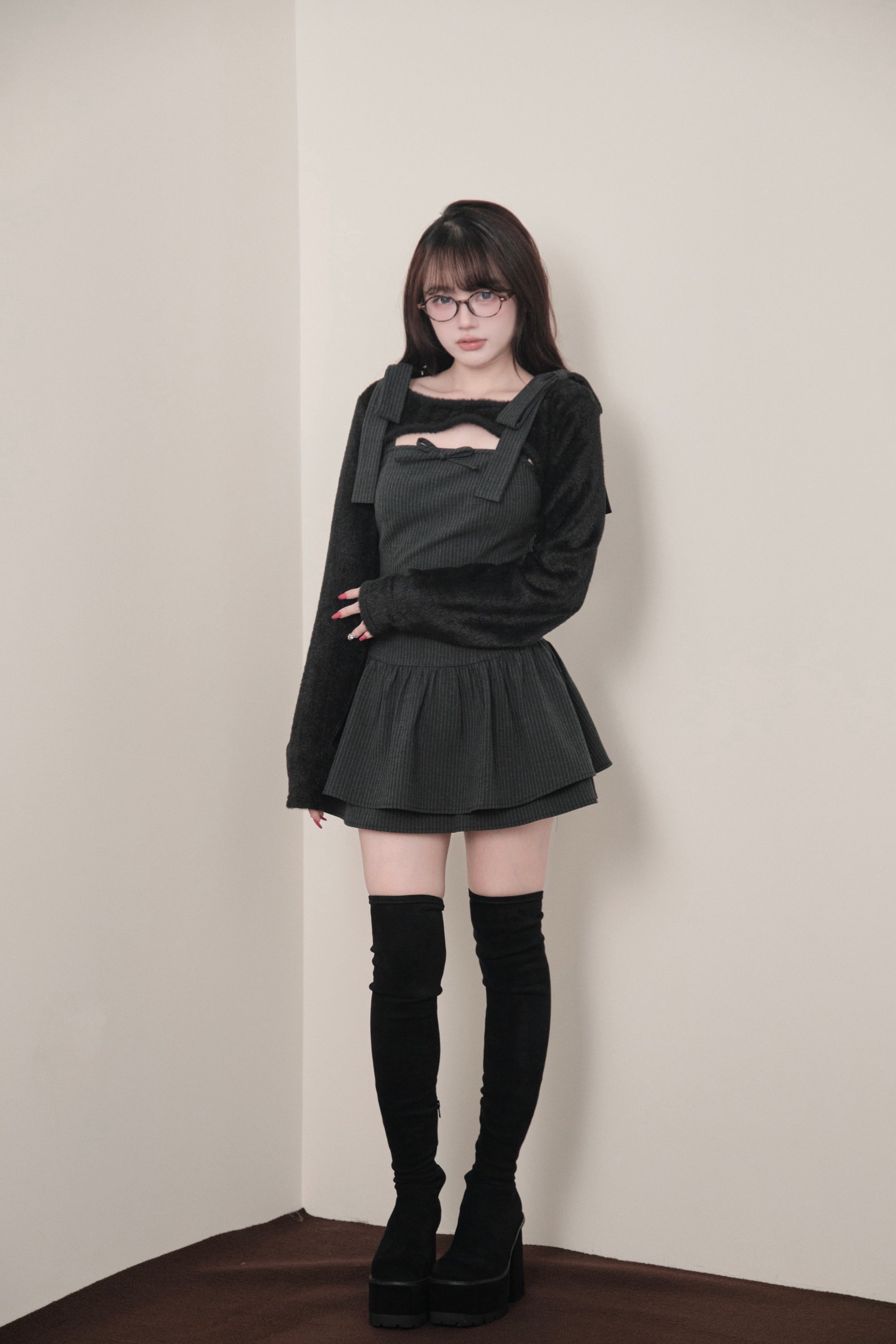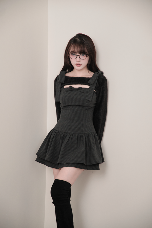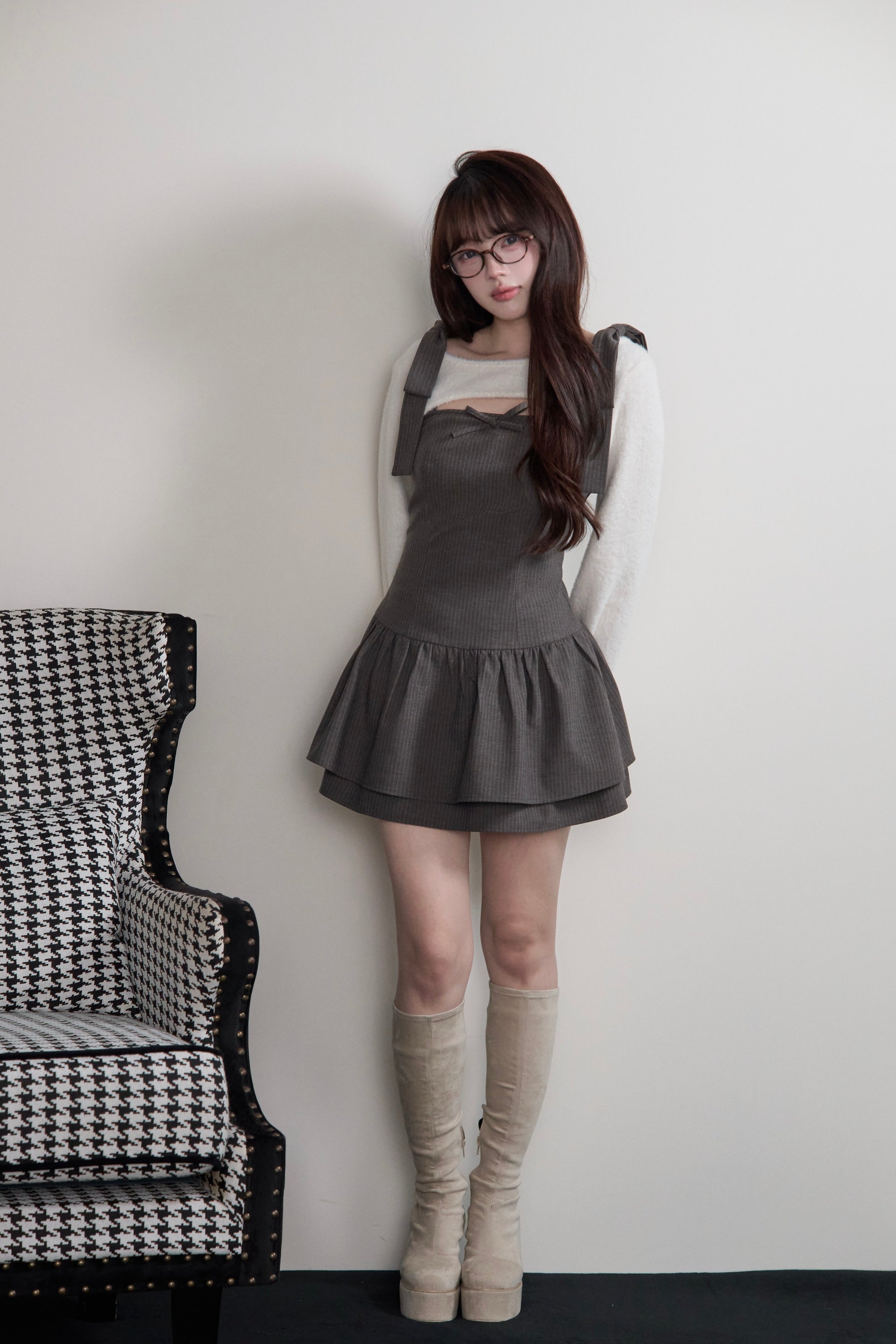 The dress is elegantly finished with a fine striped pattern and a fitted silhouette that shows off a slim waistline. The cut and ribbon detail on the chest add a subtle accent, giving it a cute yet mature look.