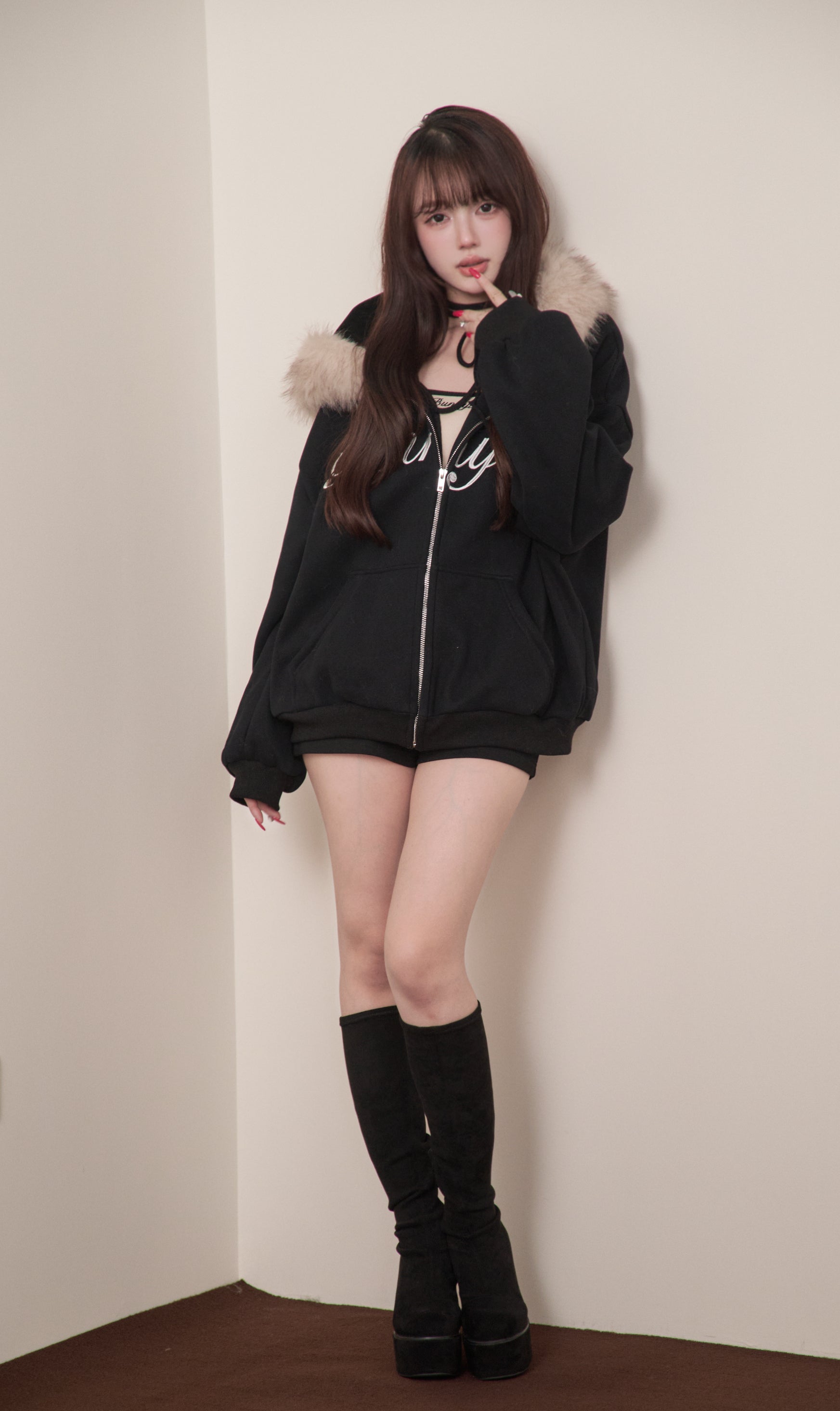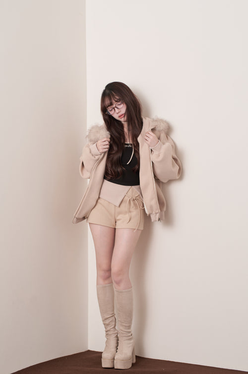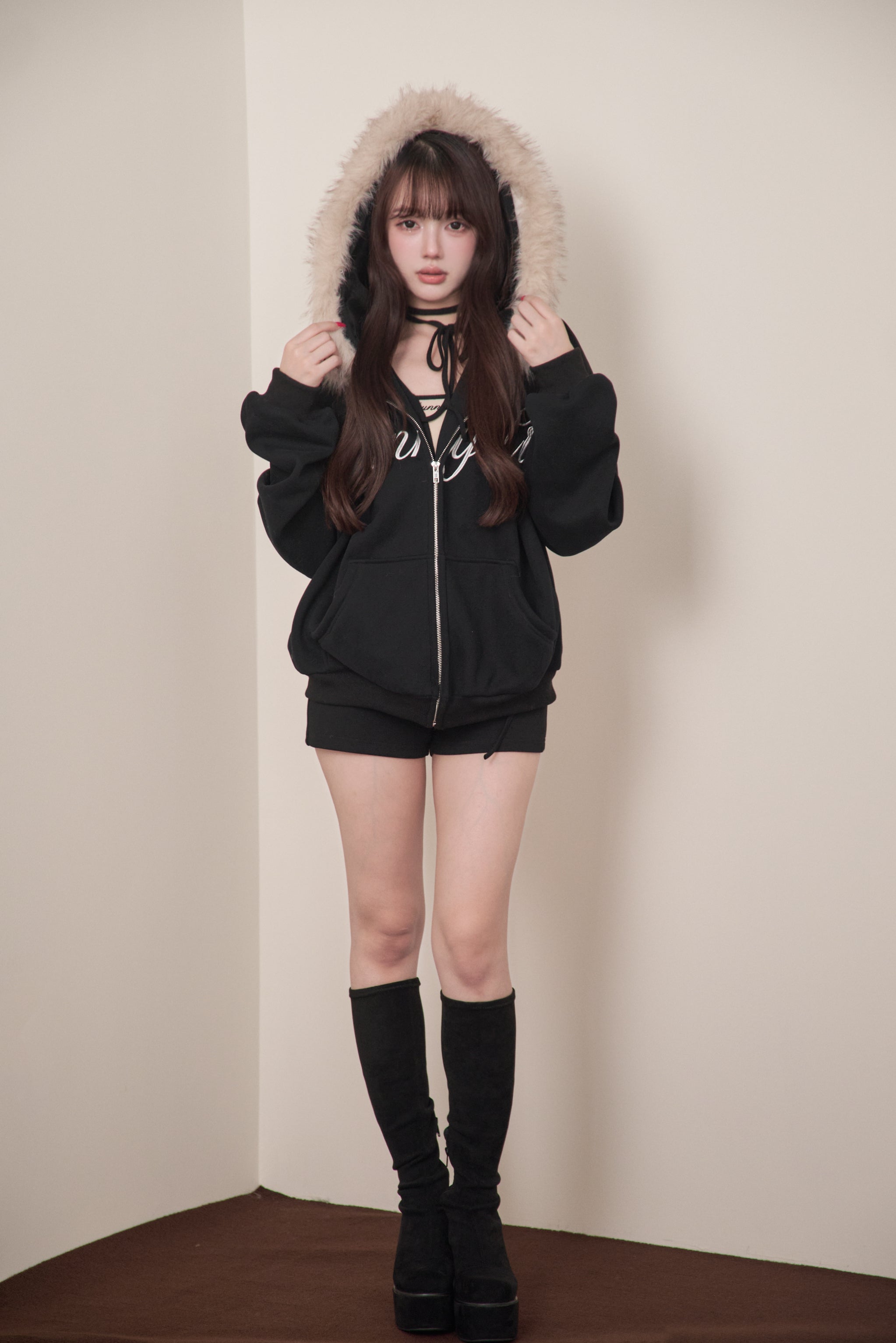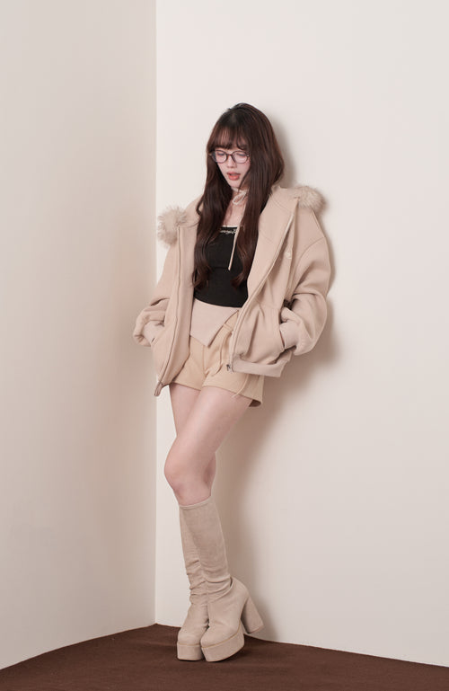 The fur is voluminous, yet casts a soft shadow around the face, making it perfect for photos. We also recommend unzipping it to reveal the inner layer, creating a perfect balance of sweetness and sexiness.