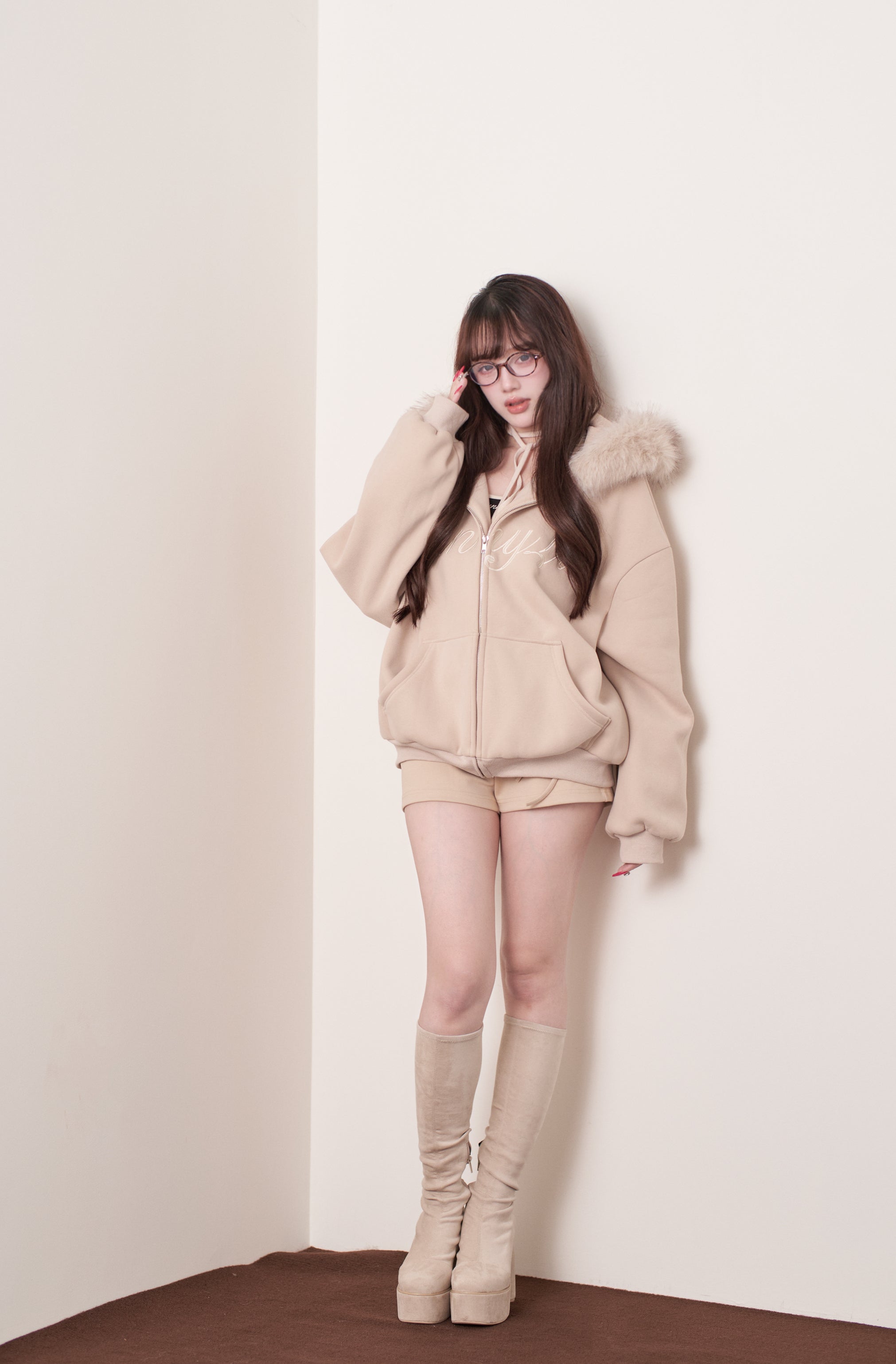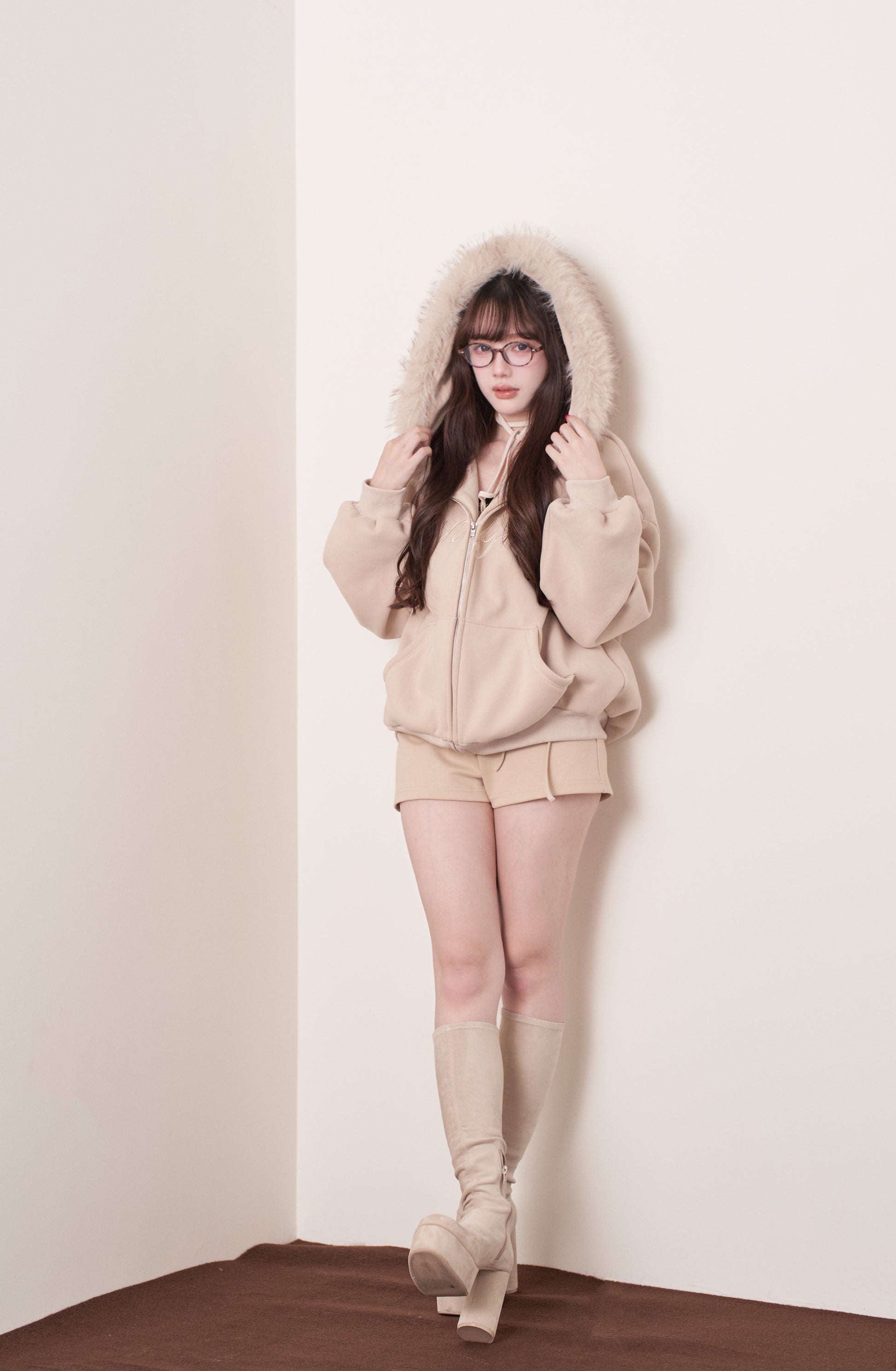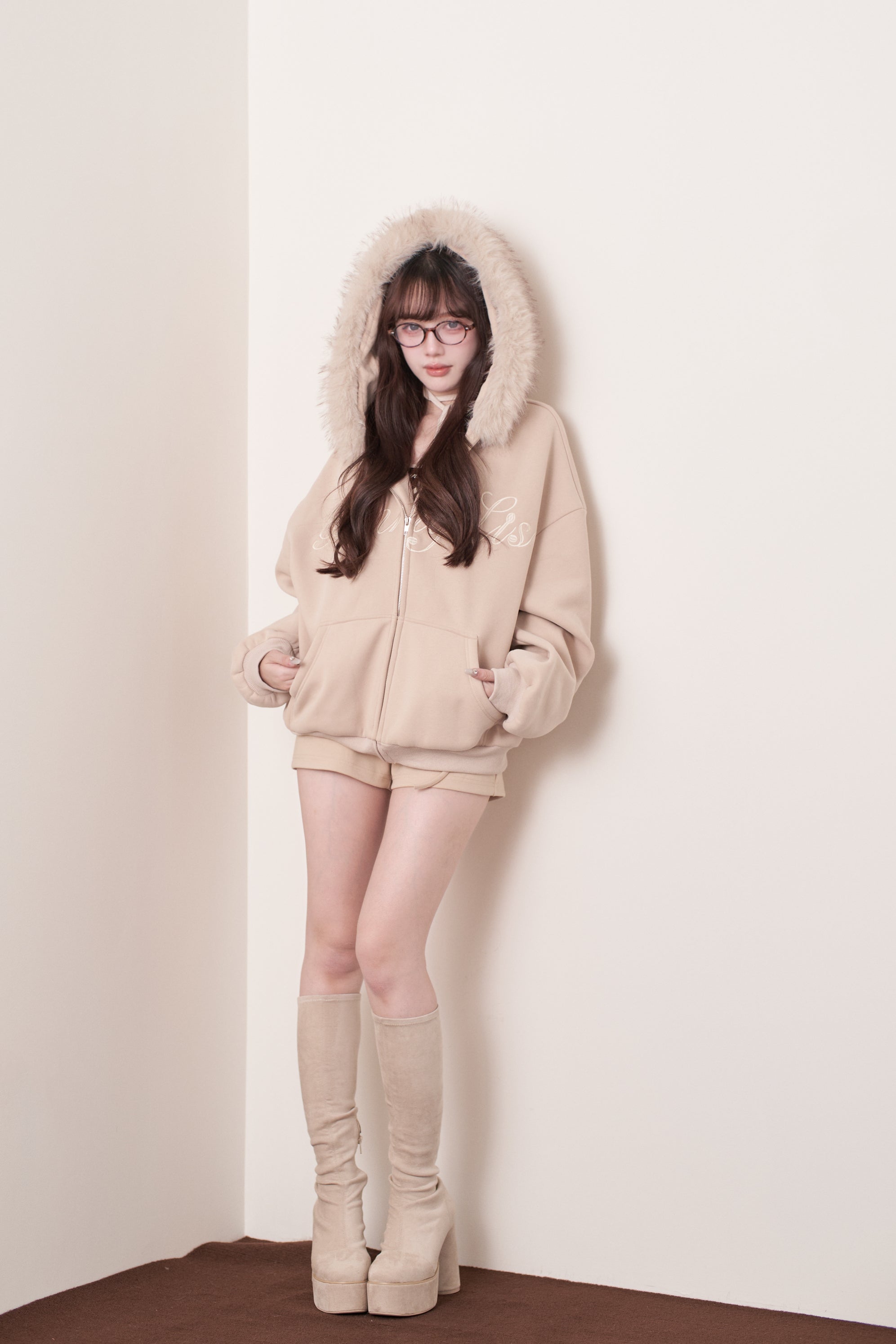 The fur is voluminous, yet casts a soft shadow around the face, making it perfect for photos. We also recommend unzipping it to reveal the inner layer, creating a perfect balance of sweetness and sexiness.