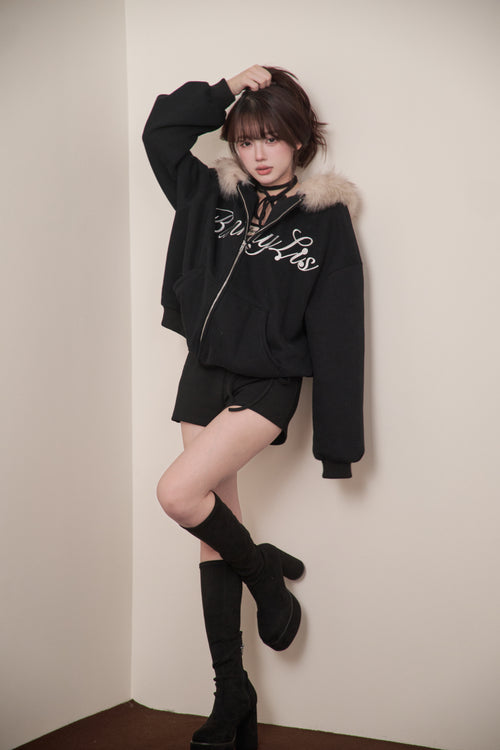 This fur-trimmed hoodie features fluffy fur that wraps around the hood, creating a striking silhouette.