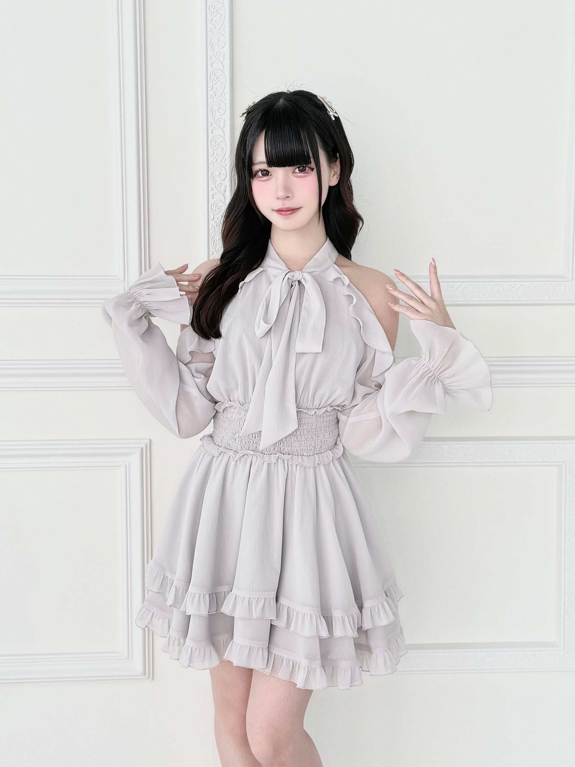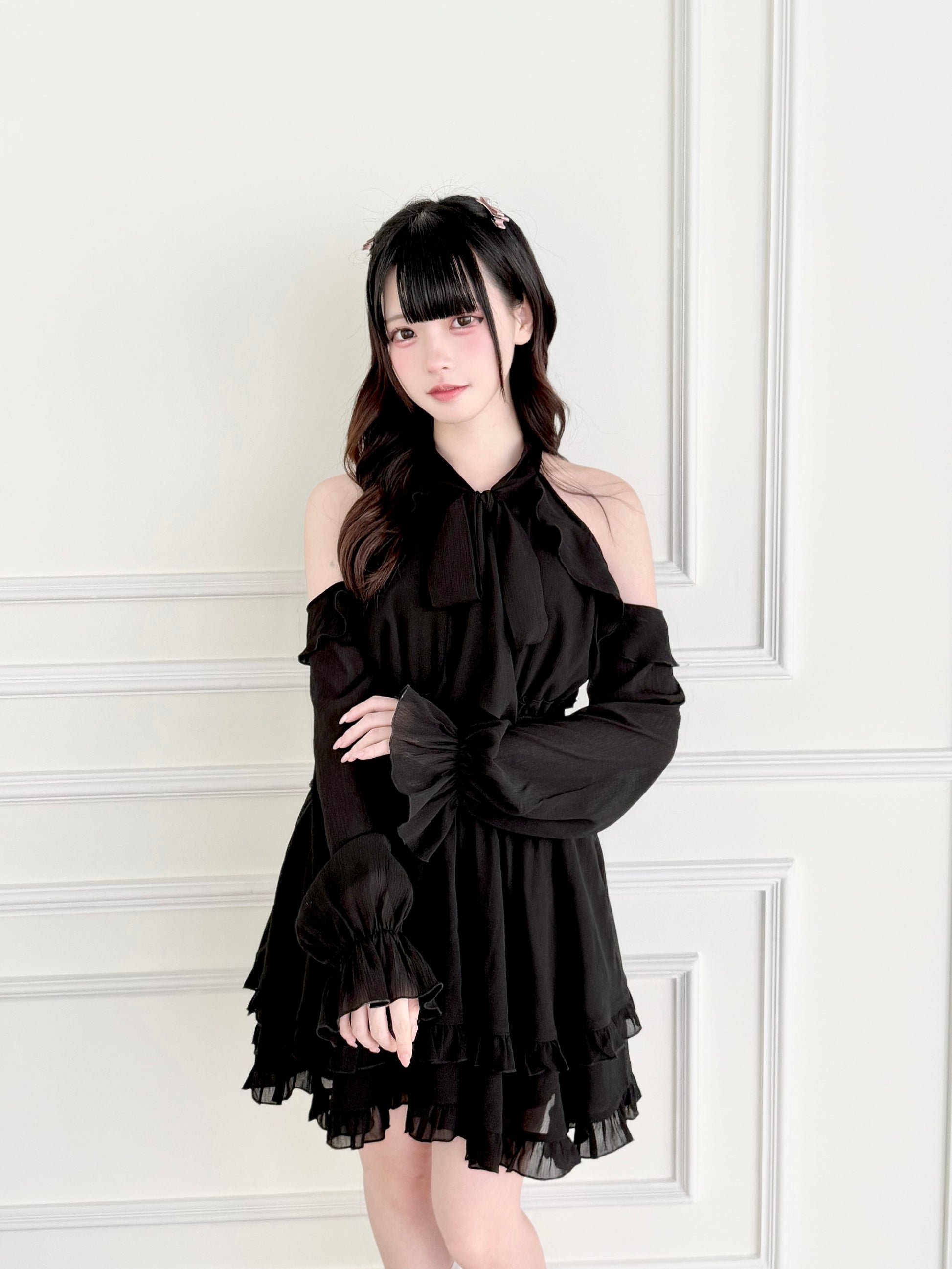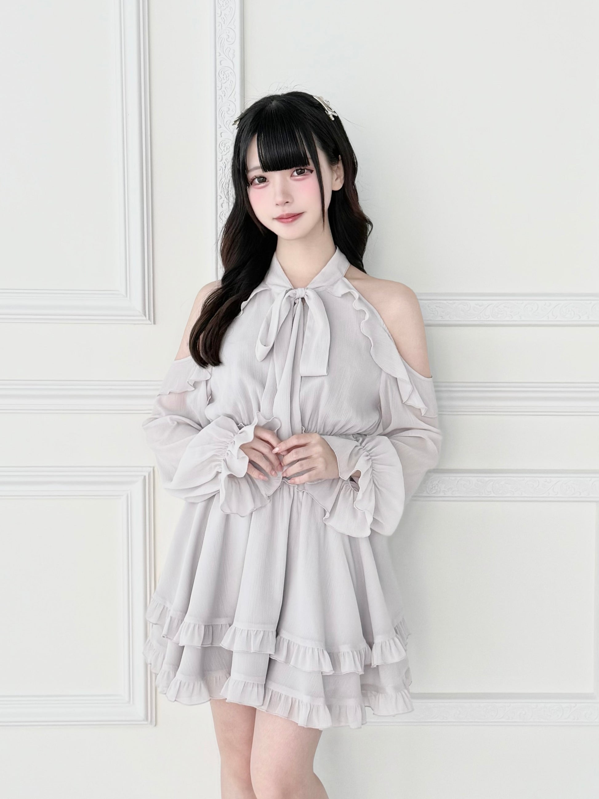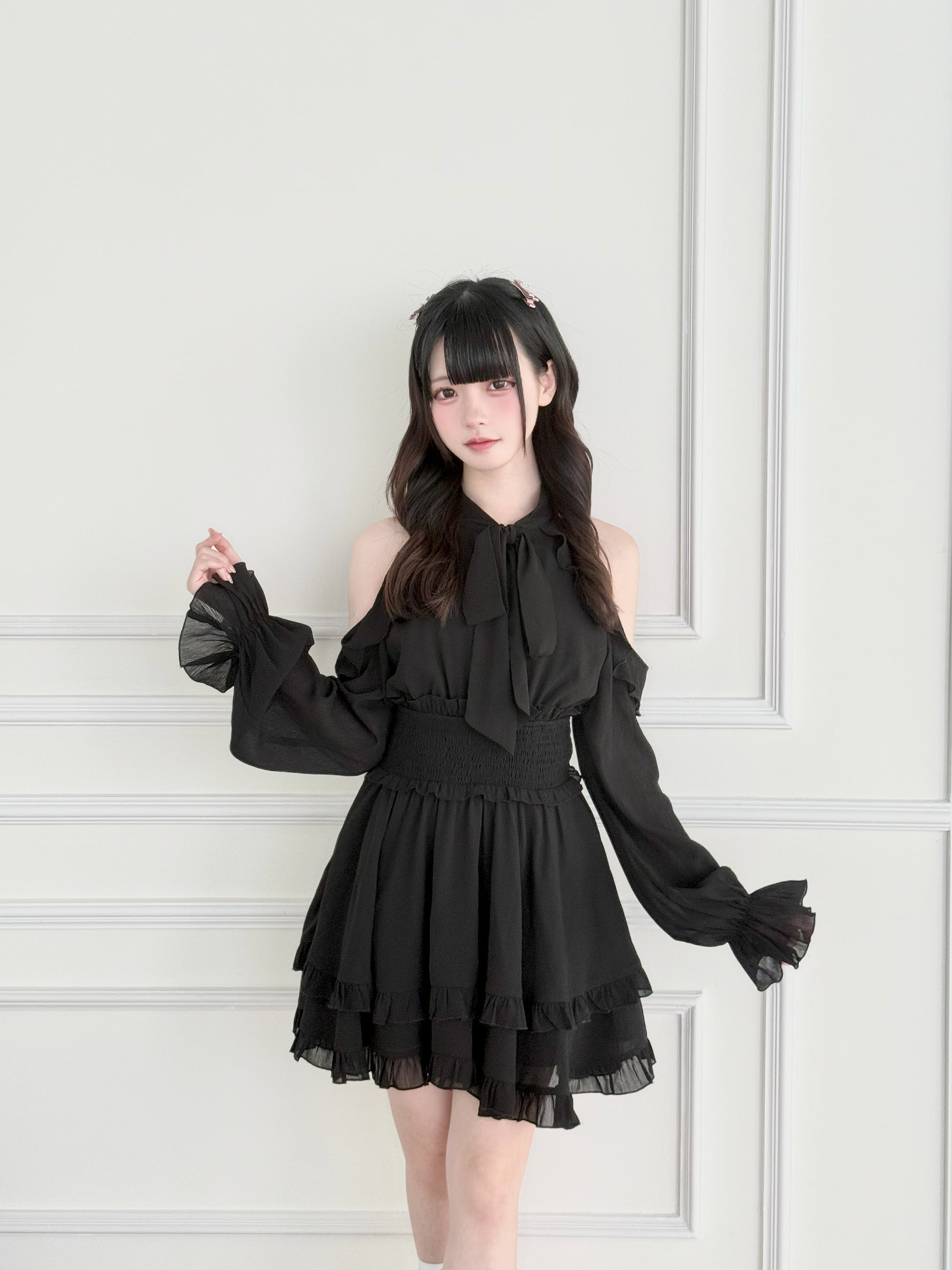 ふんわりとしたフリルがたっぷりあしらわれたオフショルダーワンピース。