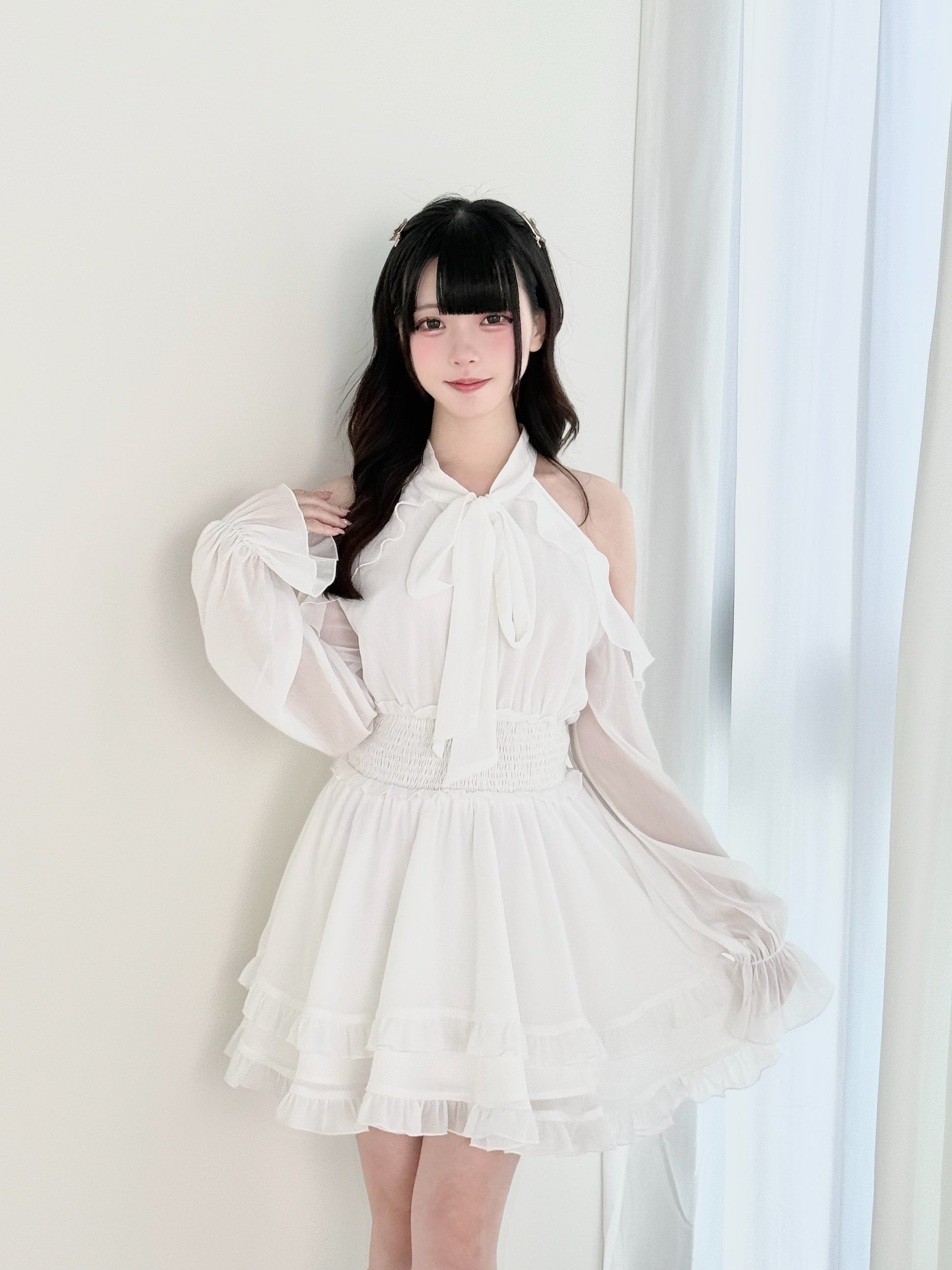 首元のリボンタイが愛らしいアクセントになり、フェミニンでガーリーな雰囲気を演出します。