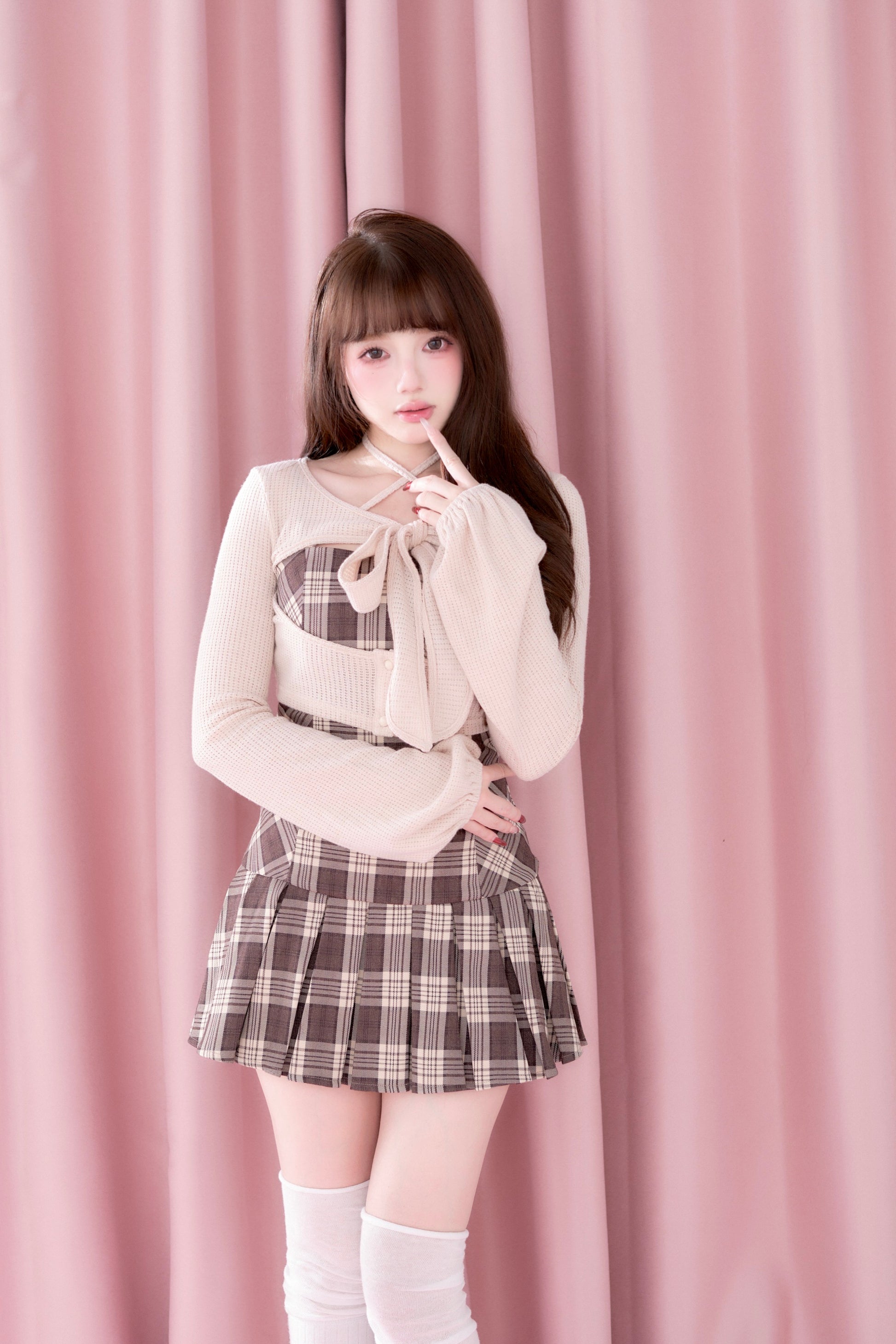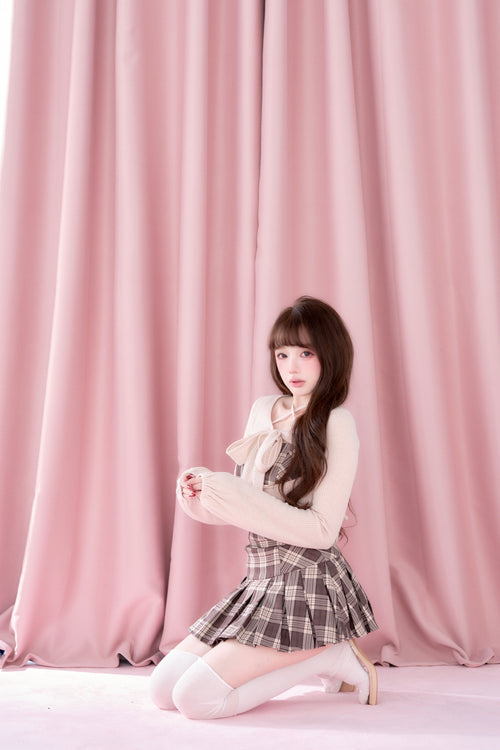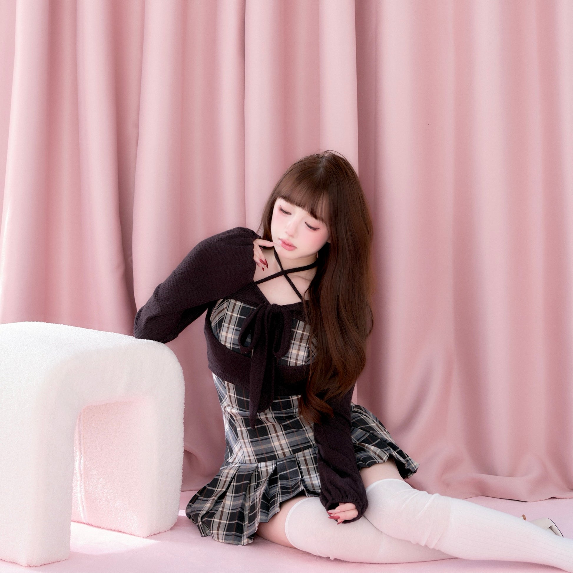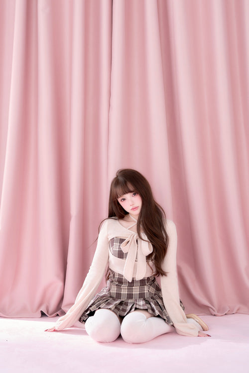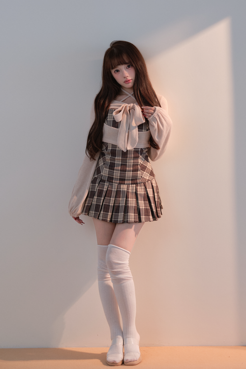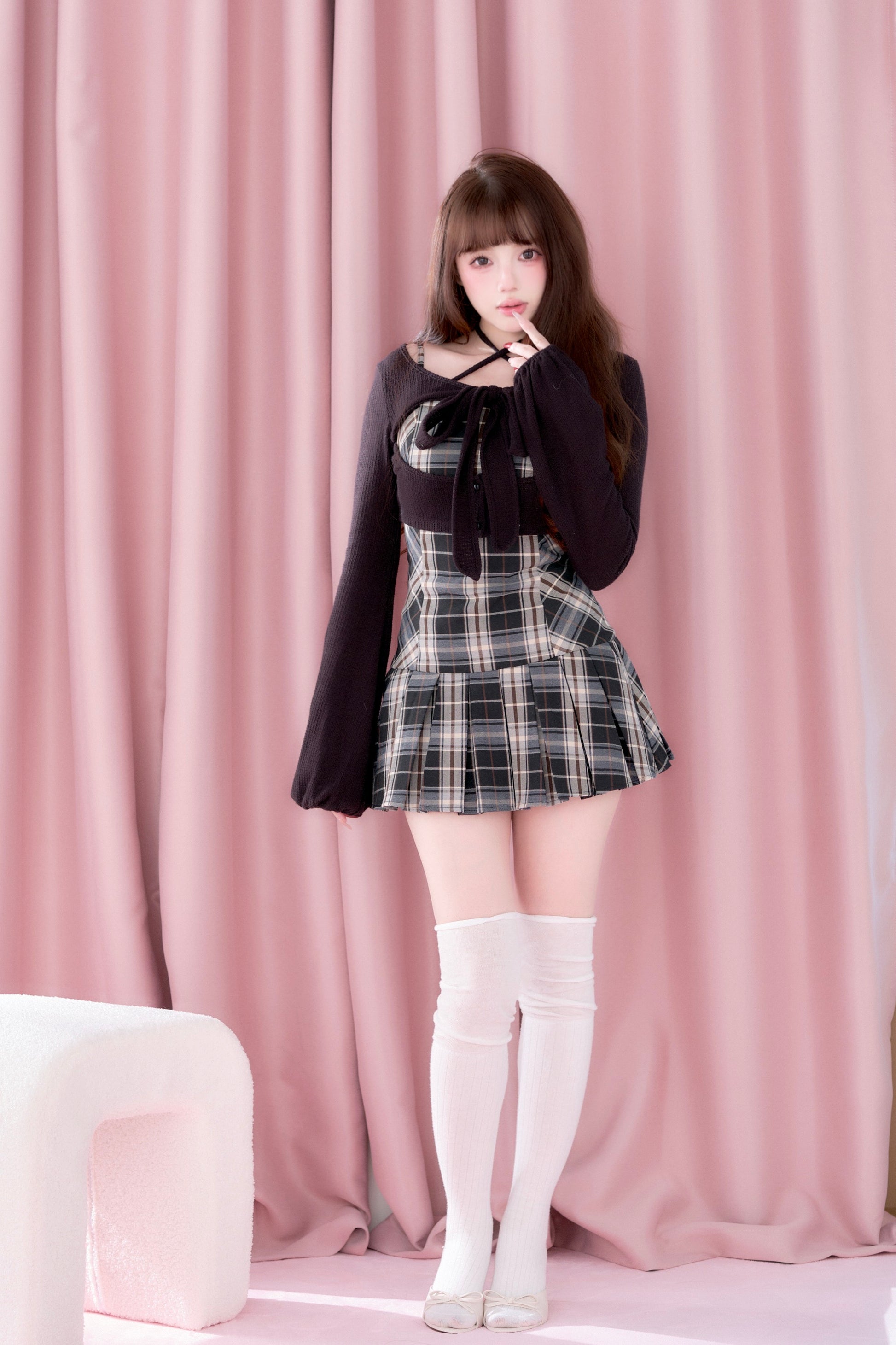 This set item combines a compact black knit top with a classic checked camisole dress to create a well-balanced outfit.