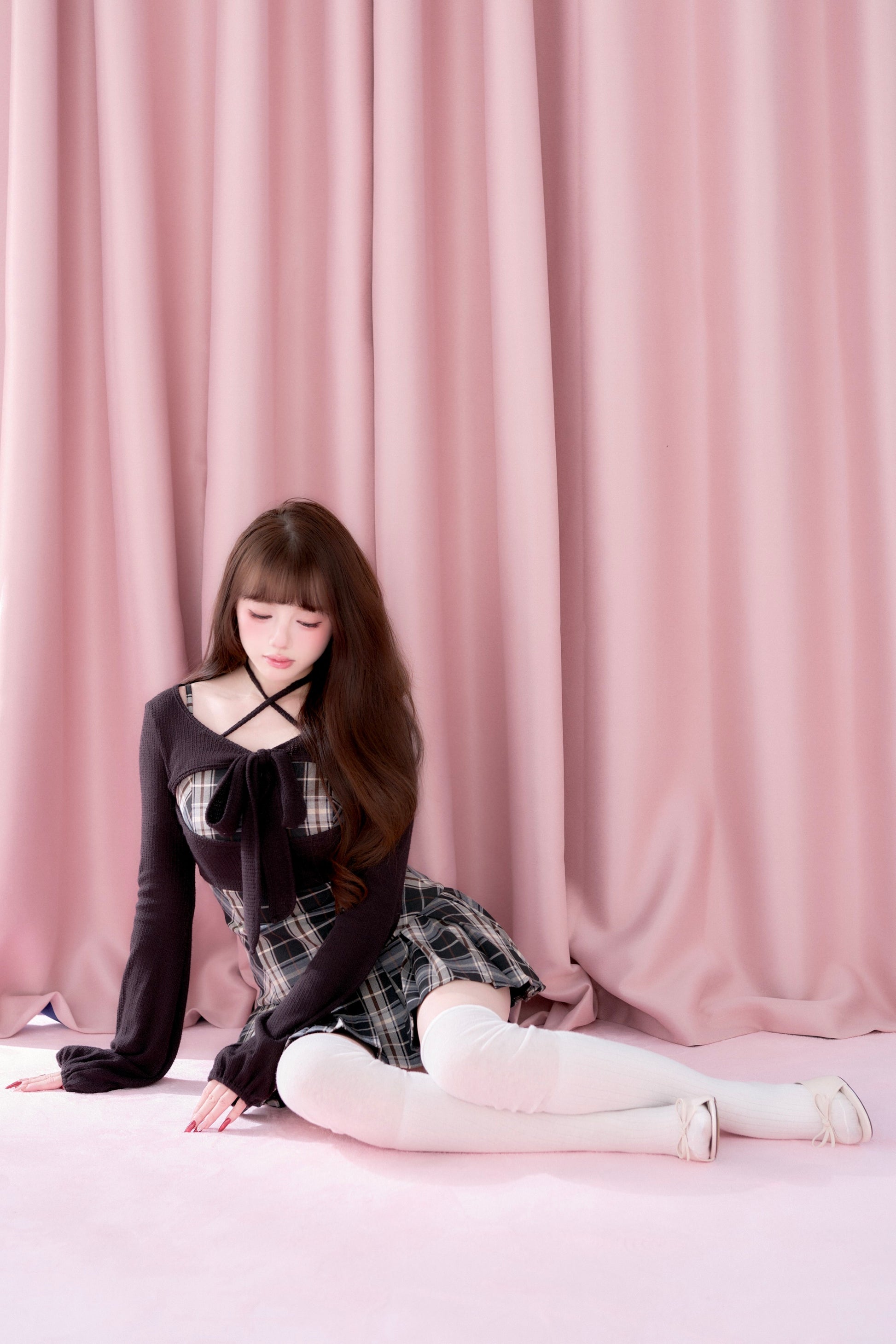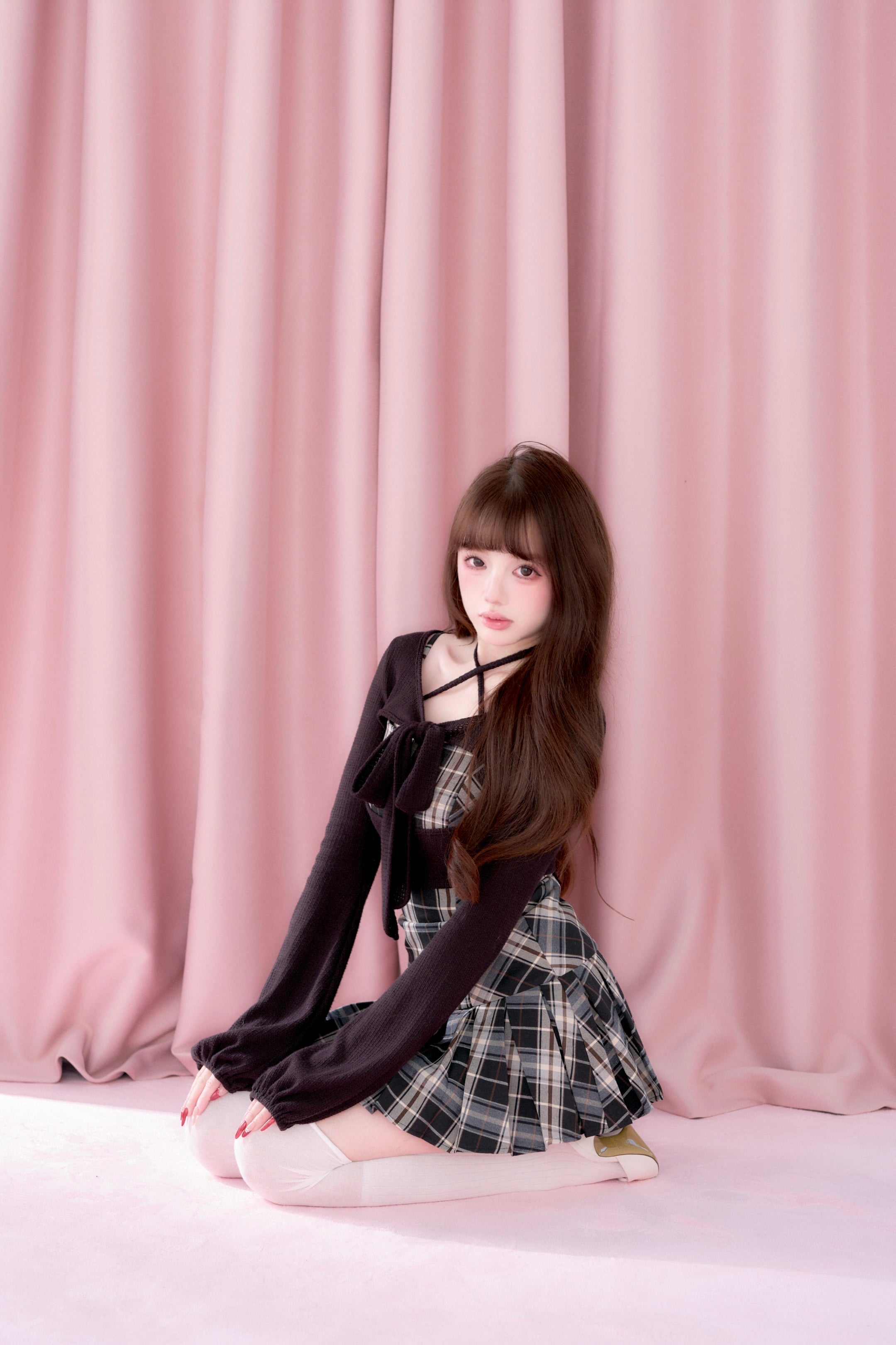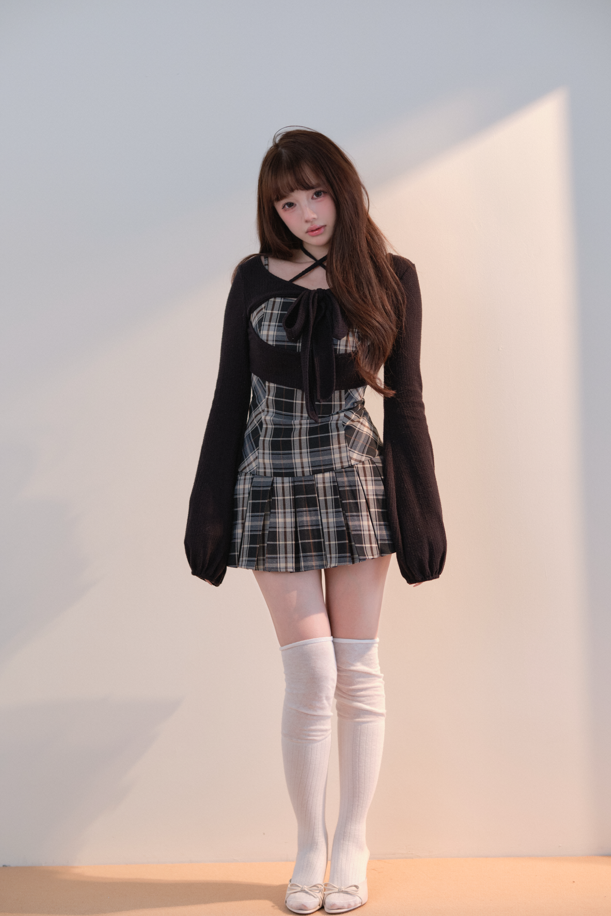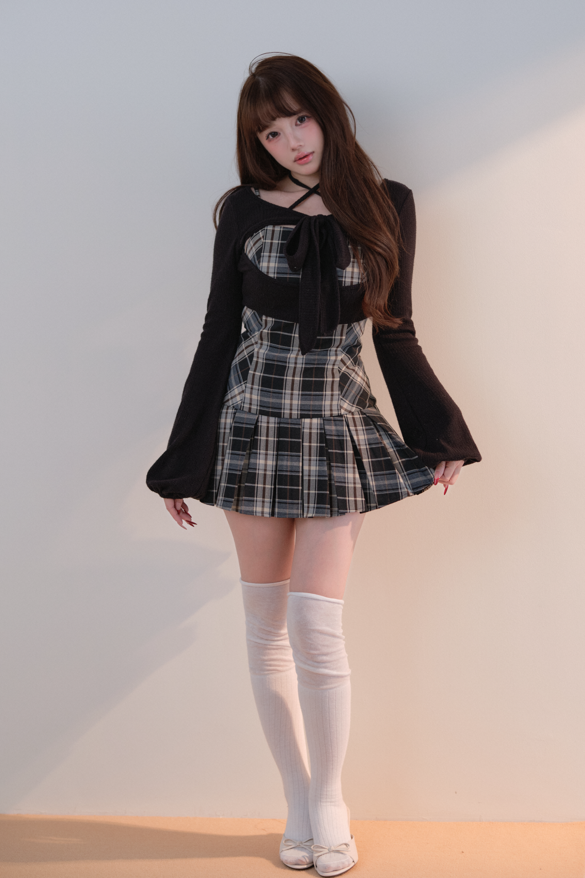 This set item combines a compact black knit top with a classic checked camisole dress to create a well-balanced outfit.