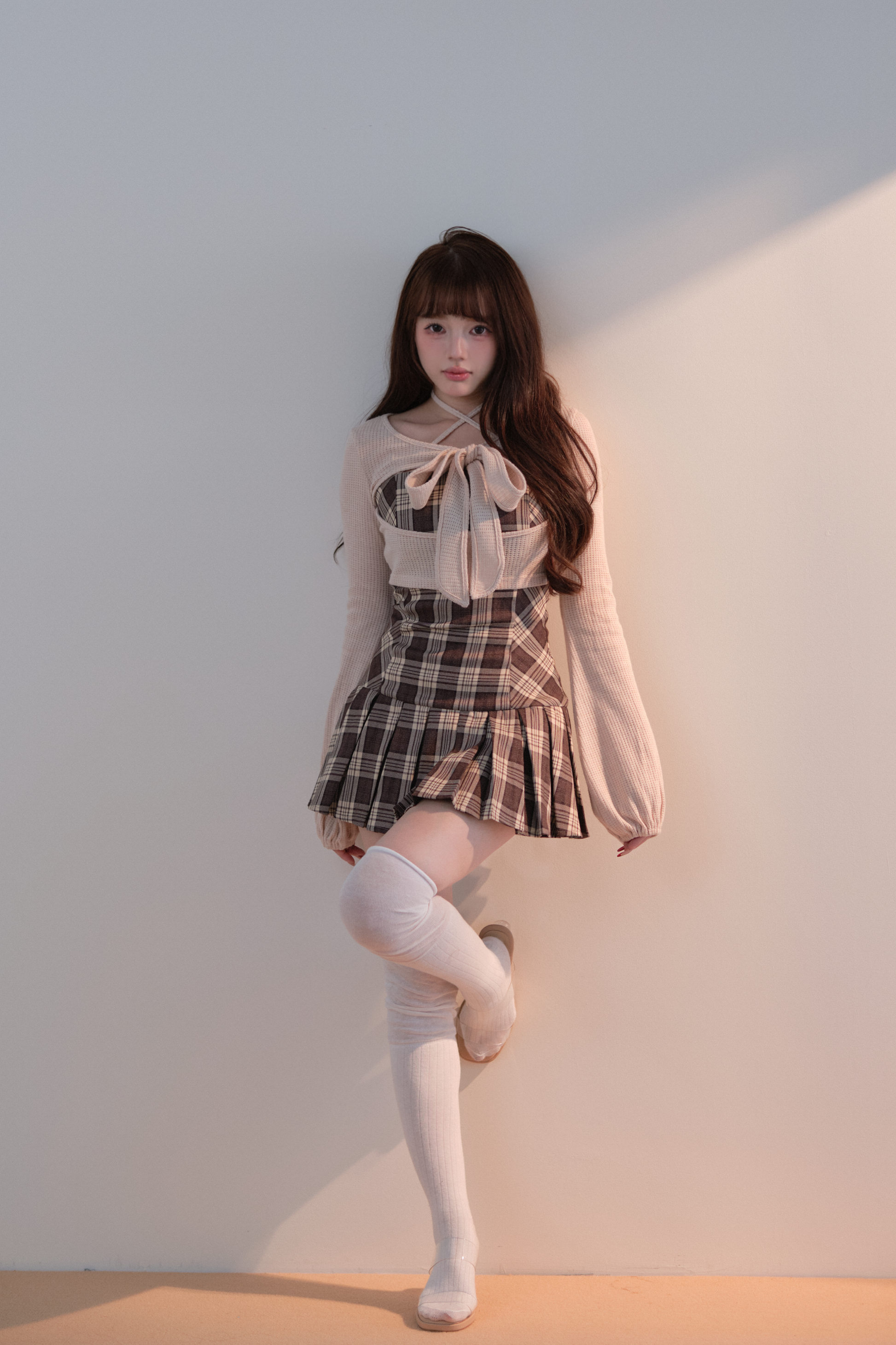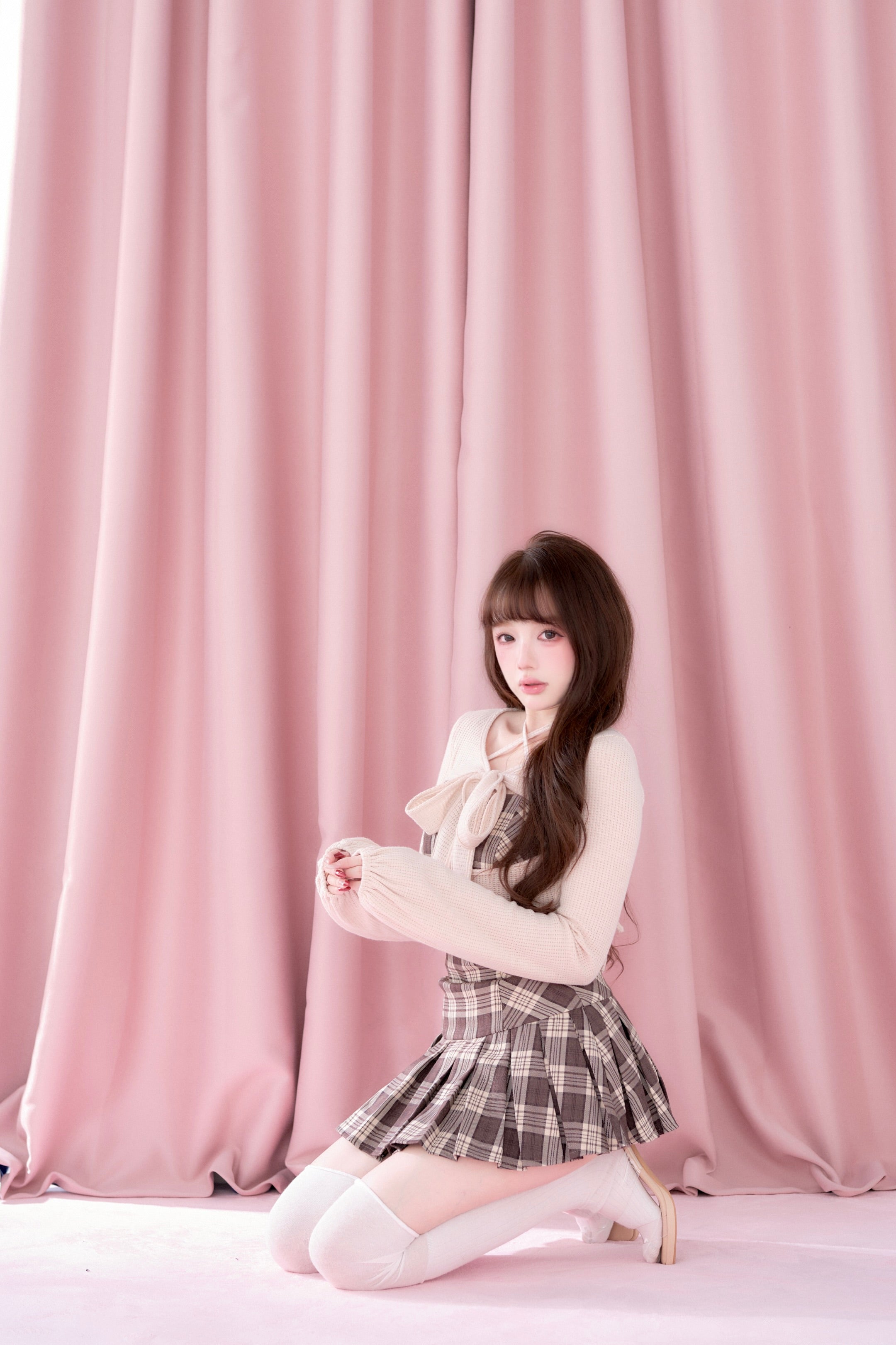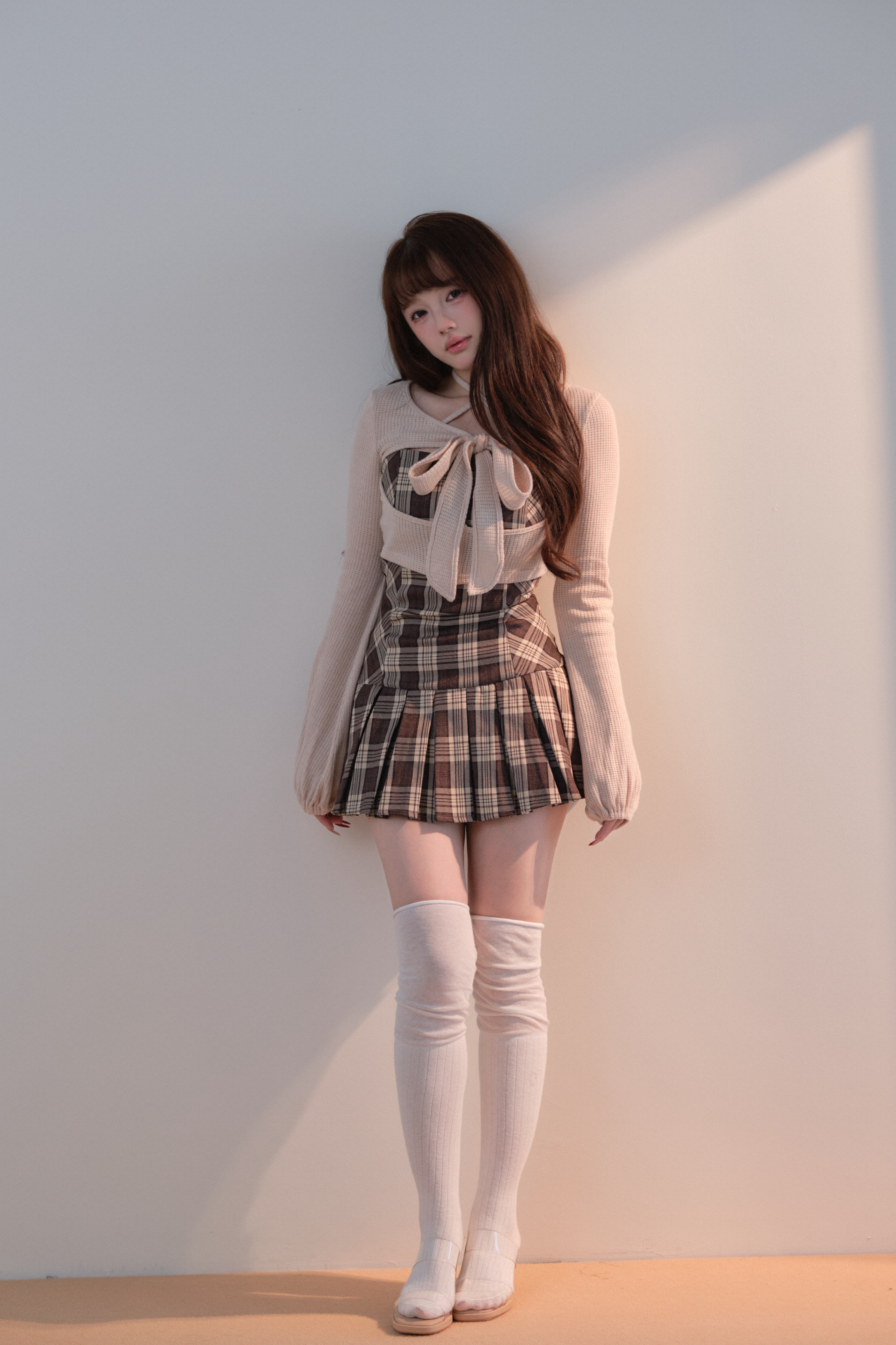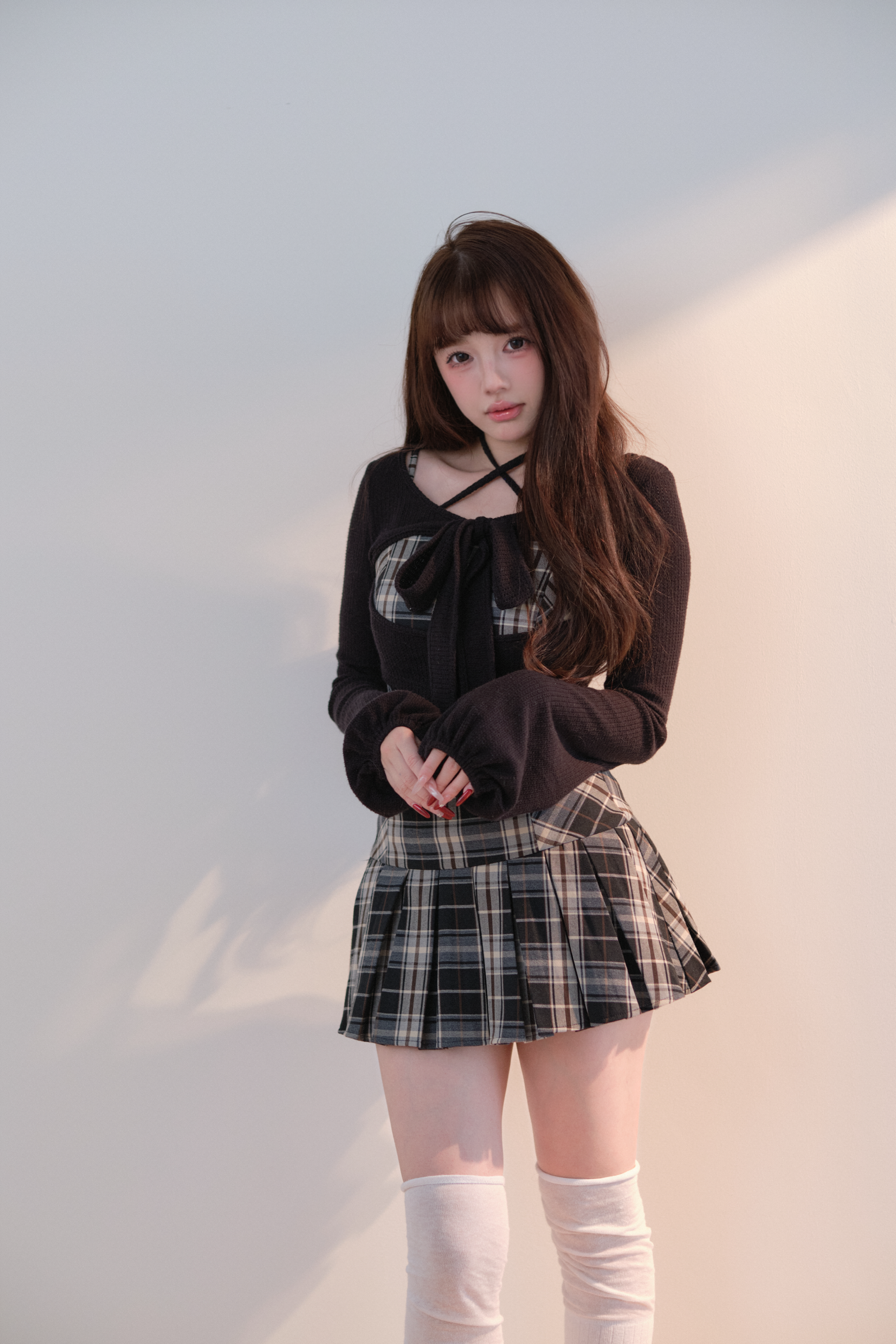 This set item combines a compact black knit top with a classic checked camisole dress to create a well-balanced outfit.
