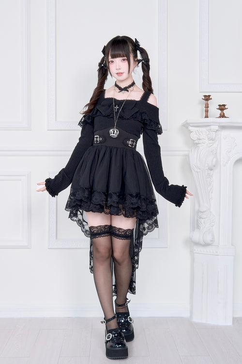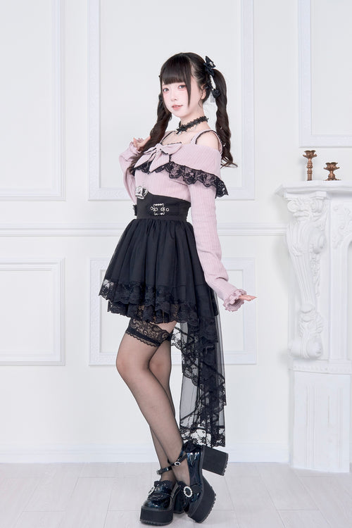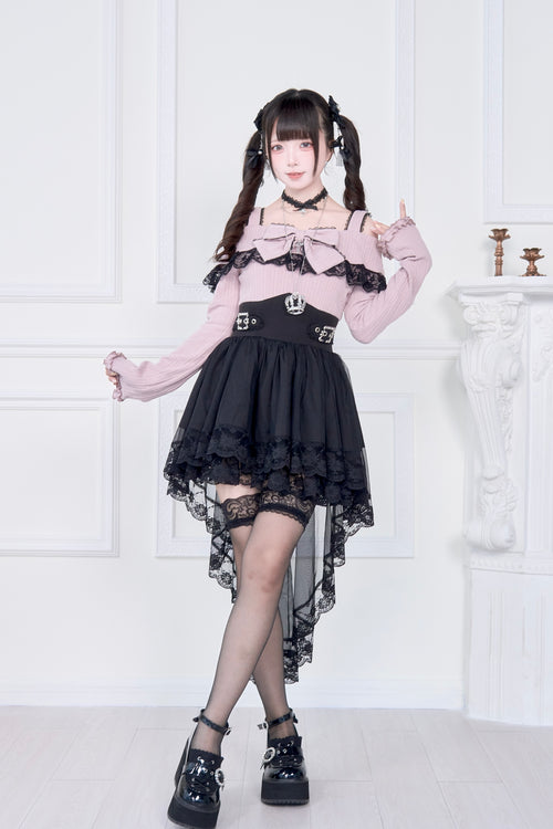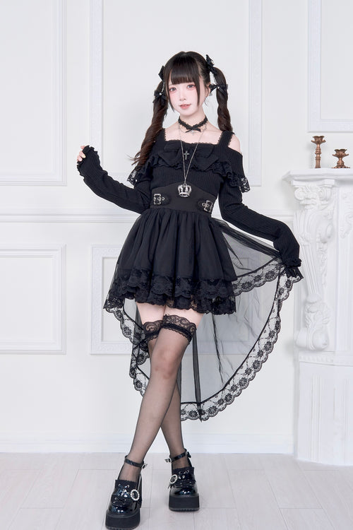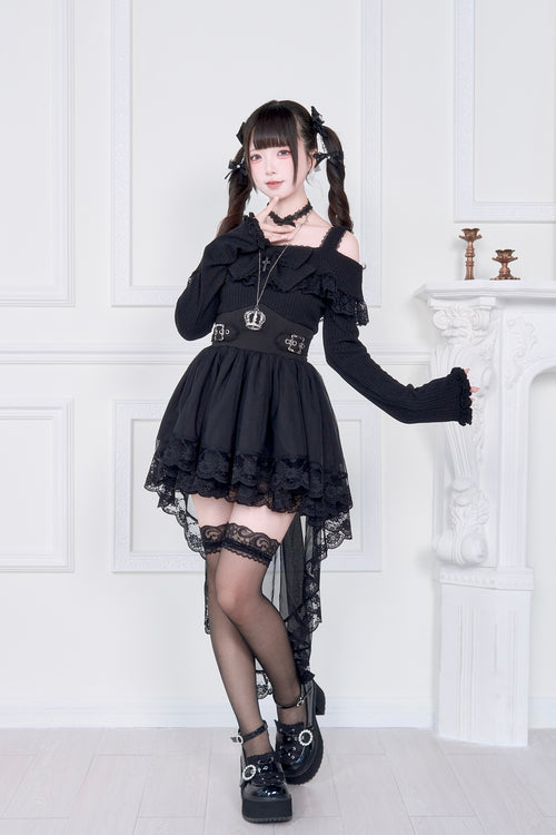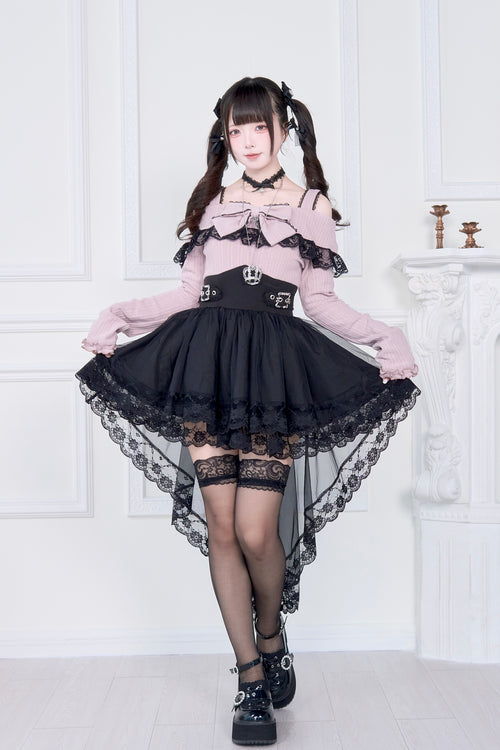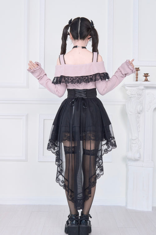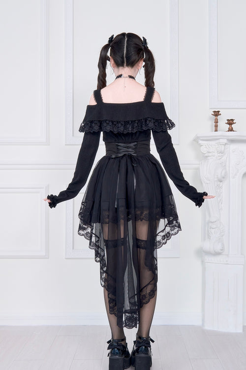 The upper body is made of ribbed knit material, making it soft and comfortable to wear. The design slightly reveals the shoulders, adding a cute and relaxed feel. - The skirt is made of delicate lace and sheer tulle, and it flows softly with every movement, creating a dramatic silhouette. The long tail design with a difference between the front and back creates a beautiful leg line.