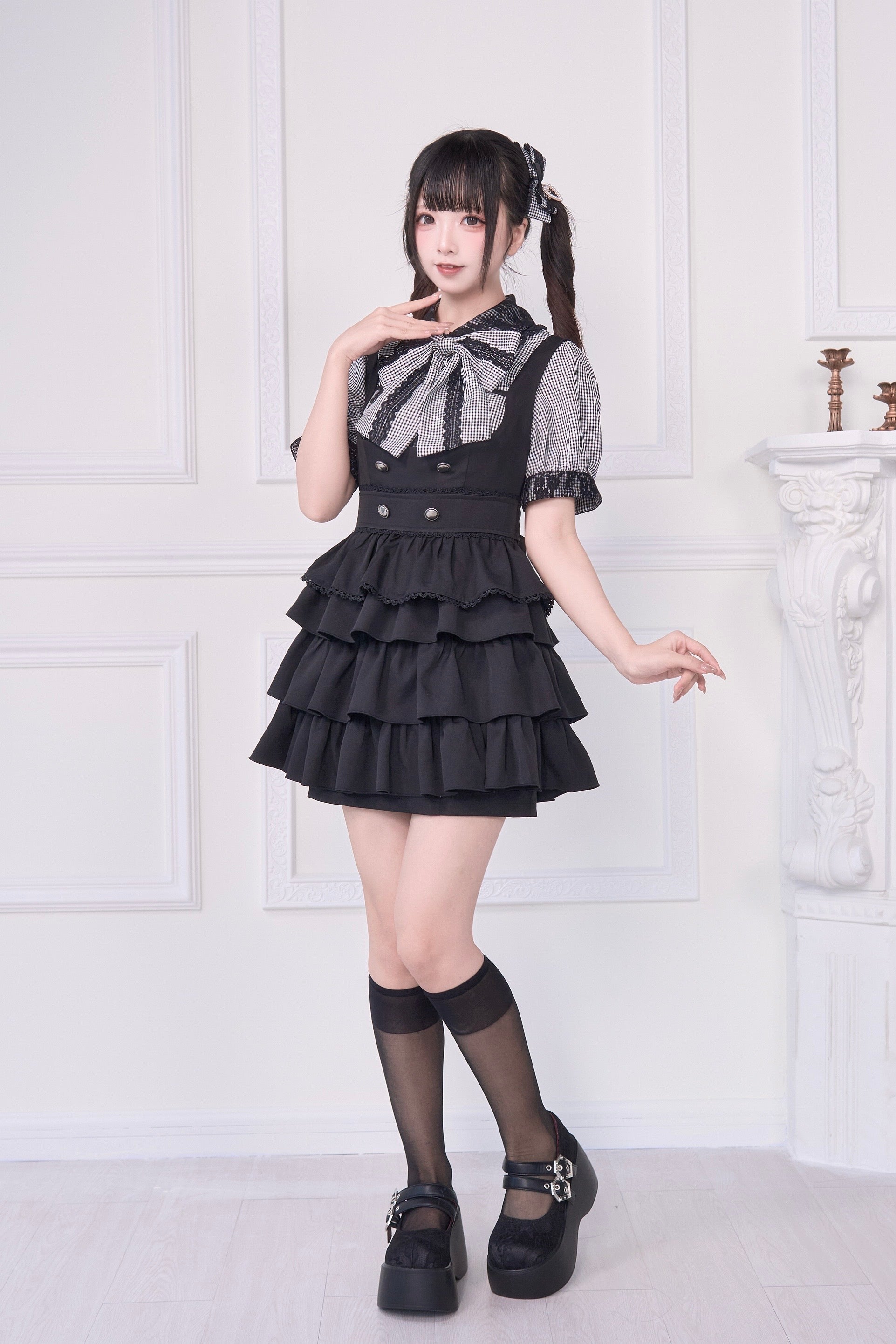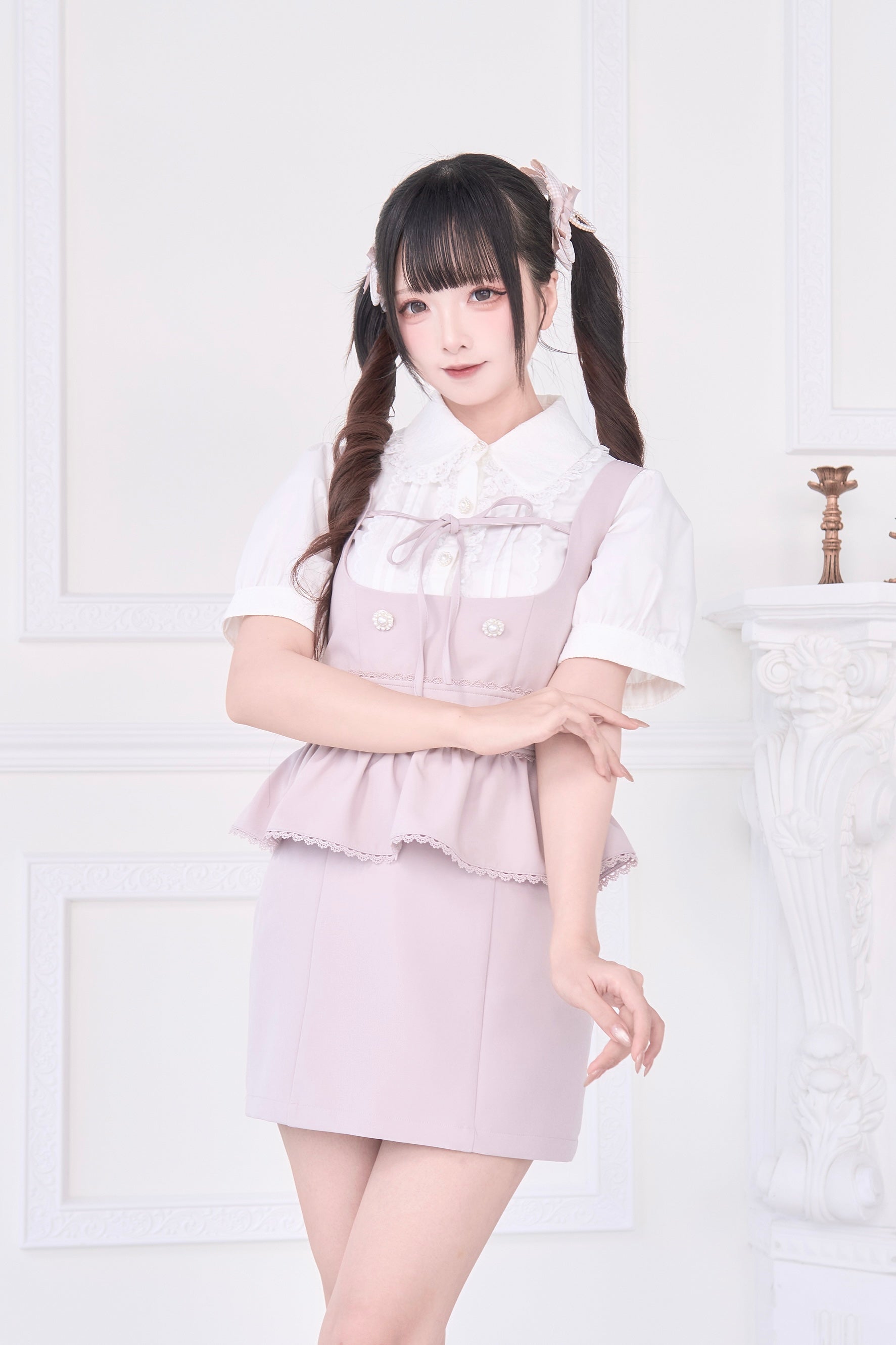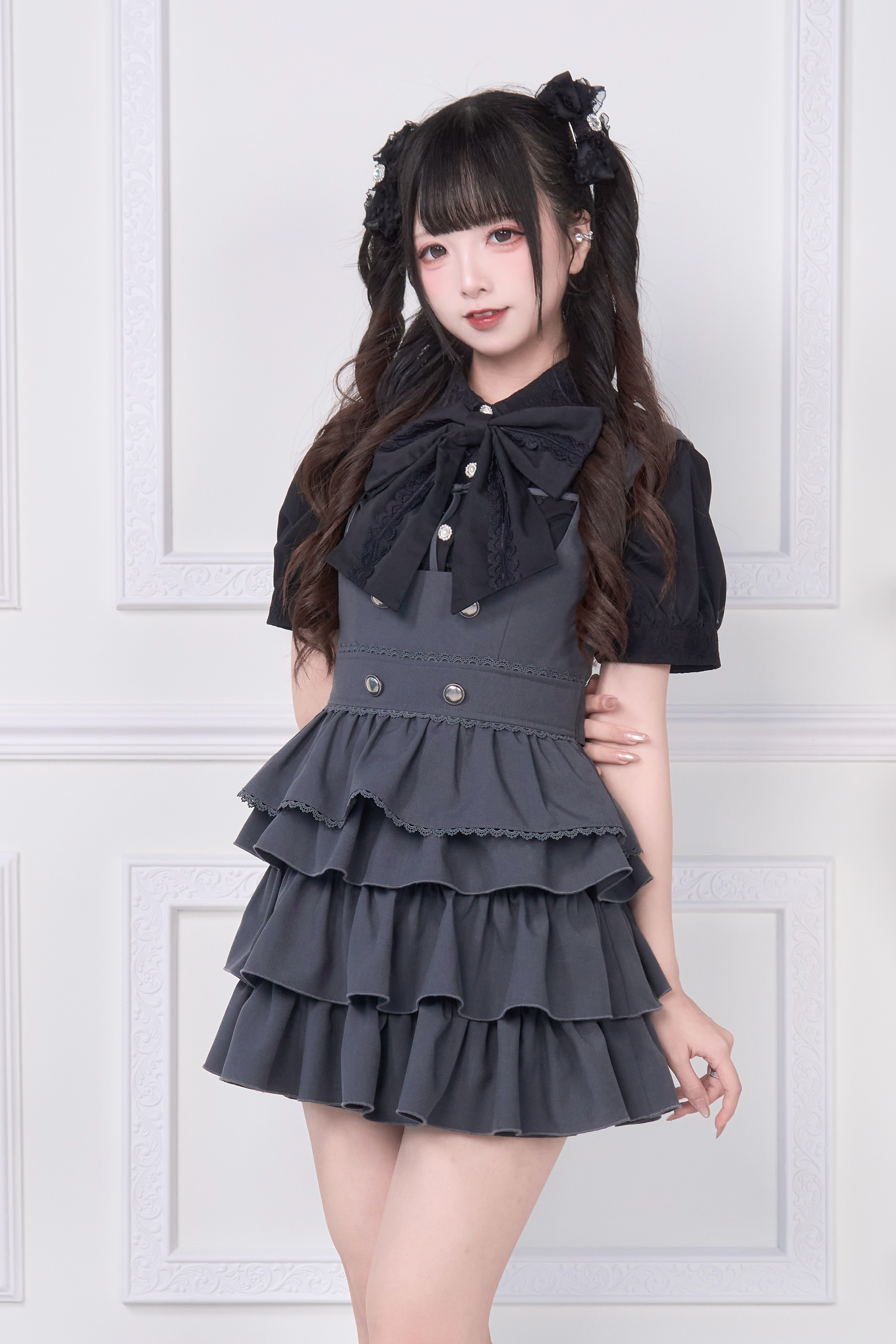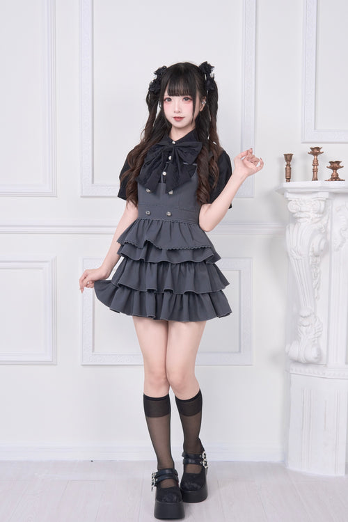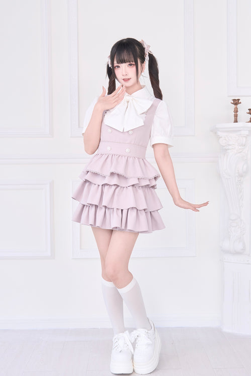 A special item set that includes a blouse with a large ribbon brooch and a jumper skirt with layered attachments.