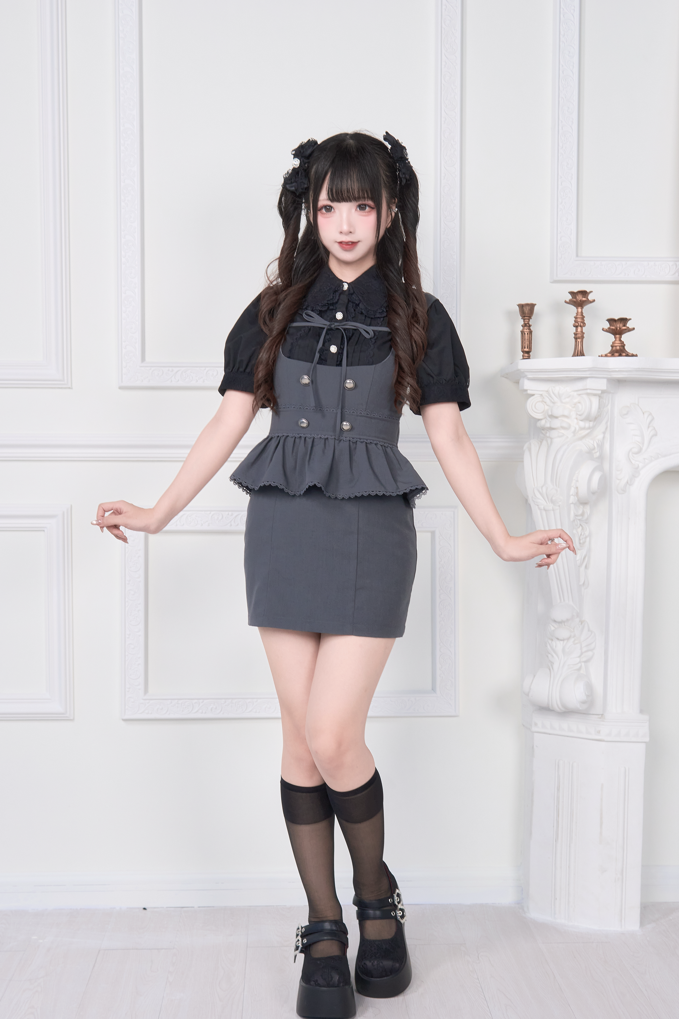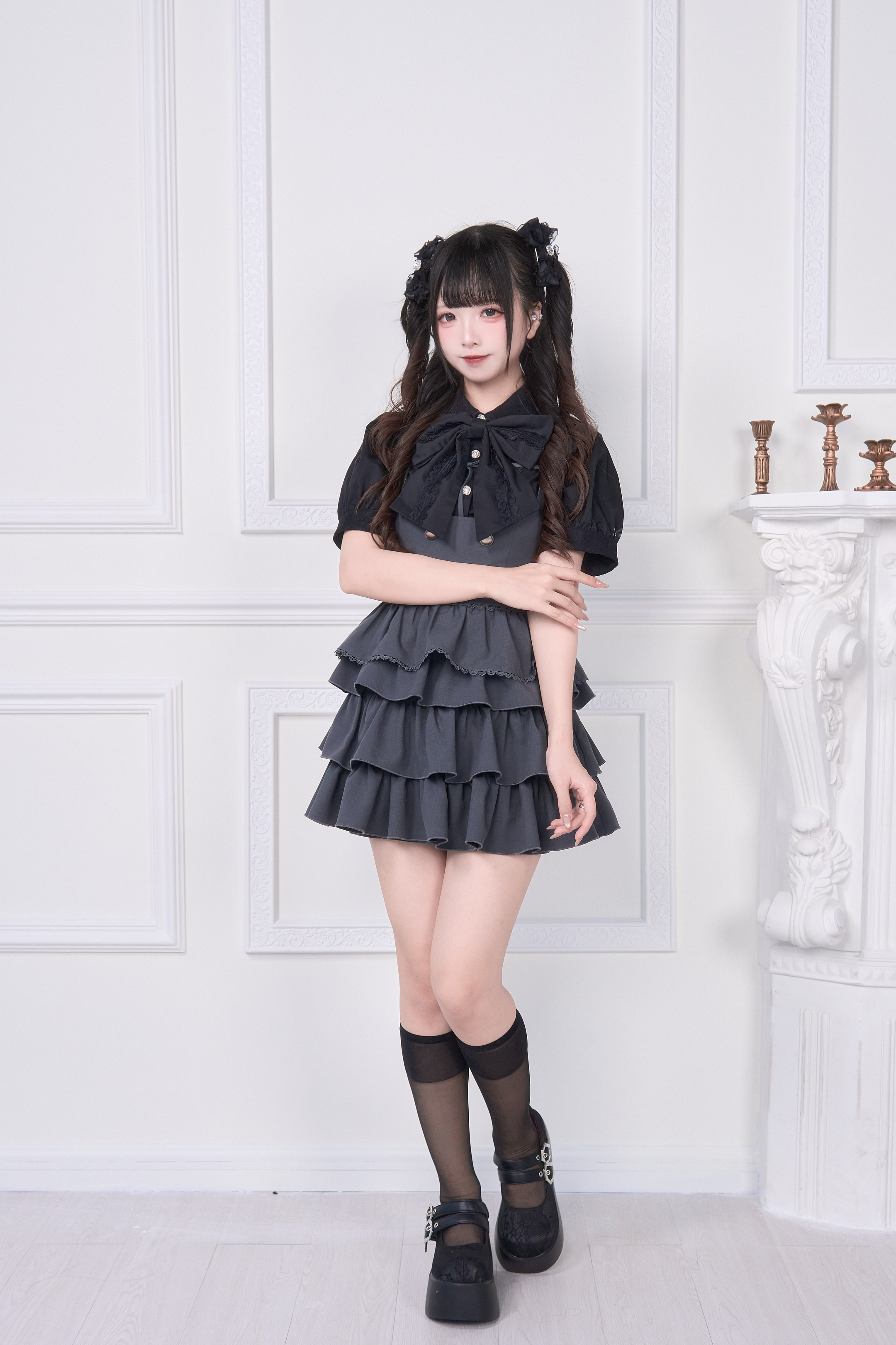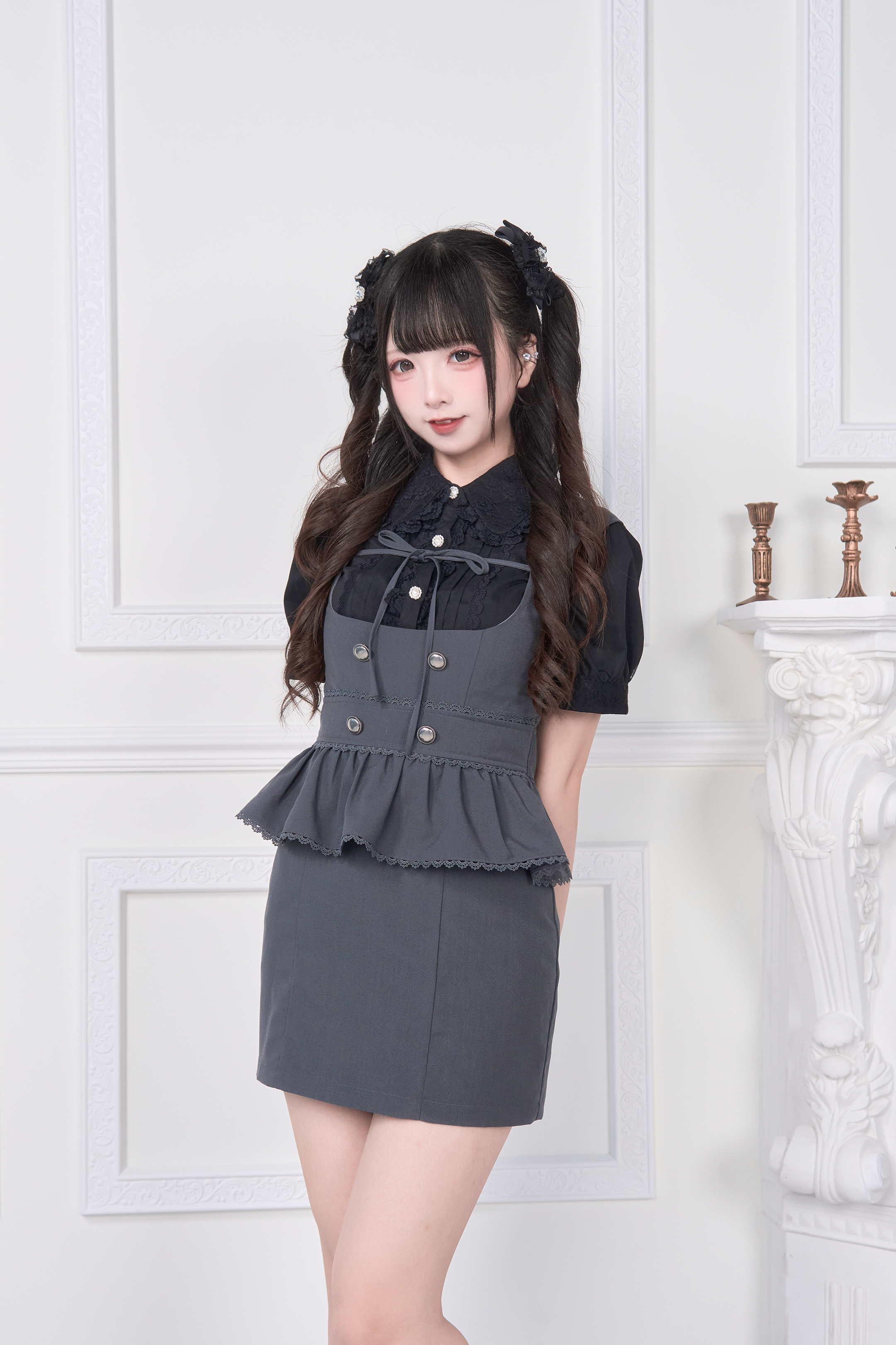 A special item set that includes a blouse with a large ribbon brooch and a jumper skirt with layered attachments.