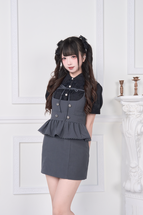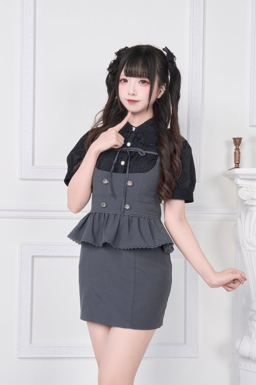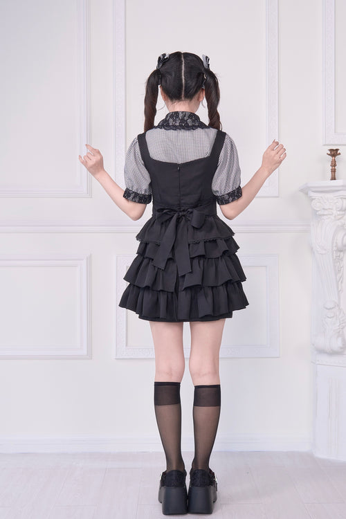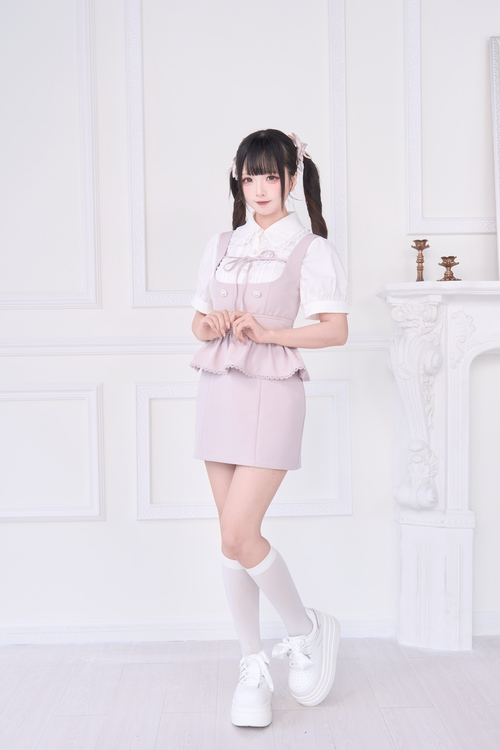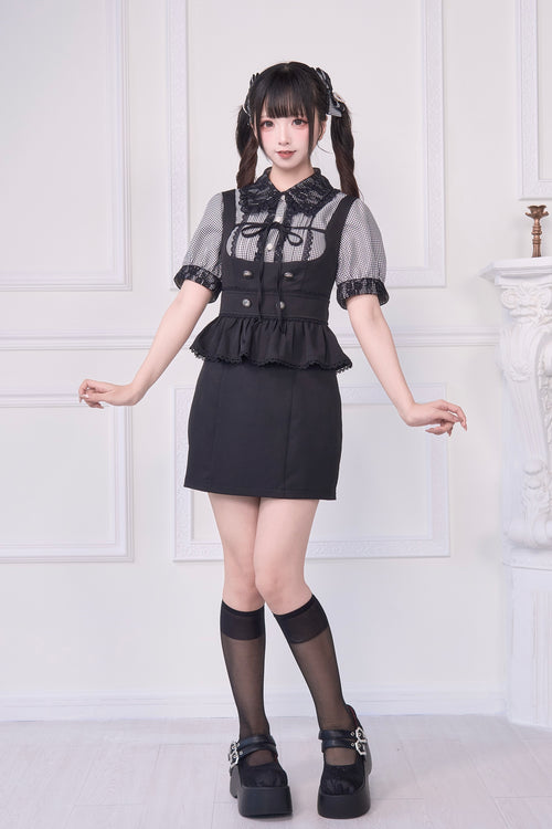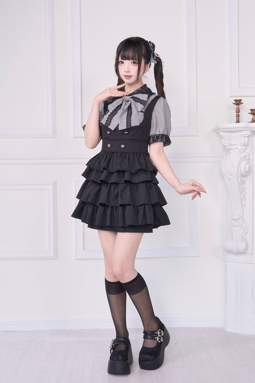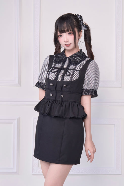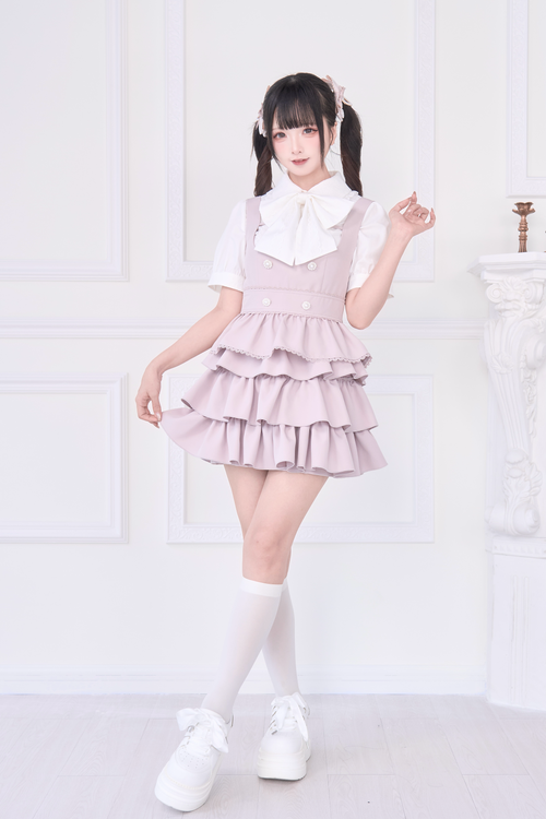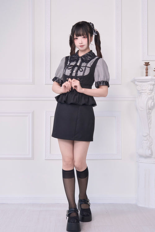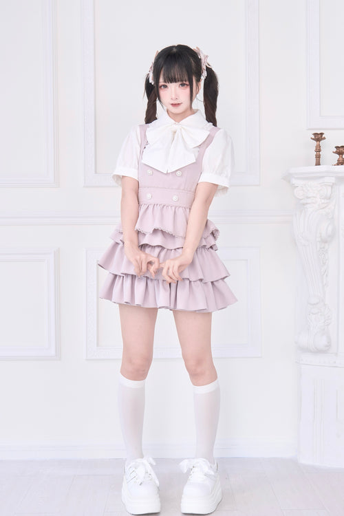 2WAY Overall Skirt & Ribbon Brooch Blouse