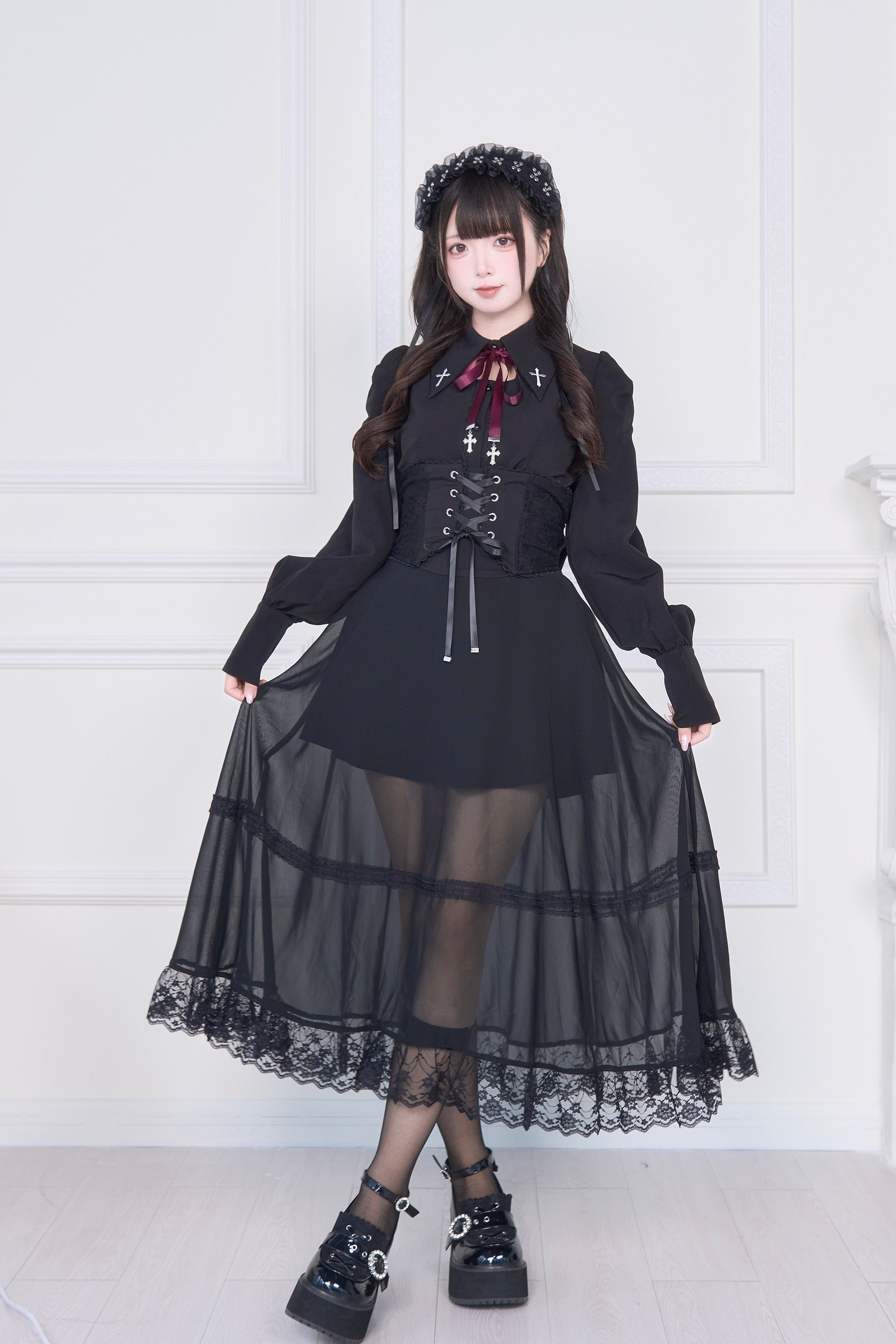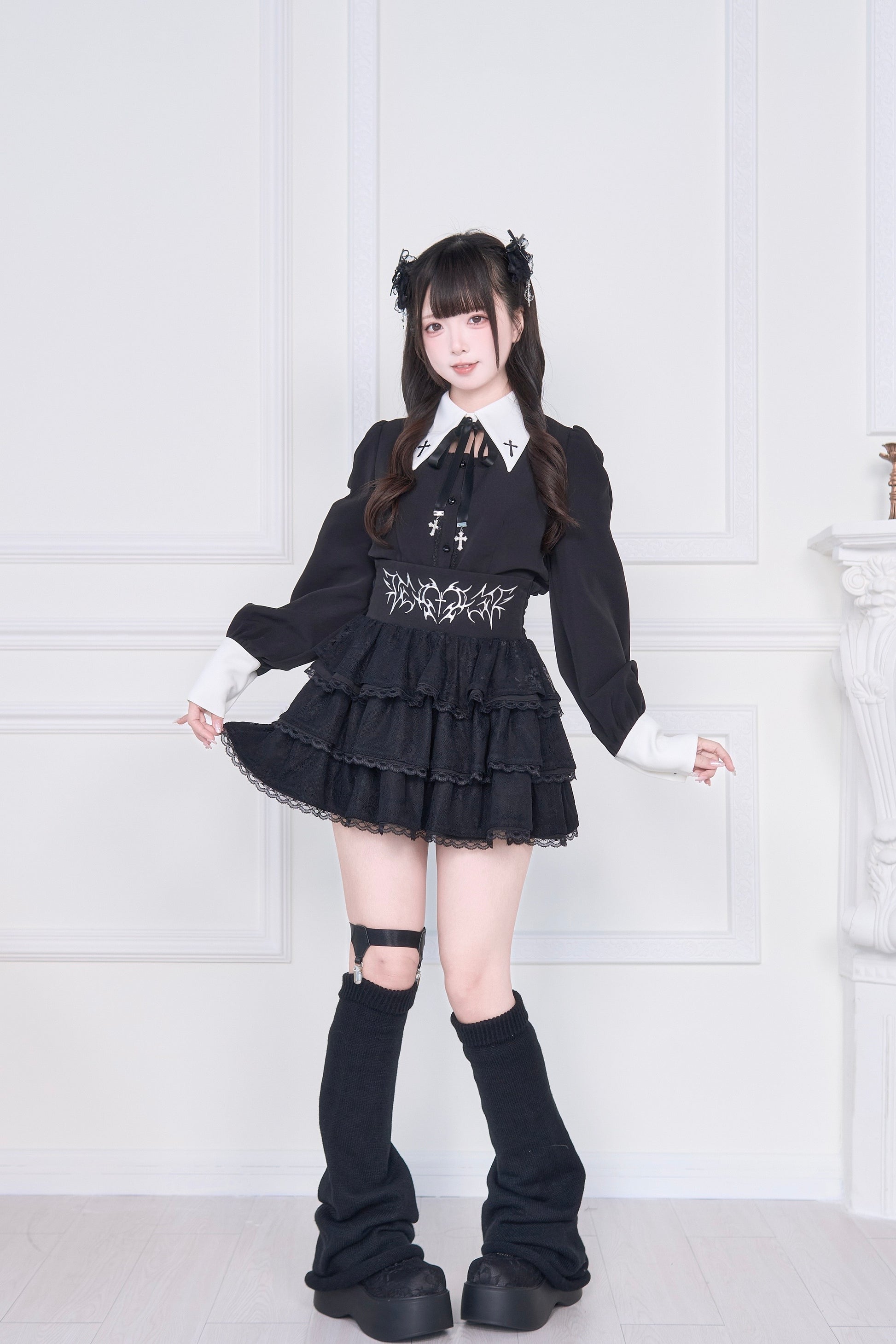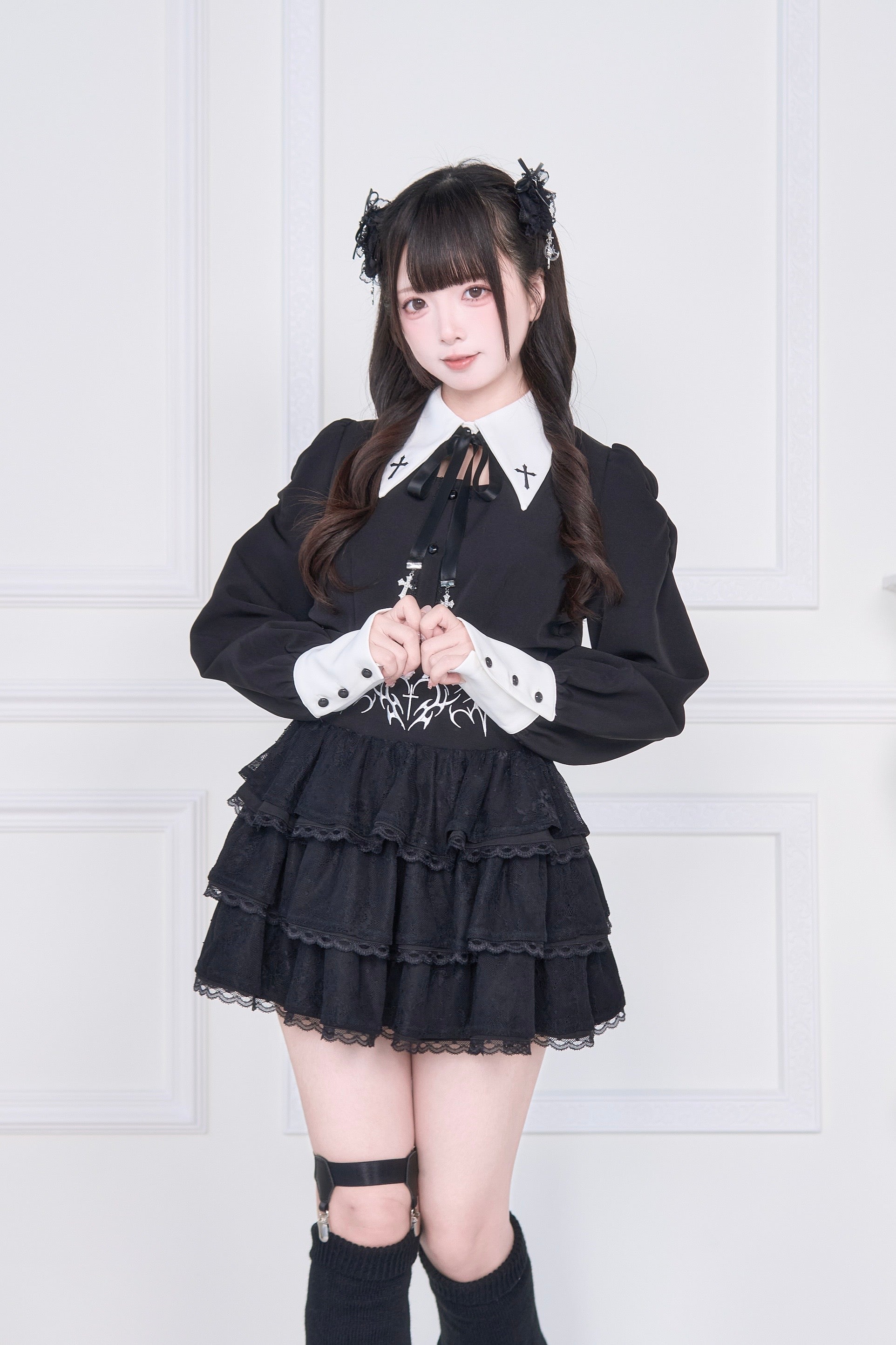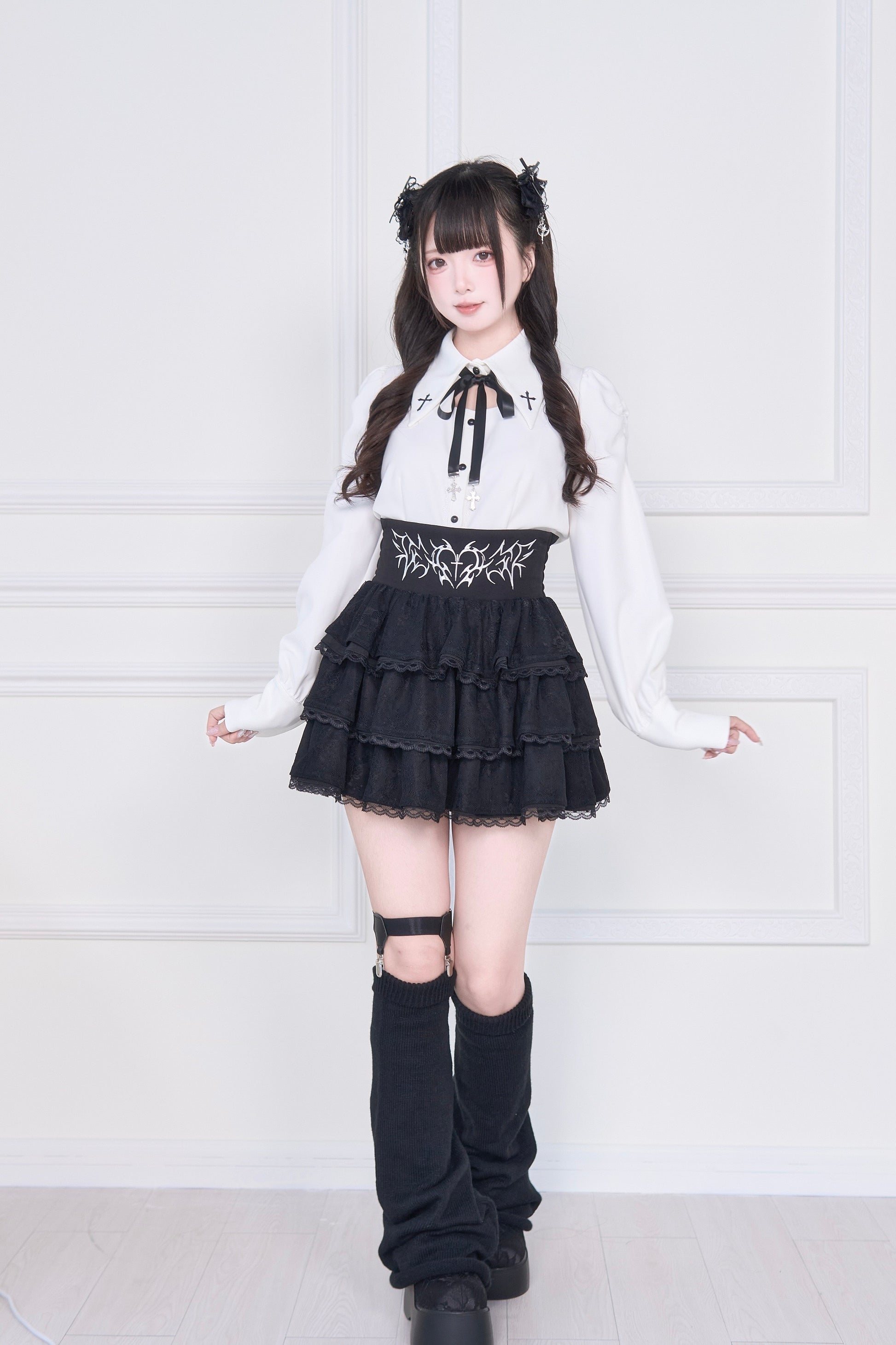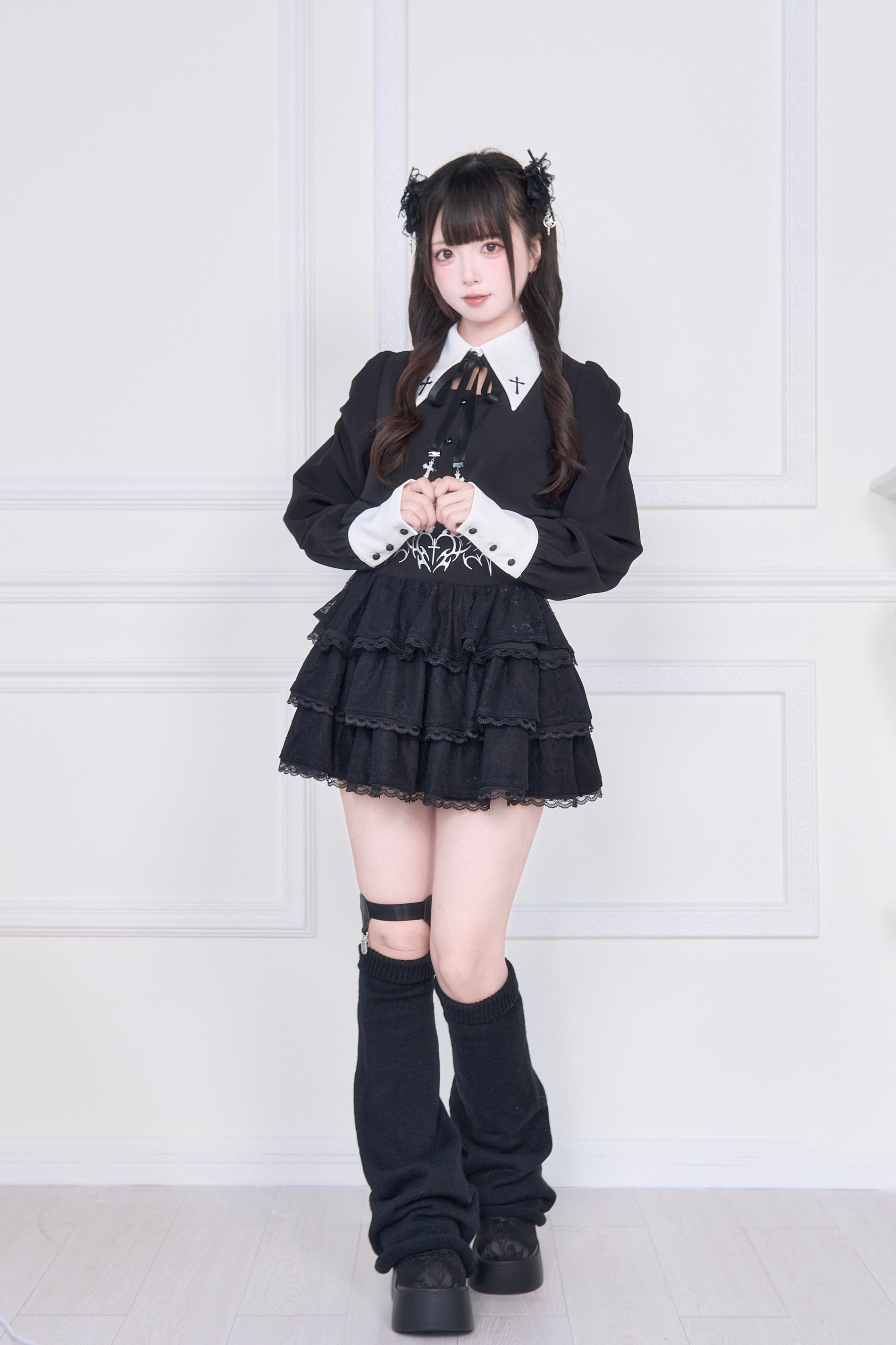 わせた刺繍入りティアードスカートはふんわりとがるフリルシルエットでゴシックな雰囲気演出します