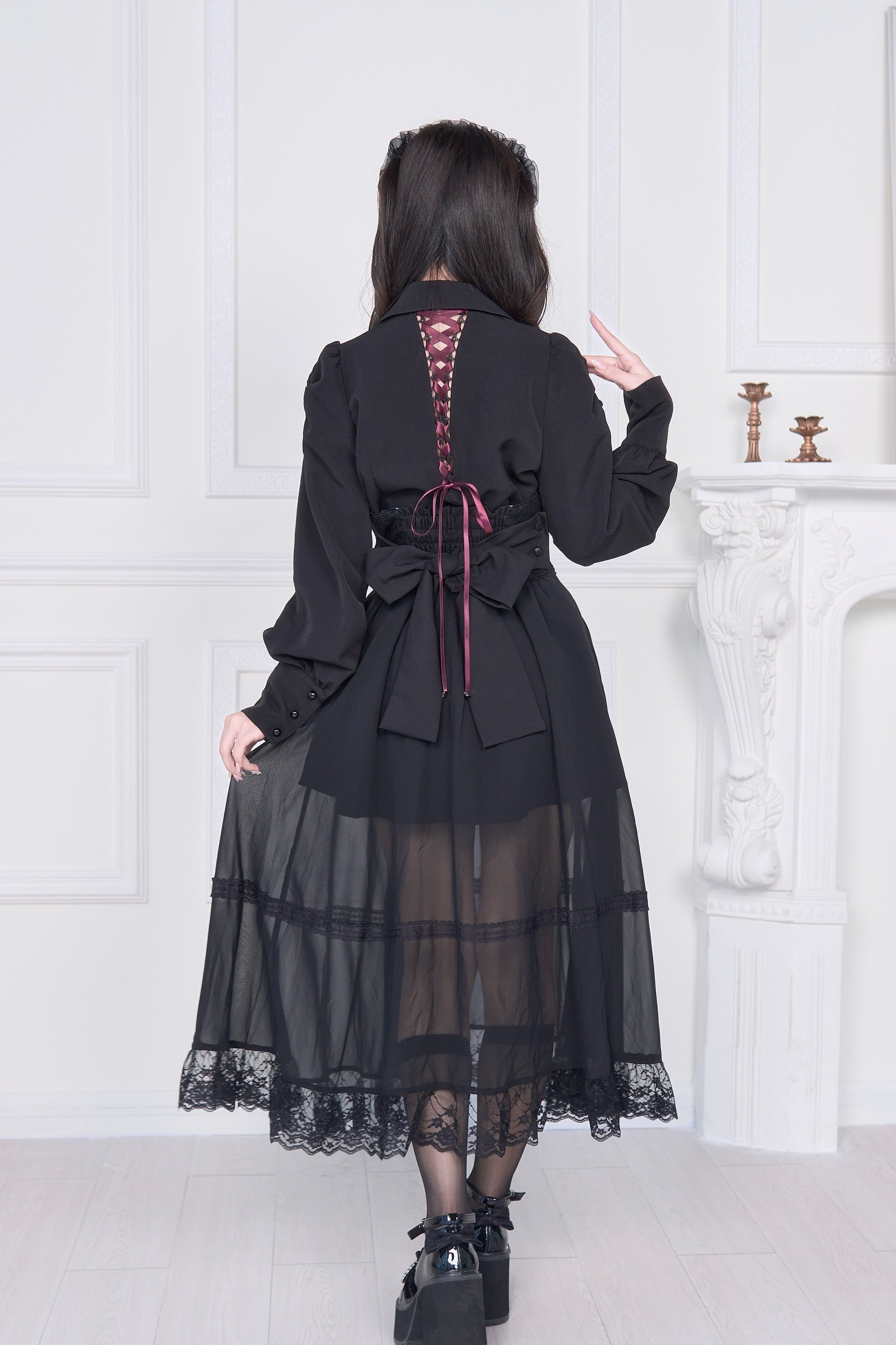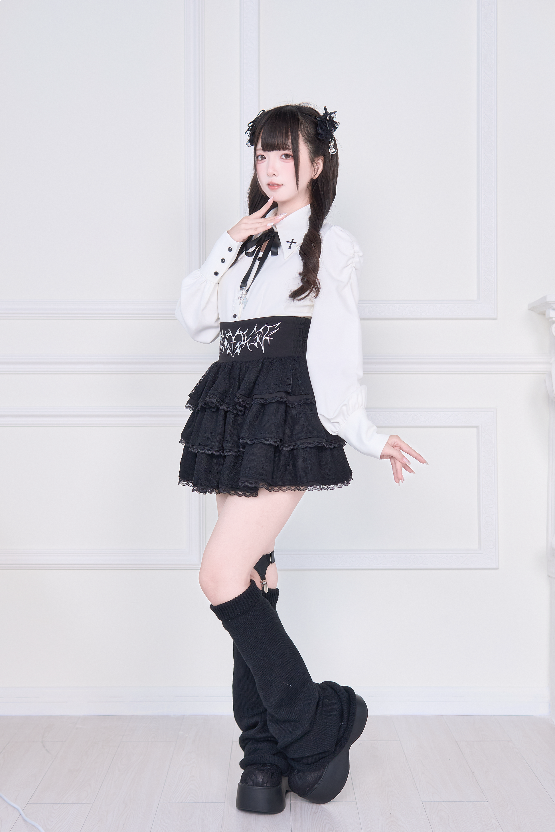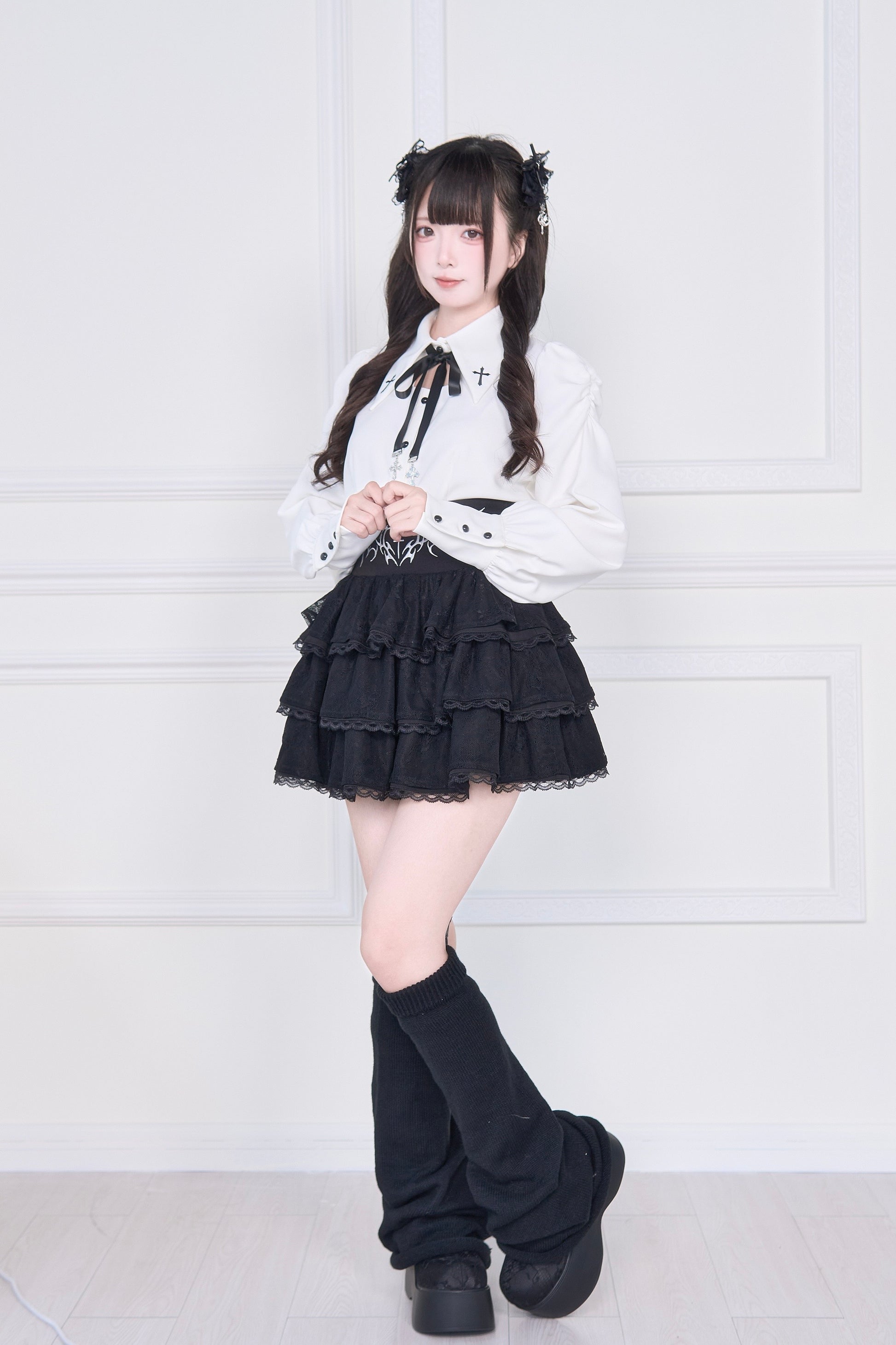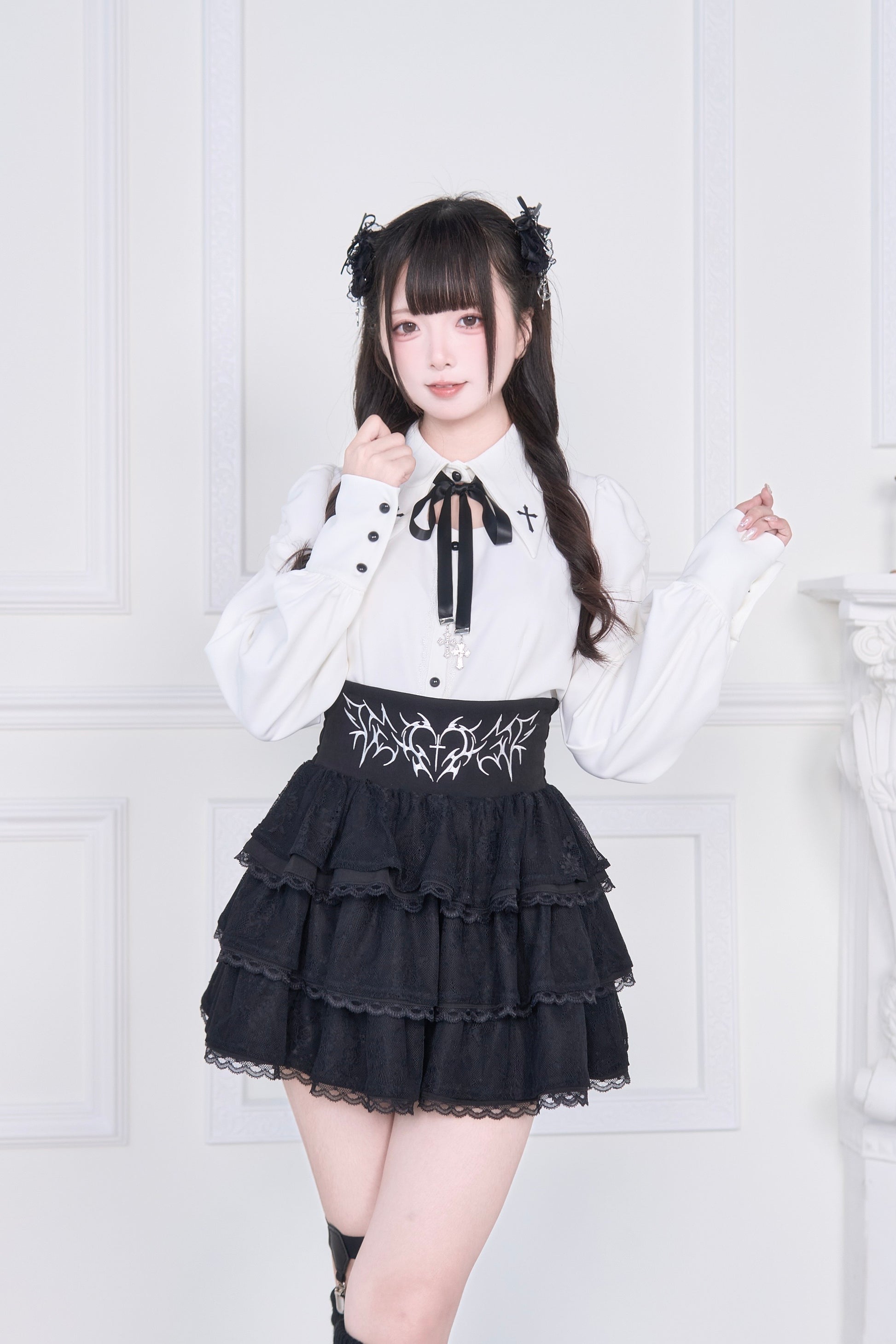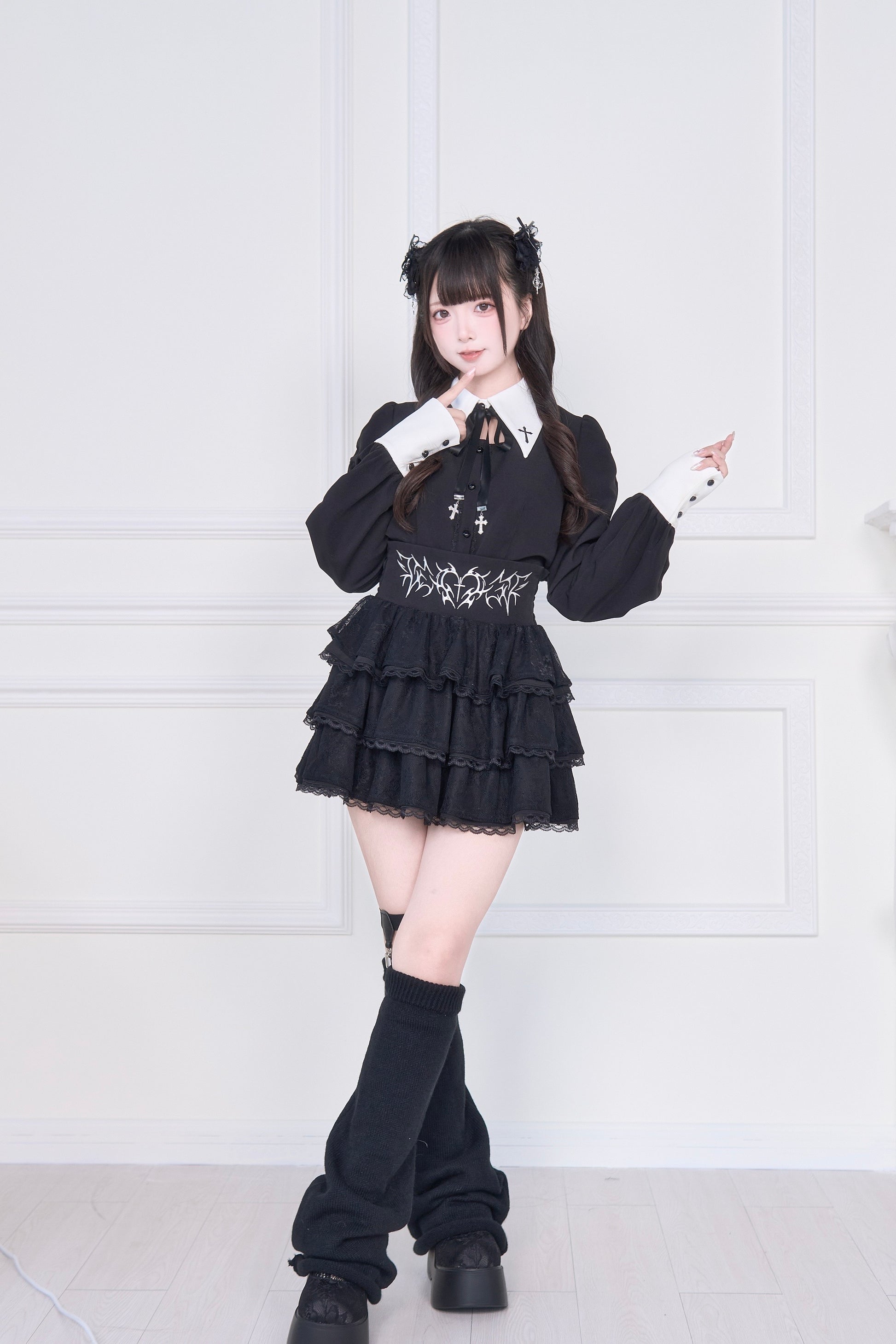 わせた刺繍入りティアードスカートはふんわりとがるフリルシルエットでゴシックな雰囲気演出します