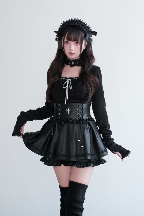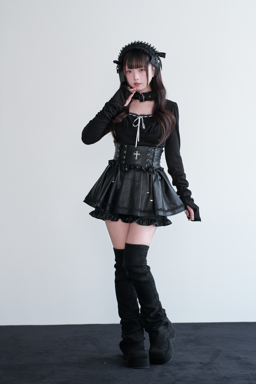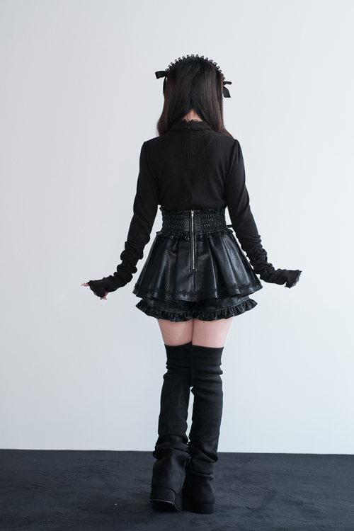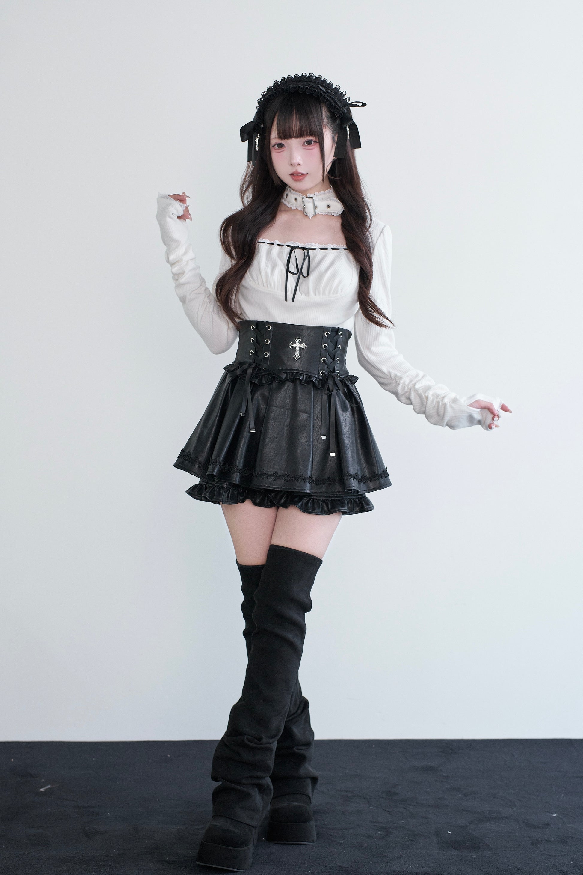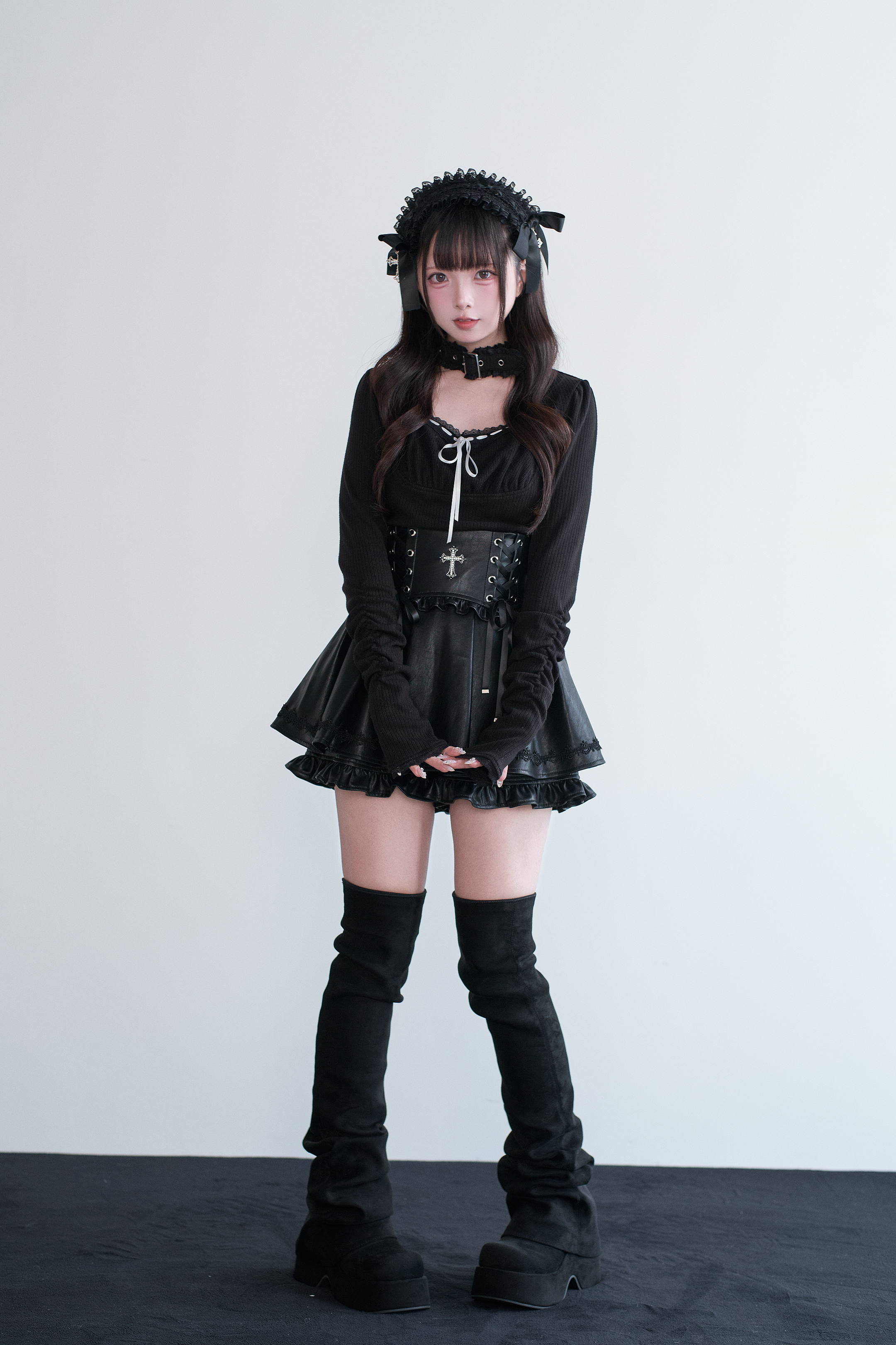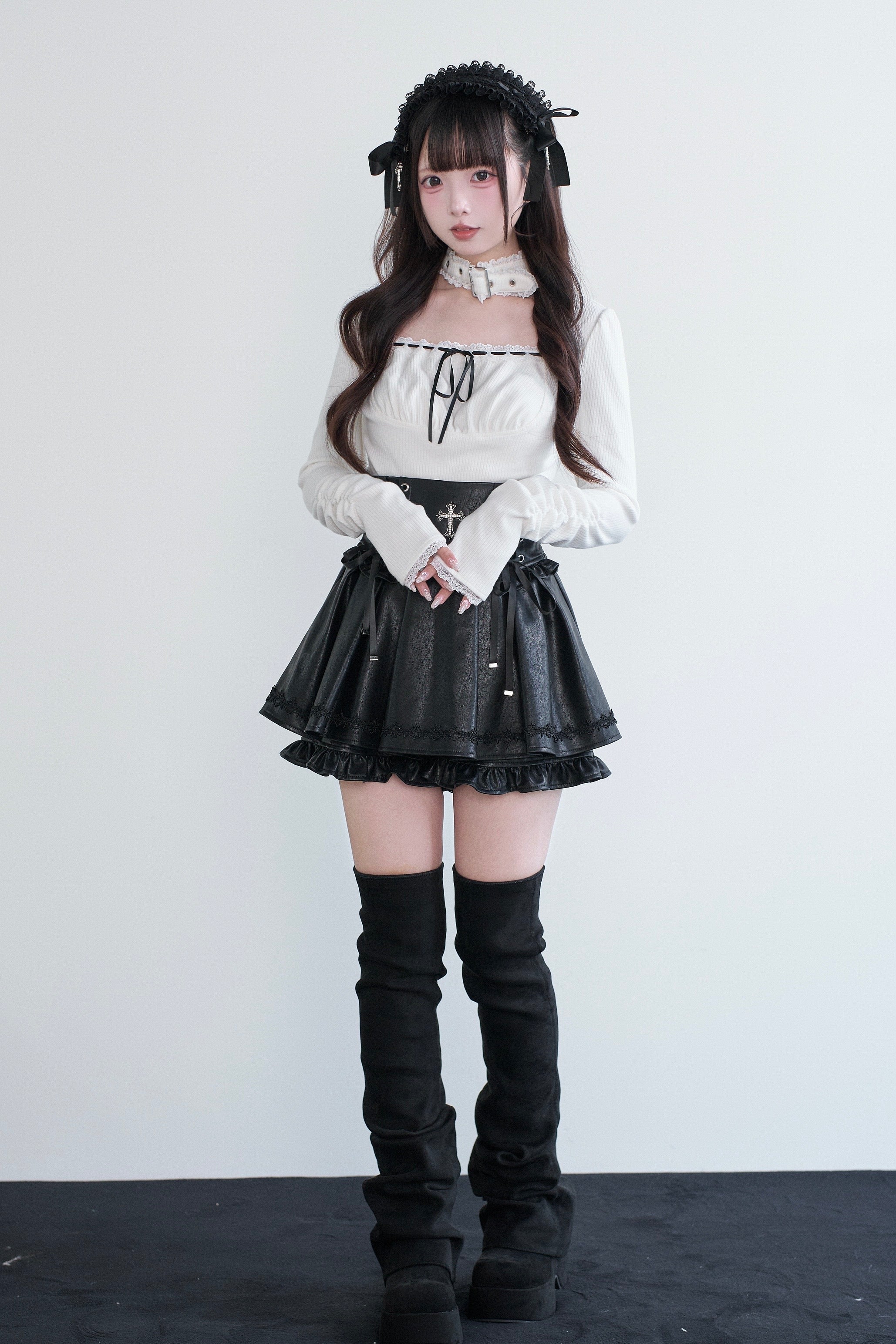 一体型のチョーカーネックが首元を美しく演出し、オフショルダーのネックラインが鎖骨を際立たせます。ブラックトリミングがシャープなコントラストを生み出し、甘さを抑えた洗練された表情に。 レザースカートやハイウエストボトムスと合わせて、バランスの取れたシルエットを完成させるキーピース。