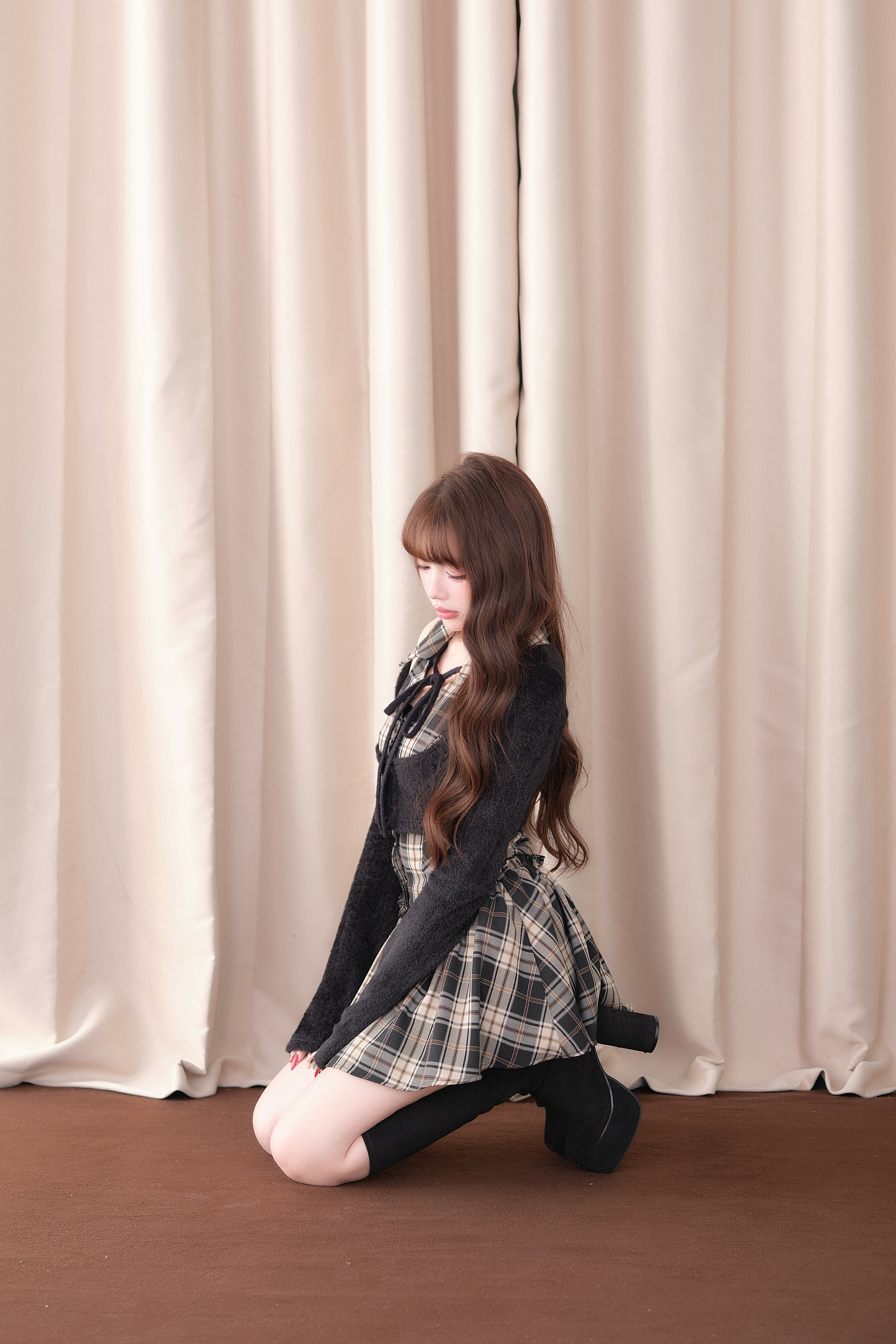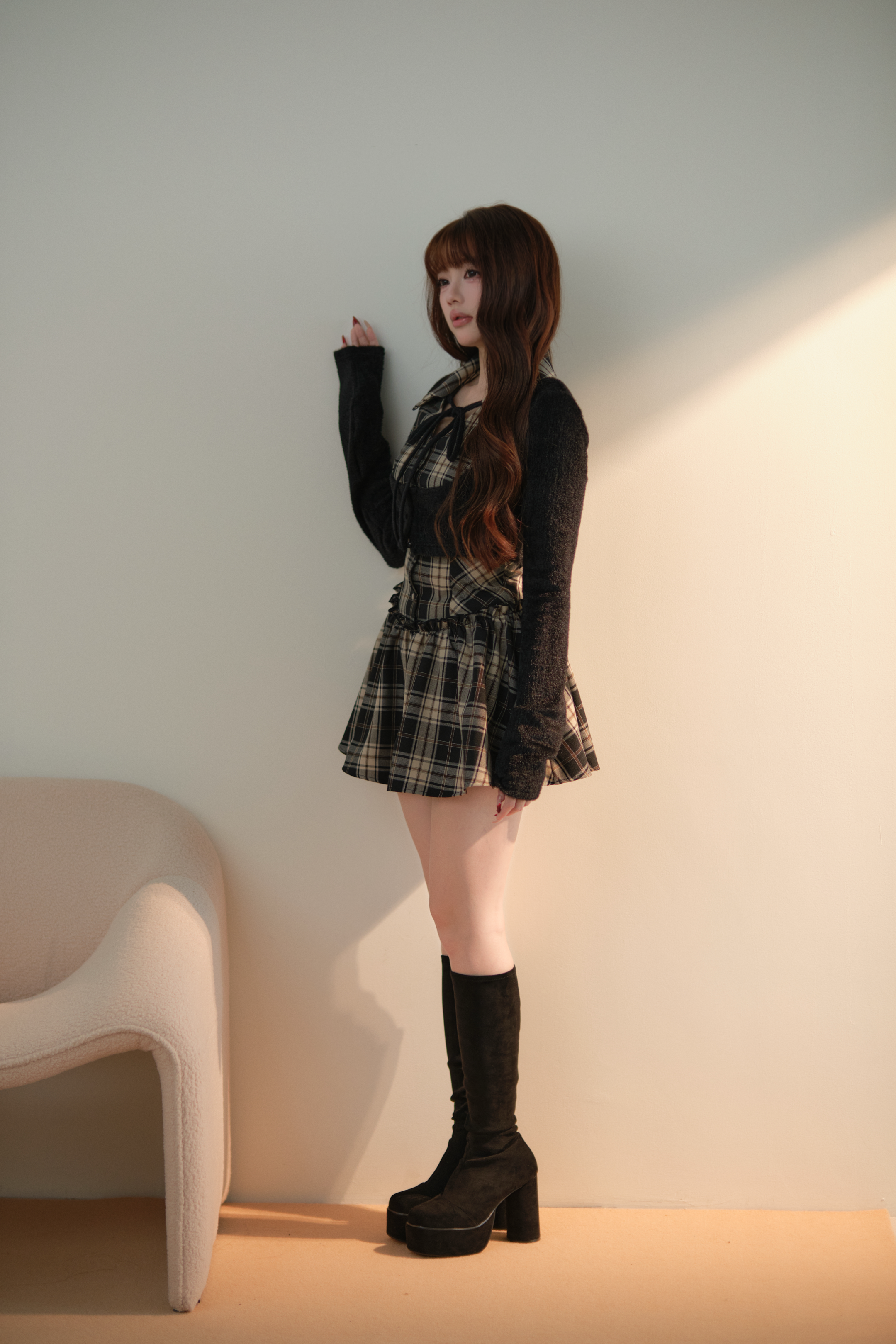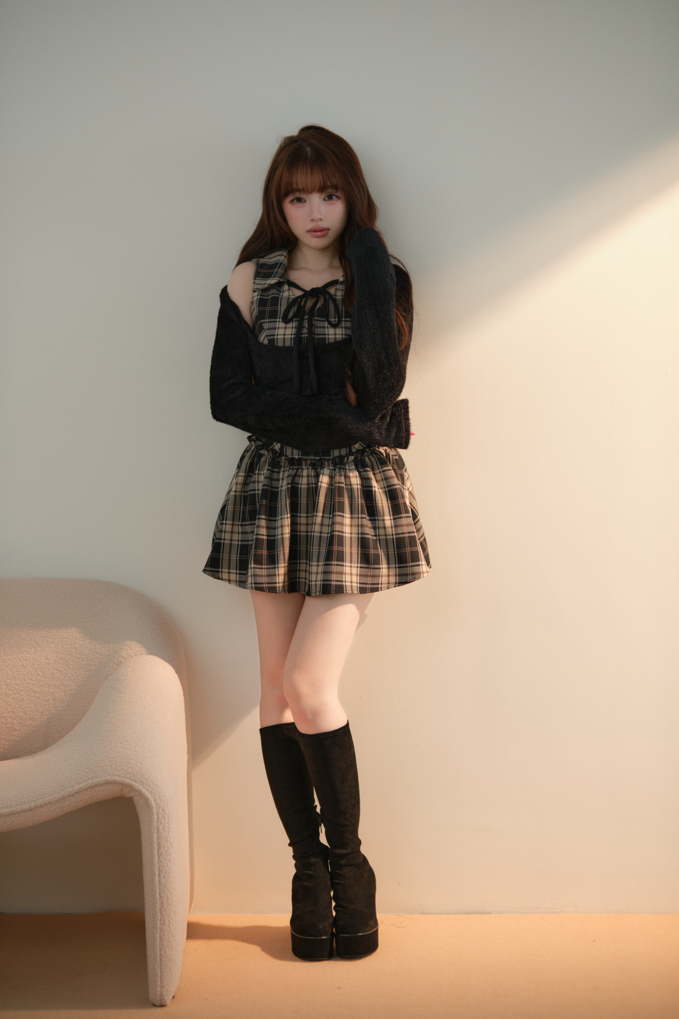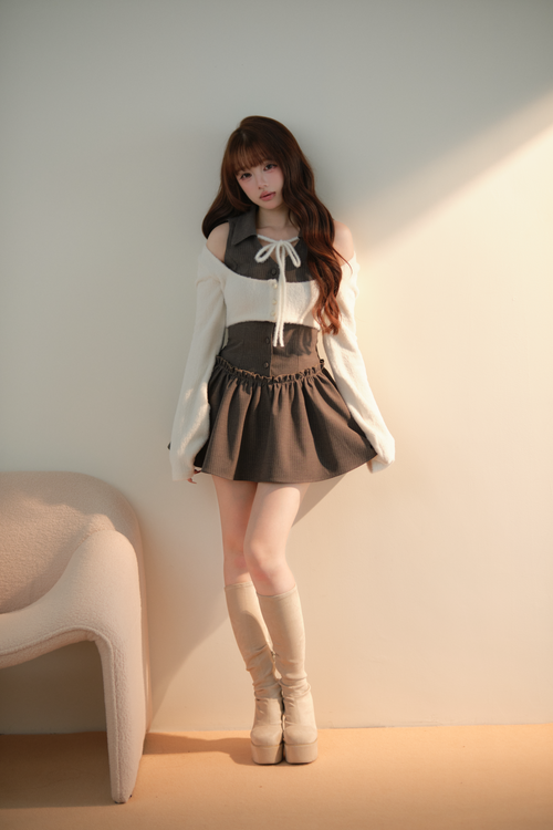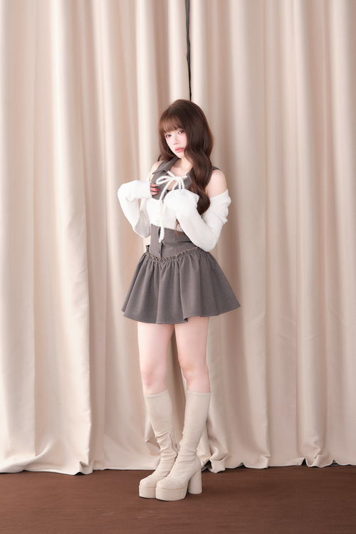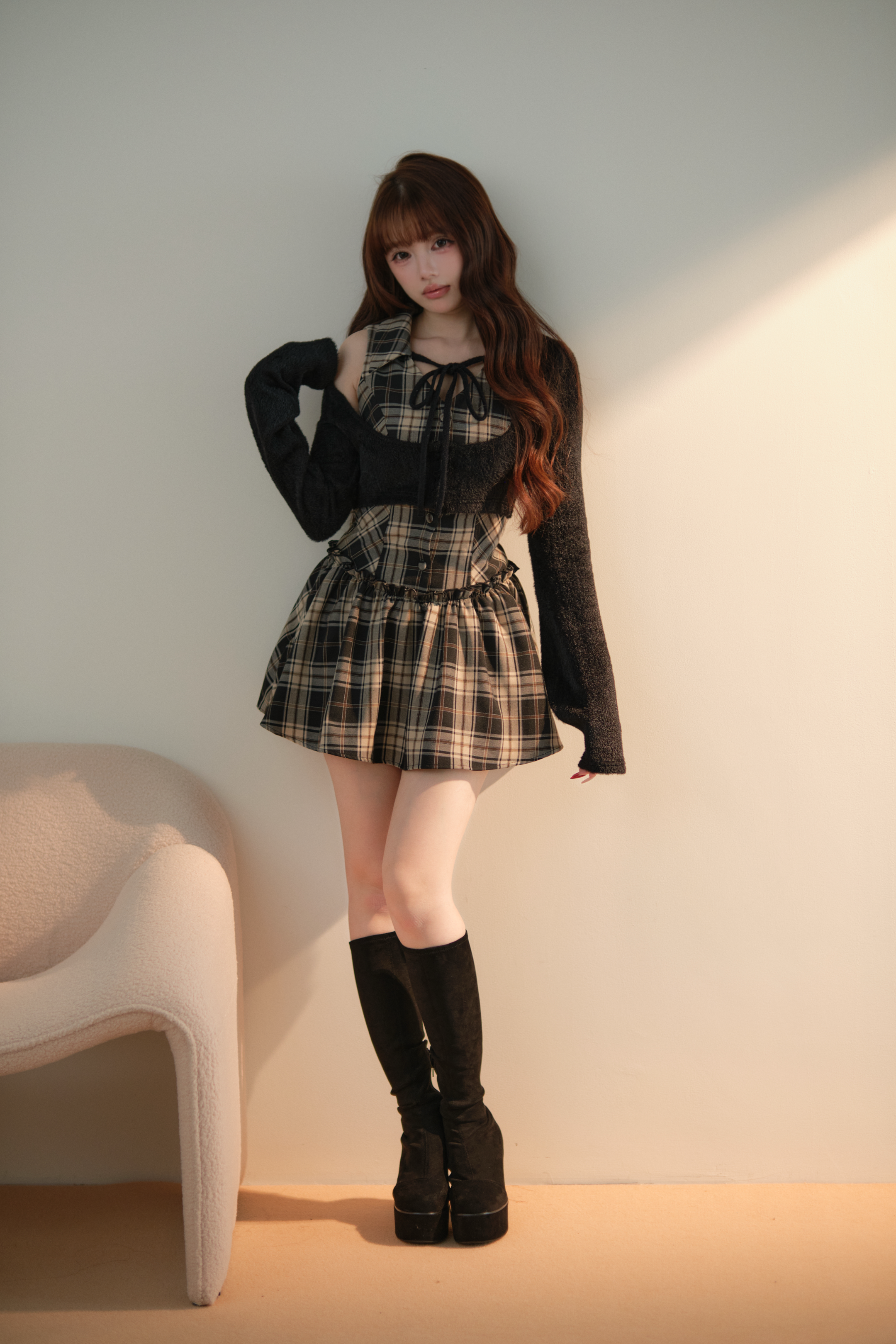 カーディガン部分は柔らかな起毛感のある素材を使用し、 ワンピース部分にはチェック柄・ストライプ柄を採用。