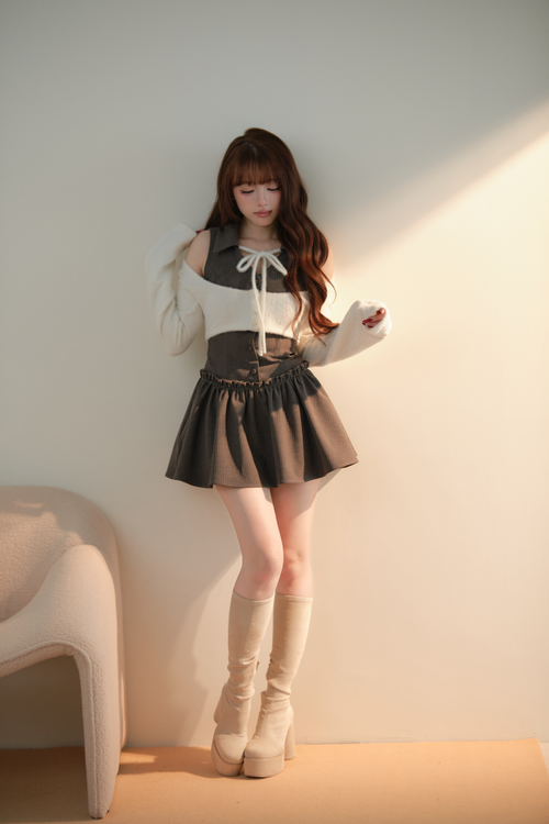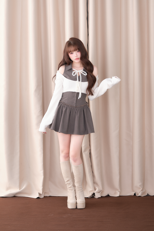 ビスチェ風ワンピースとショート丈カーディガンを 重ね着したように見える、 一体型フェイクレイヤードデザインのワンピース。