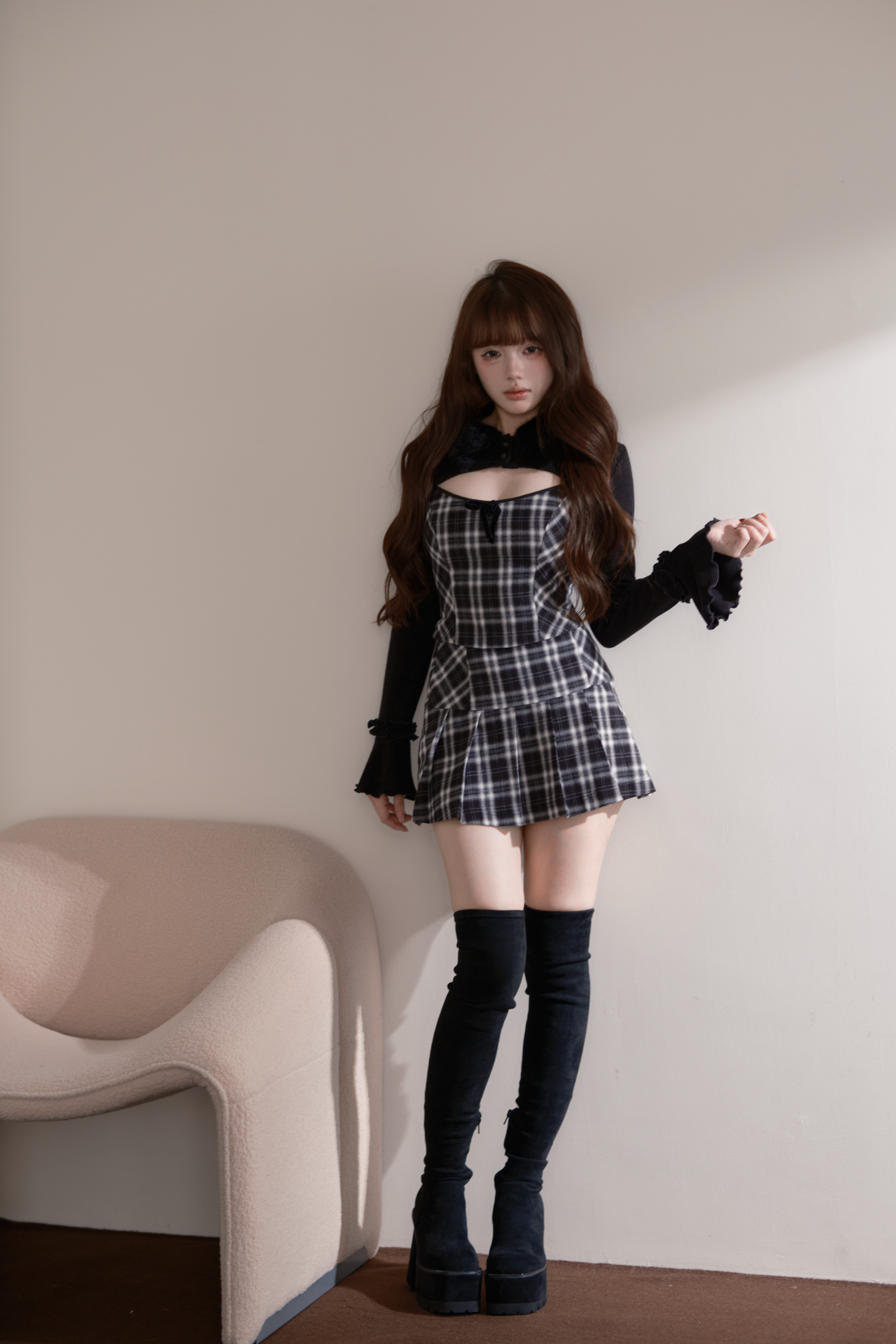 柔らかなフェイクファーをあしらったショートトップ、上品なチェック柄のビスチェ、プリーツ入りのミニスカートが揃った3点セット。