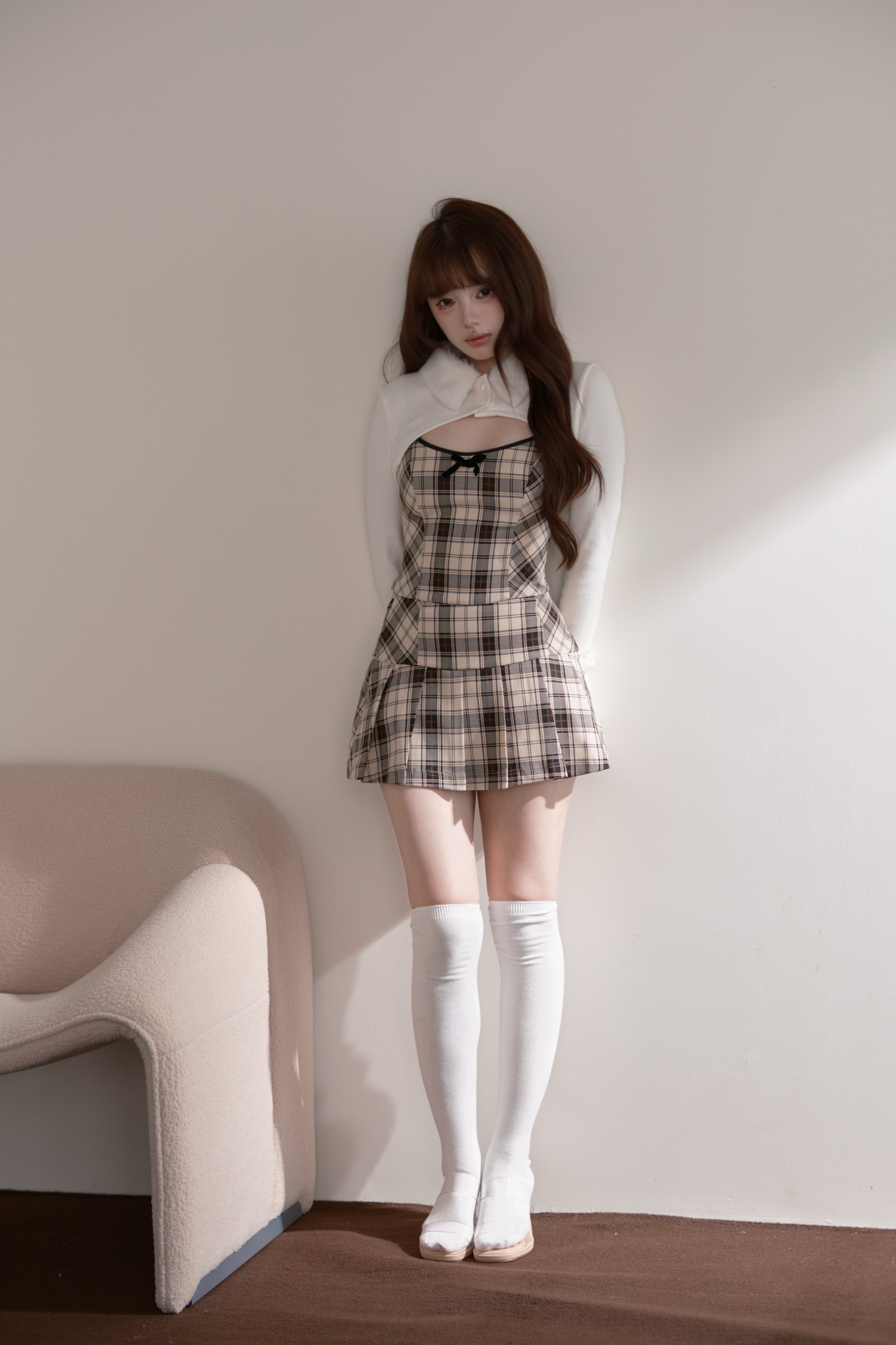 ファーカラーショートニット+チェックビスチェ+プリーツミニスカート