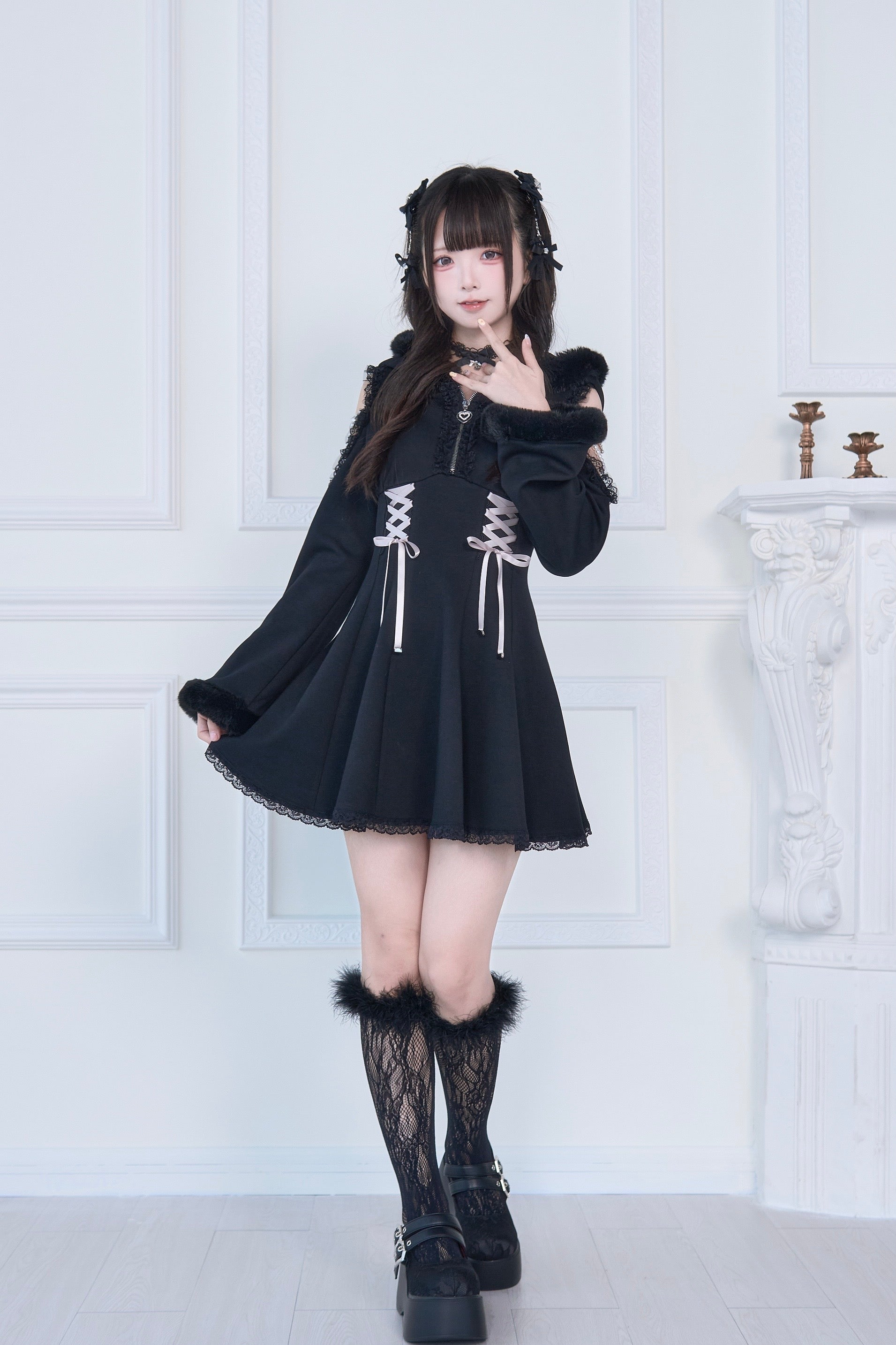 肩開きデザインとコルセット風のレースアップが地雷系らしい可愛さを引き立てます。