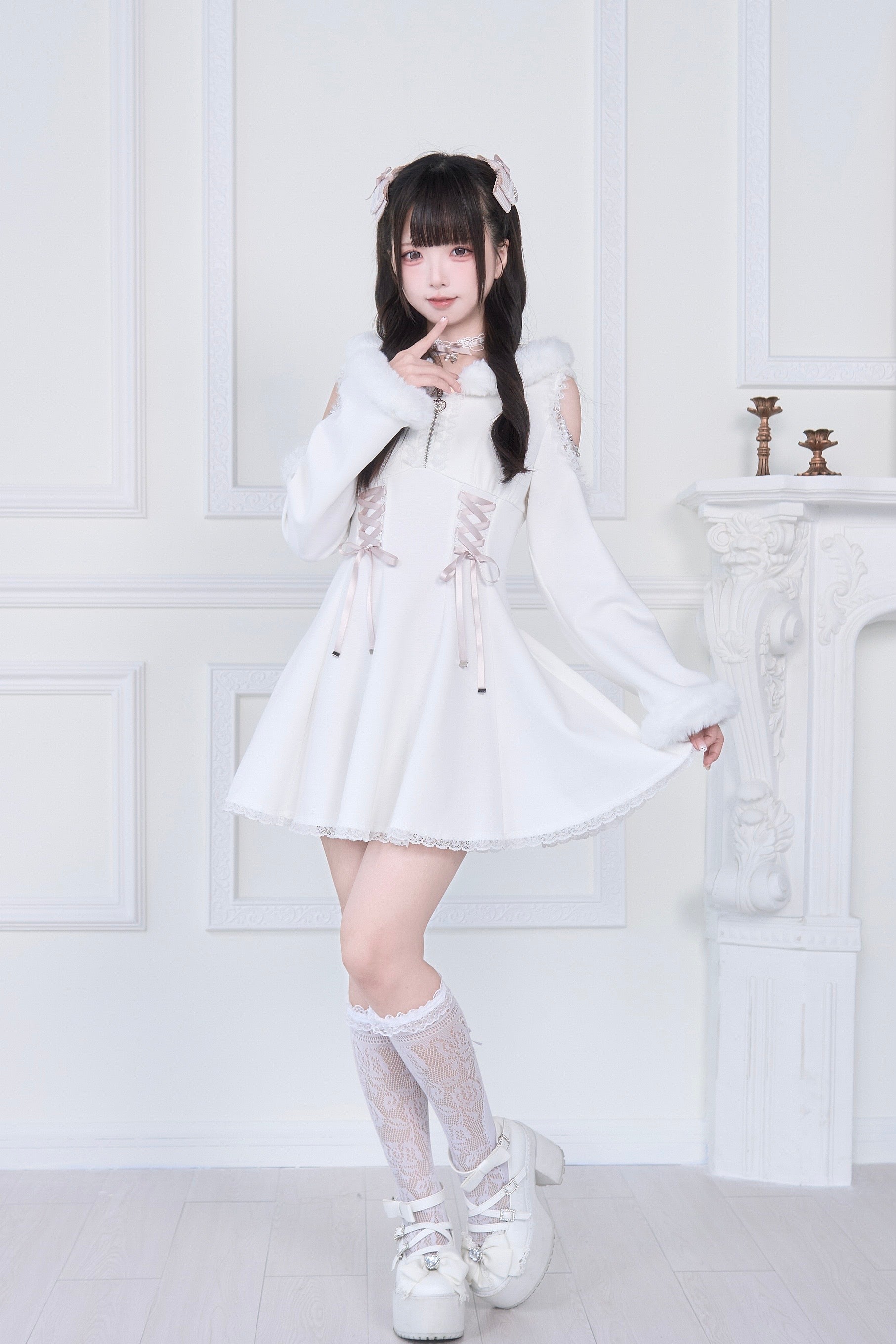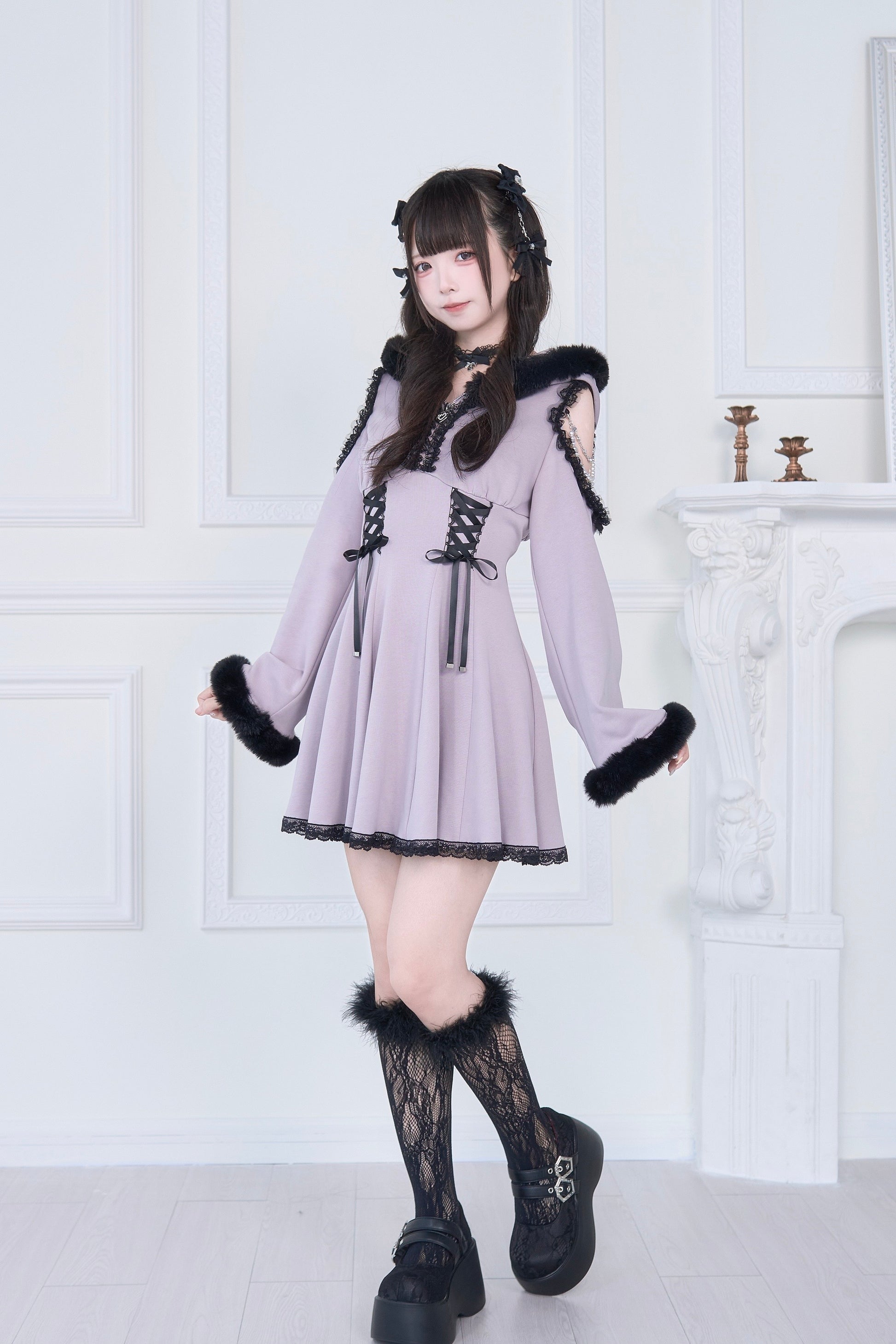 ふんわりとしたフェイクファーをあしらったフード付きワンピース。