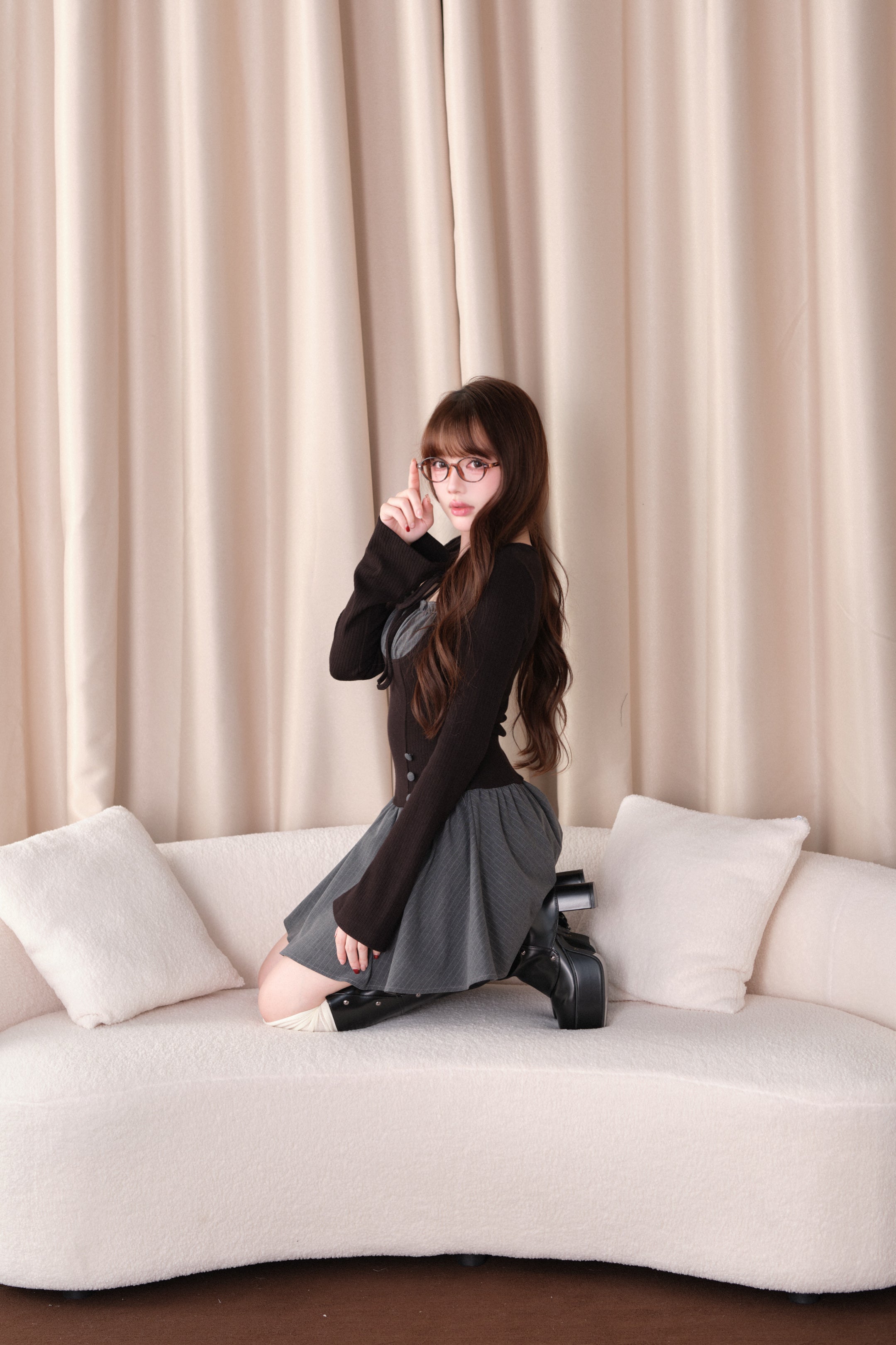 胸元にはシアー素材を切り替えであしらい、さりげない抜け感と女性らしさをプラス。小さなリボンディテールがアクセントになり、上品な甘さを演出します。