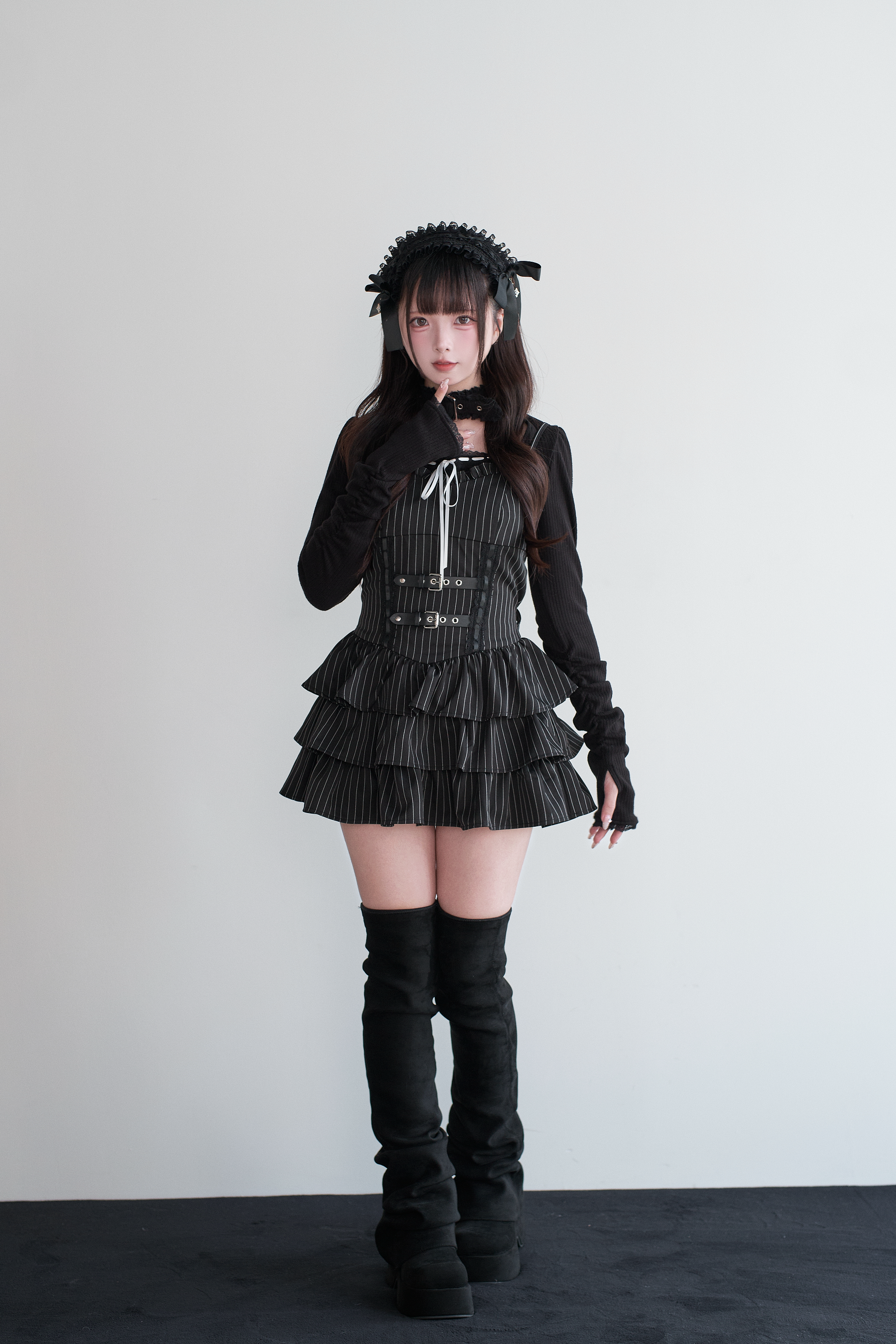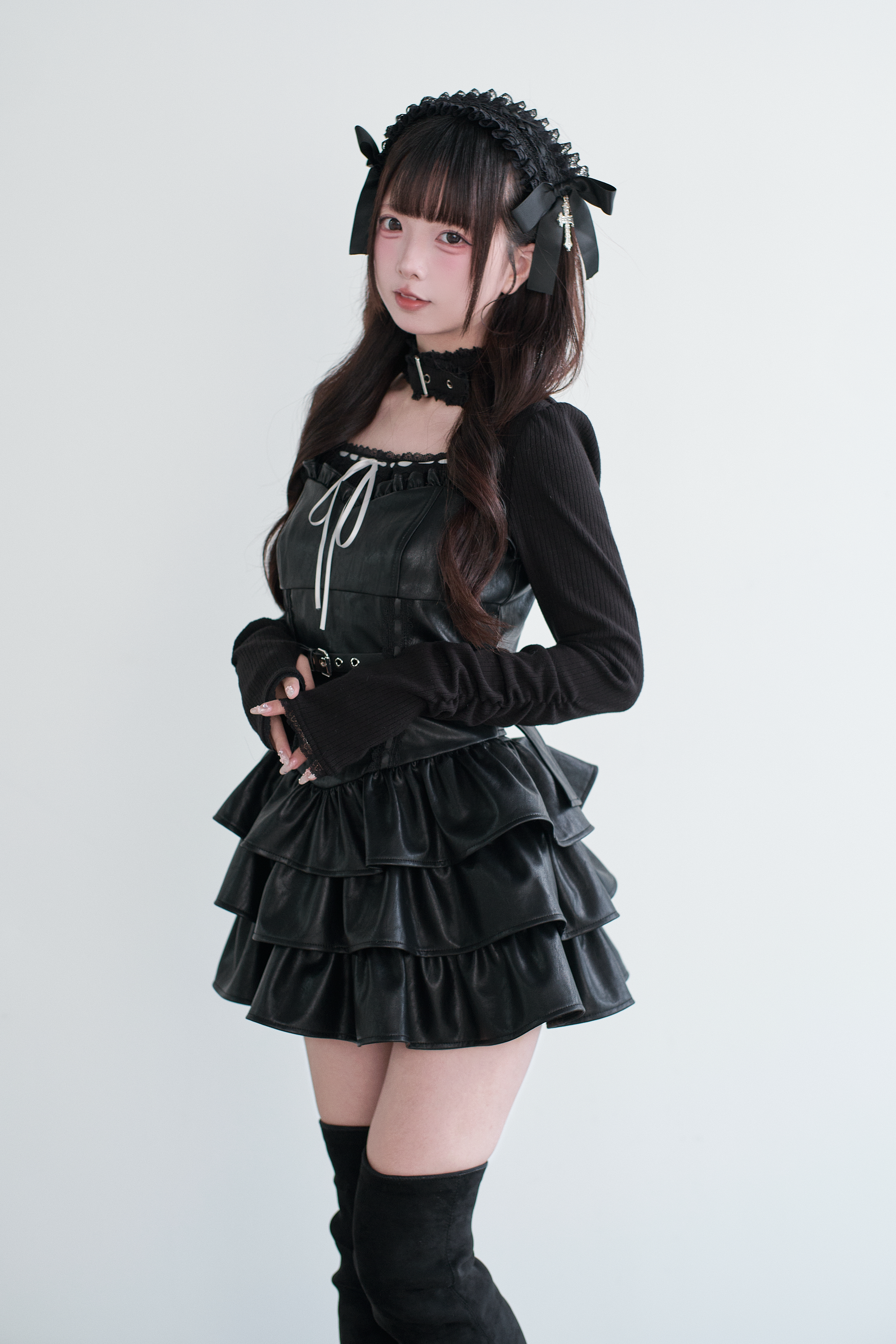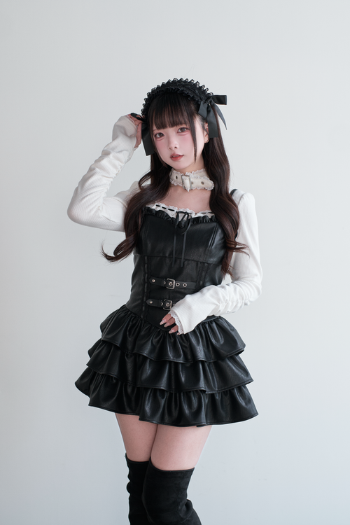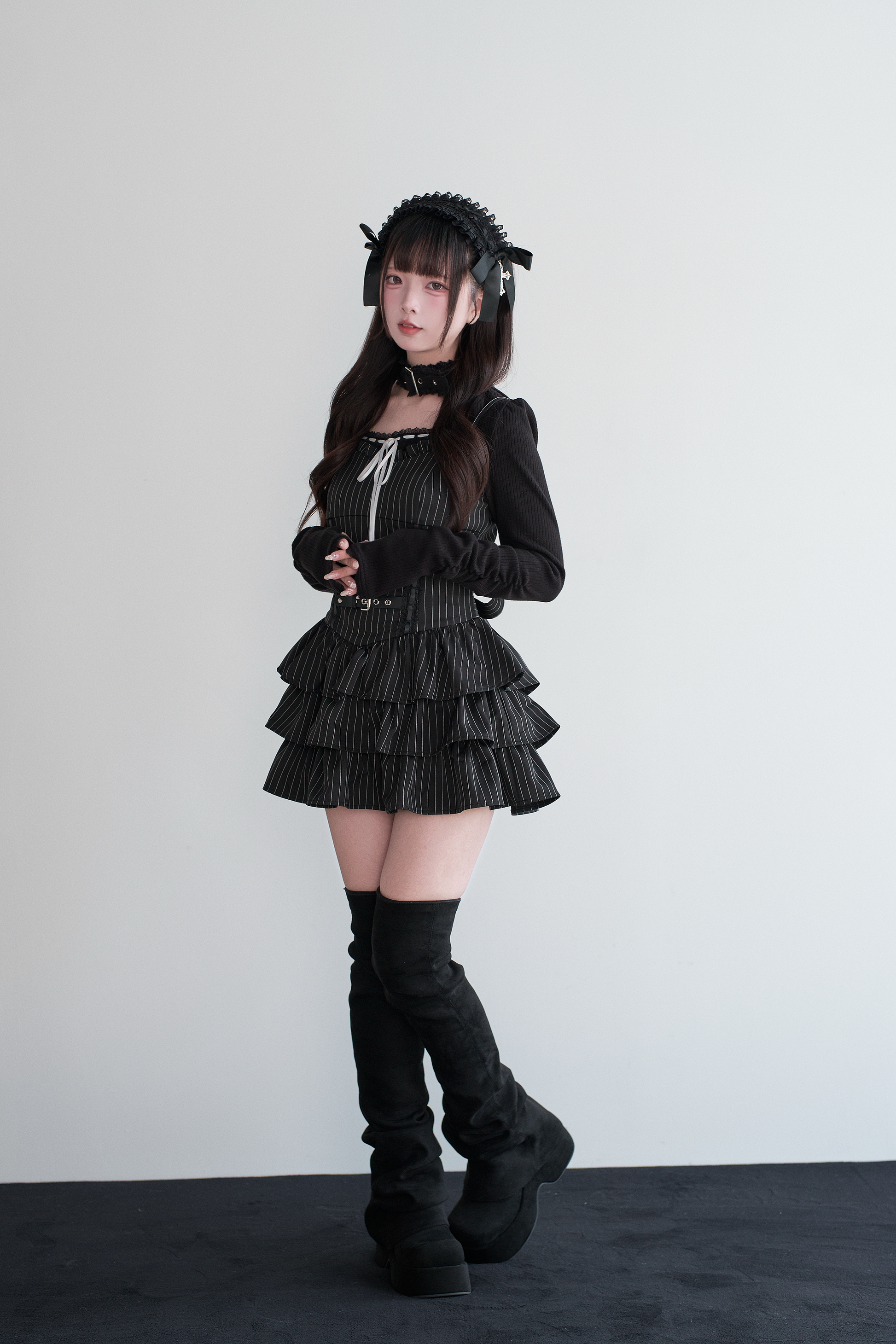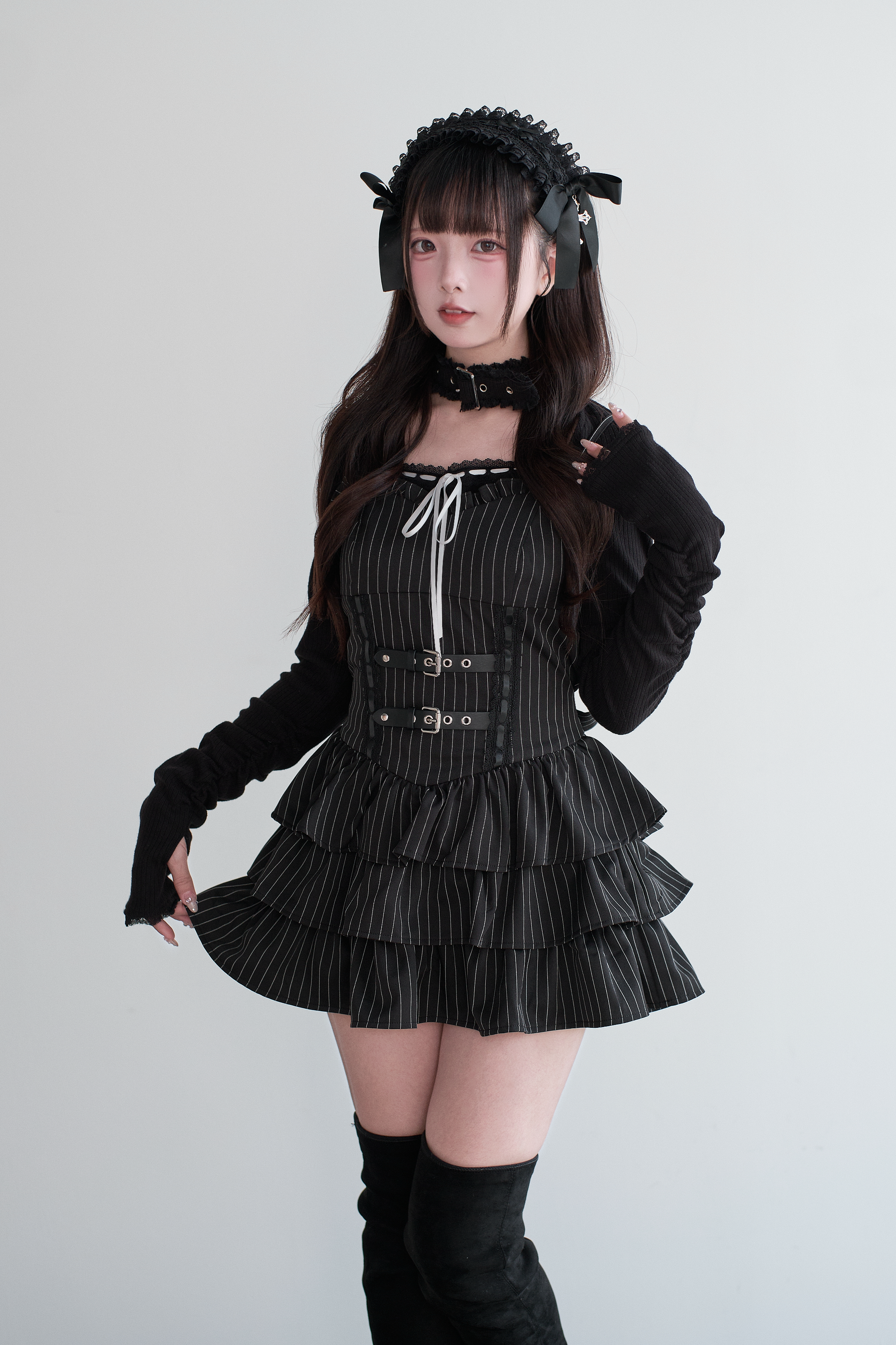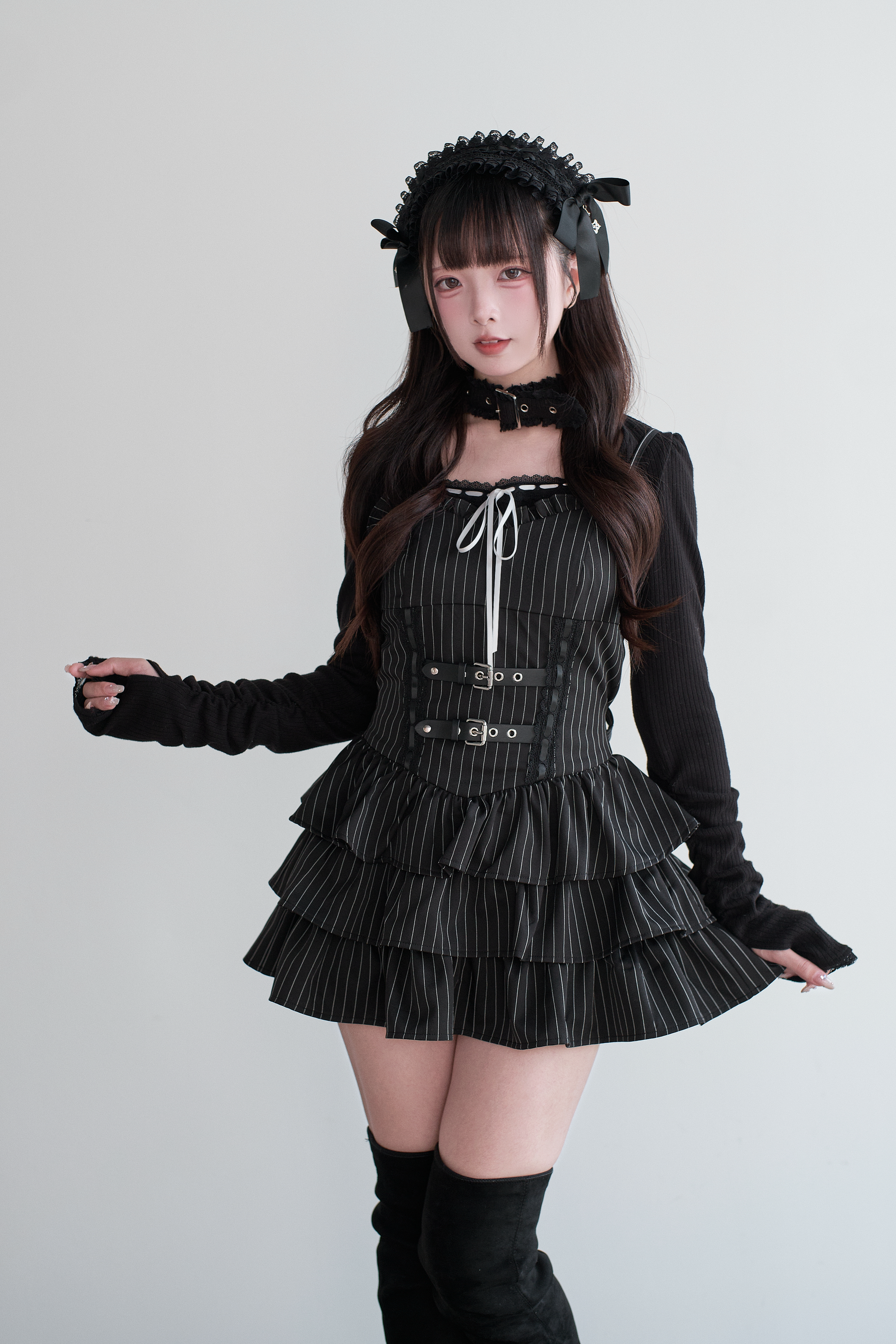 ウエストラインをきれいに見せるカッティングと、動くたびに揺れる3段フリルのスカートで、甘さとクールさを両立した NoGenki らしいデザインです。
