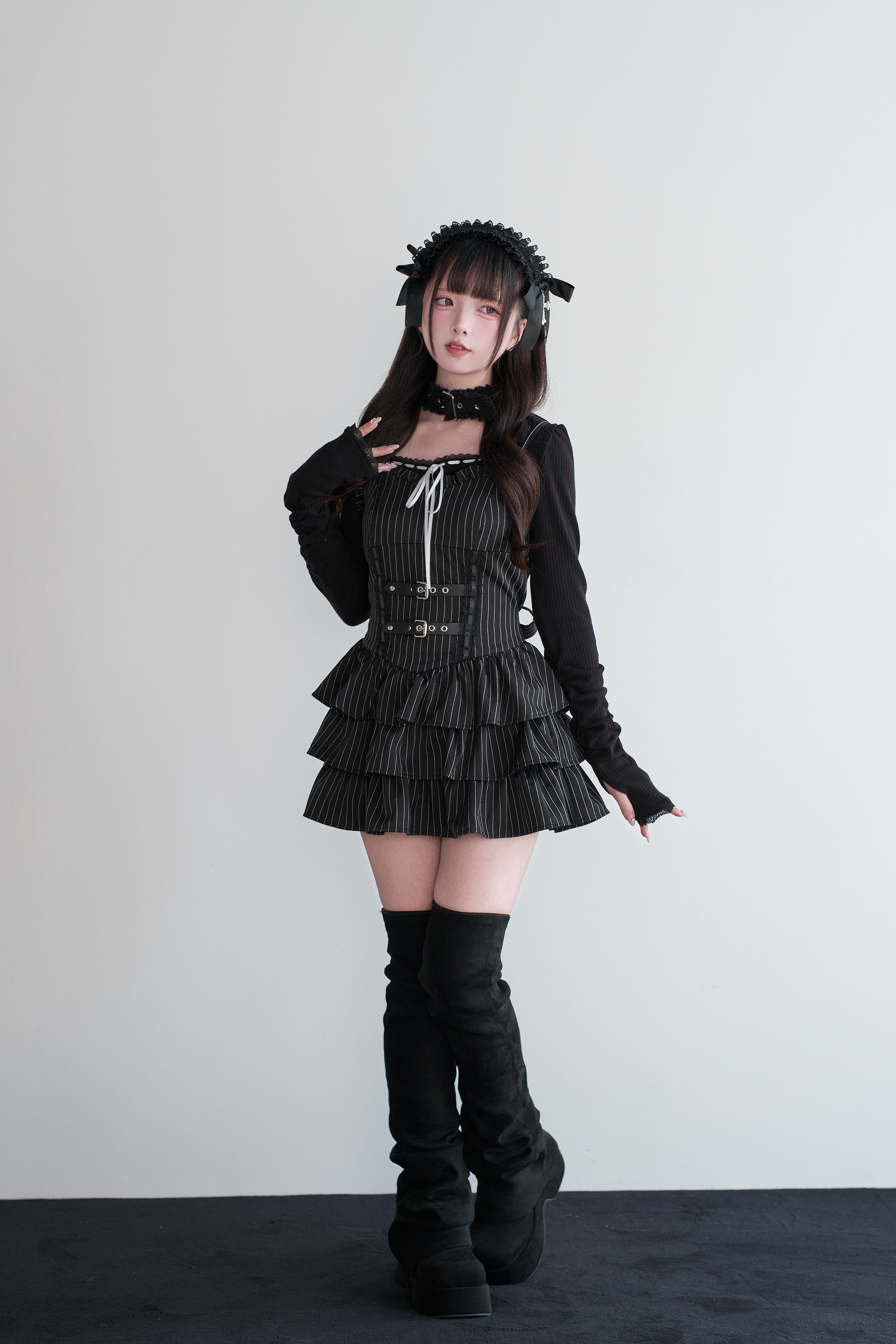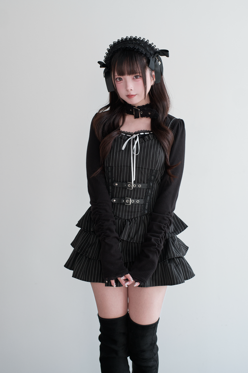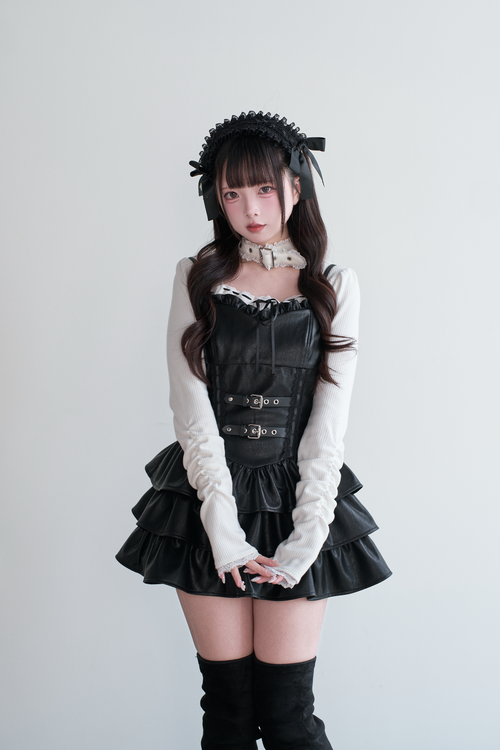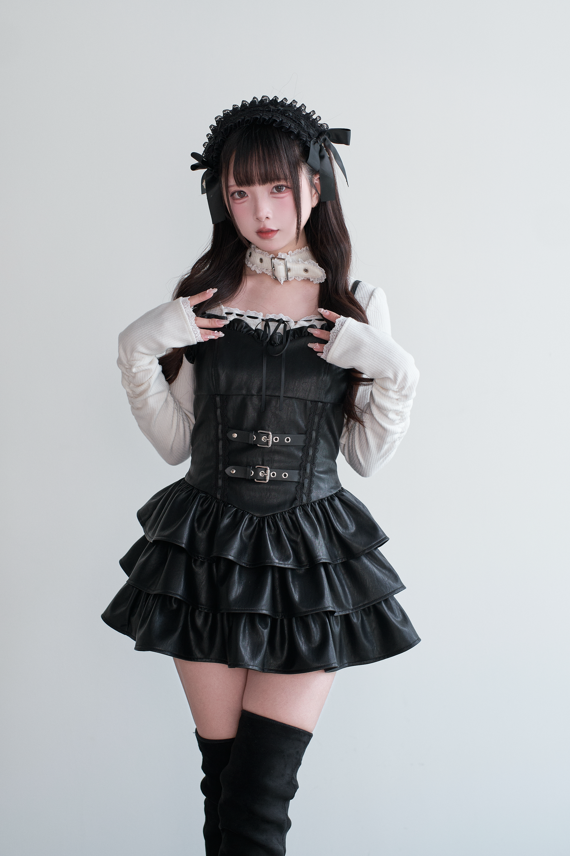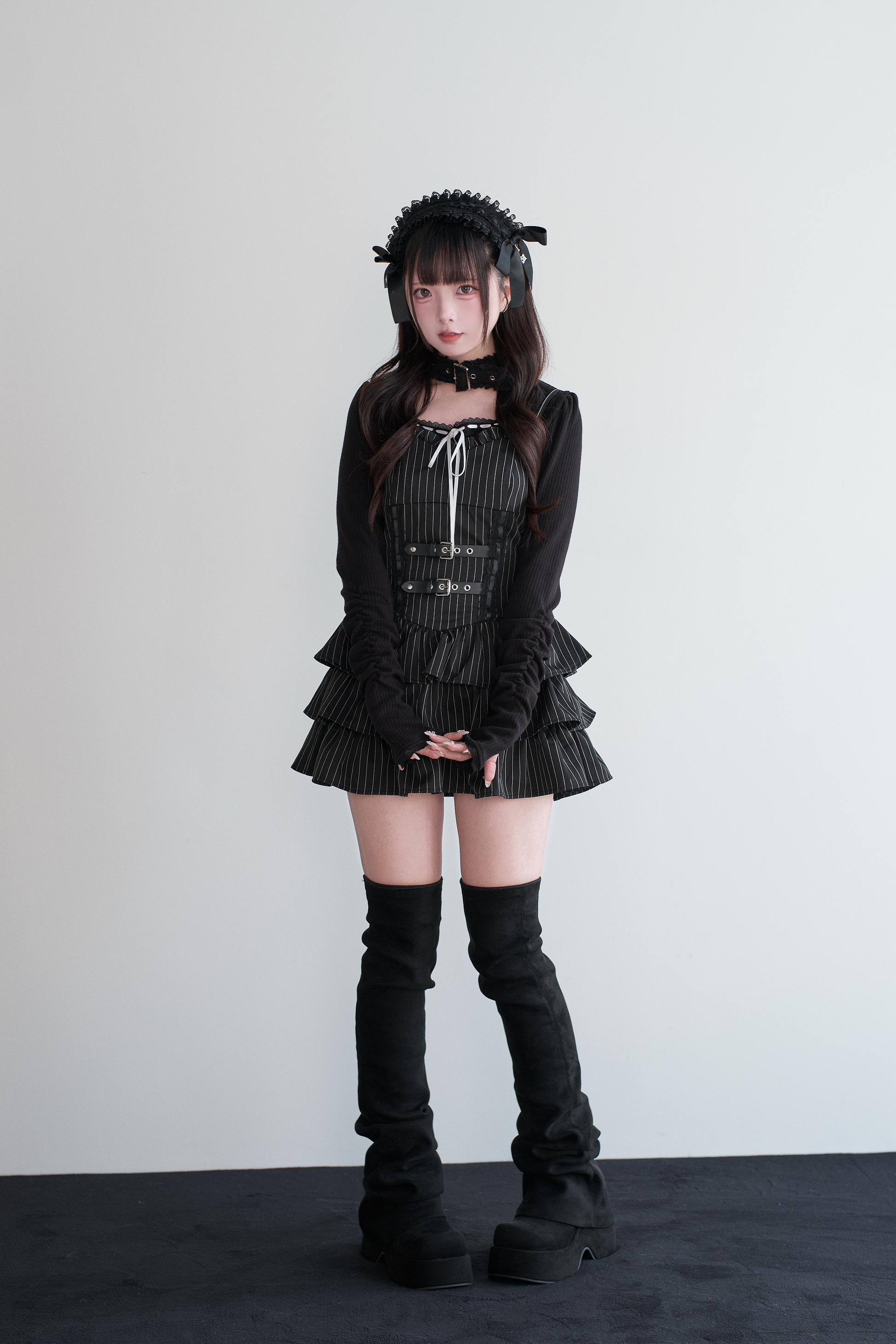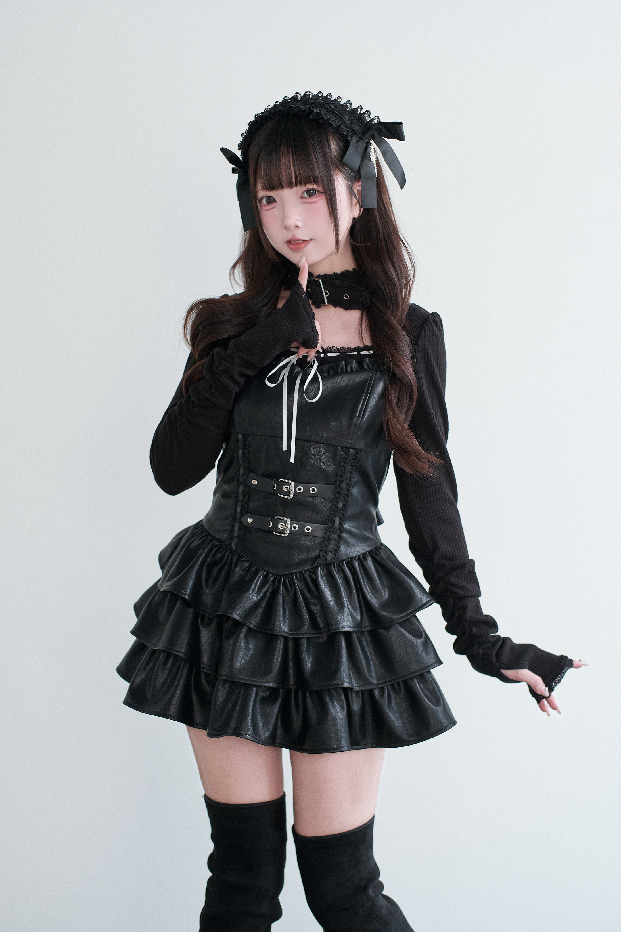 ウエストラインをきれいに見せるカッティングと、動くたびに揺れる3段フリルのスカートで、甘さとクールさを両立した NoGenki らしいデザインです。