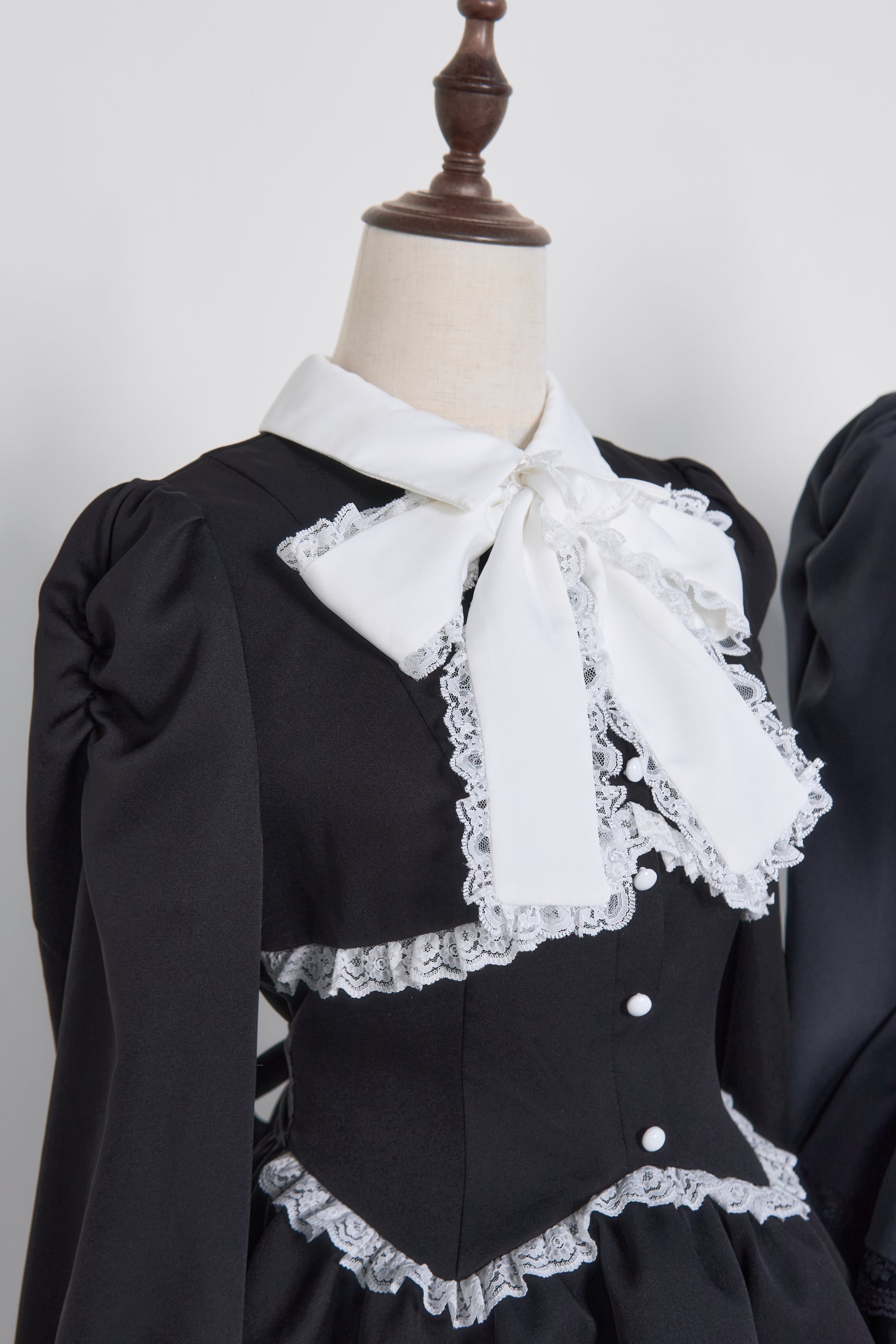 大きめのボウタイは取り外し可能なので、気分やコーデに合わせて甘さを調整可能。襟・裾に施した繊細なレーストリムが上品なアクセントに。